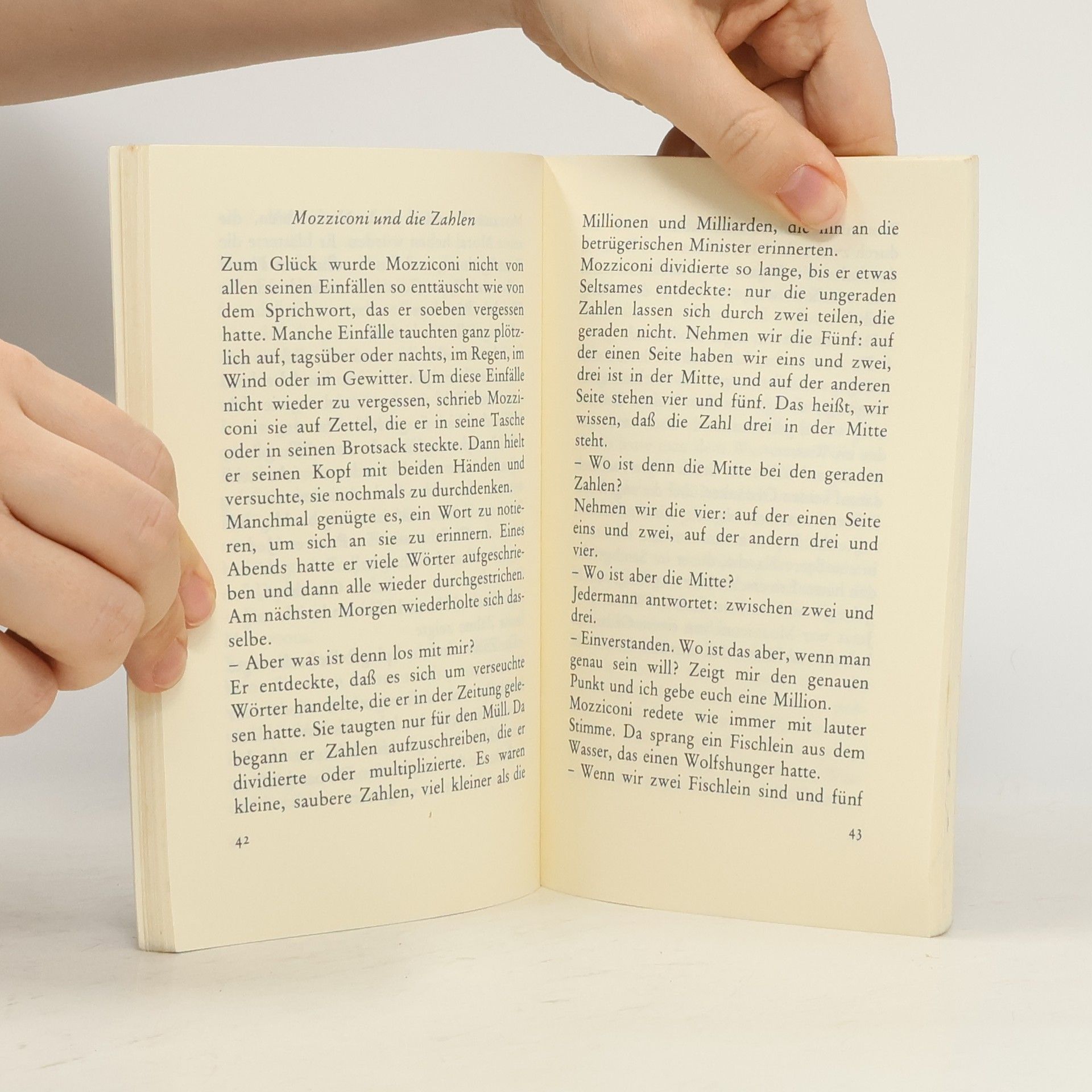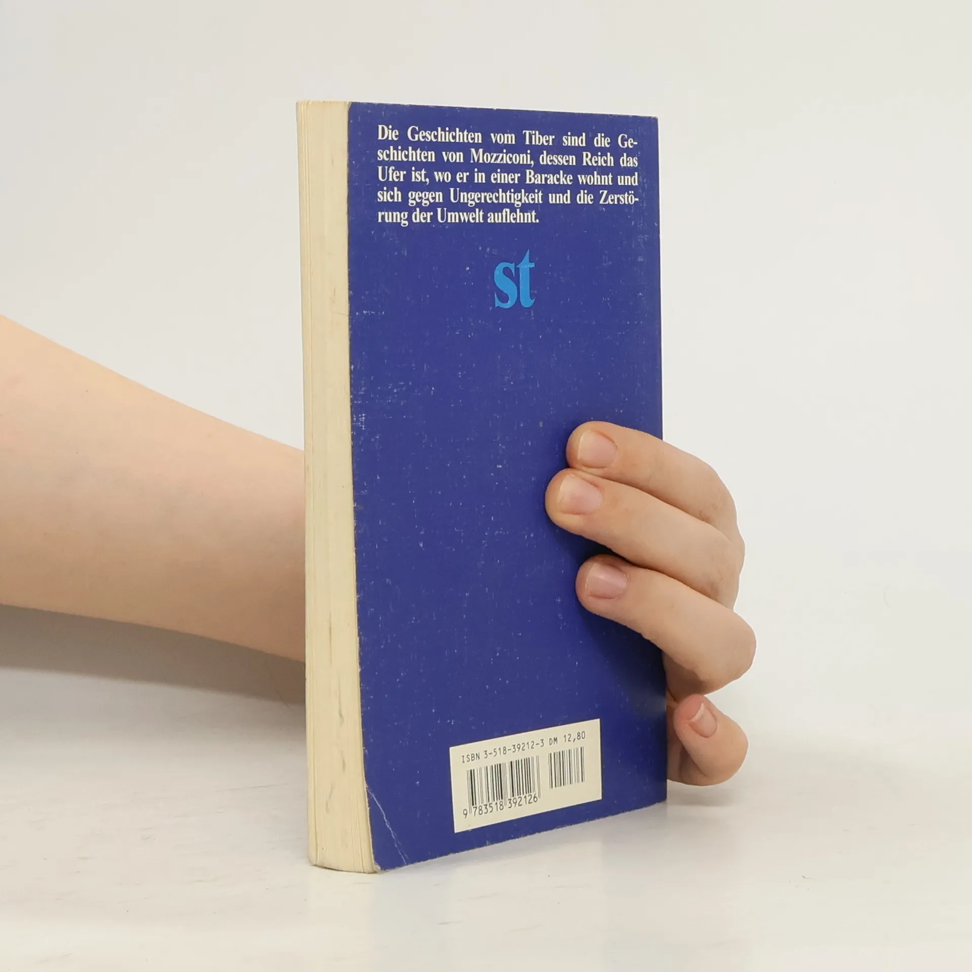 Die Geschichten vom Ufer des Tibers, sind die Geschichten von Mozziconi, dessen Reich das Ufer des Tibers ist. , Hier will ich mich ausruhn, , sagt Mozziconi, , und endlich einmal an nichts denken., Es versteht sich, daß auch an nichts denken eine Art von Denken ist, die anstrengt, und schon denkt Mozziconi nach. Mozziconi, der Philosoph, ist das Gegengewicht zur Betriebsamkeit und Zerstörungswut dieser Welt. Doch gelassen ist er nicht. Er ist aufbrausend, wenn es um Betrug, Geldgier, Erdöl geht. Und wenn er wider Willen denken muß, kann es geschehen, daß er vor Zorn seinen Hut in den Fluten des Tibers versenkt.