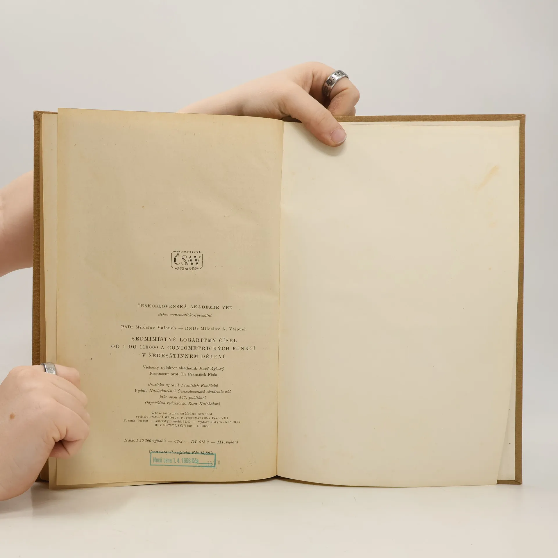 Sedmimístné logaritmy - od 1 do 110 000 a goniometrických funkcí v šedesátinném dělení, M. A. Valouch