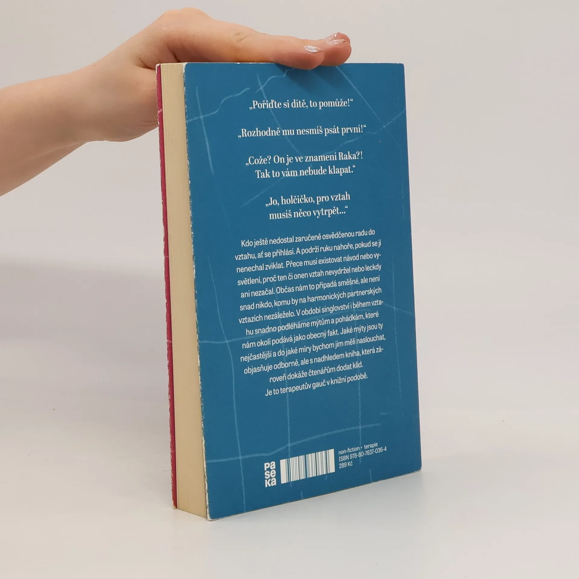 "Pořiďte si dítě, to pomůže!" "Rozhodně mu nesmíš psát první!" "Cože? On je ve znamení Raka?! Tak to vám nebude klapat. "Jo, holčičko, pro vztah musíš něco vytrpět..." Kdo ještě nedostal zaručeně osvědčenou radu do vztahu, ať se přihlásí. A podrží ruku nahoře, pokud se jí nenechal zviklat. Přece musí existovat návod nebo vysvětlení, proč ten či onen vztah nevydržel nebo leckdy ani nezačal. Občas nám to připadá směšné, ale není snad nikdo, komu by na harmonických partnerských vztazích nezáleželo. V období singlovství i během vztahu snadno podléháme mýtům a pohádkám, které nám okolí podává jako obecný fakt. Jaké mýty jsou ty nejčastější a do jaké míry bychom jim měli naslouchat, objasňuje odborně, ale s nadhledem kniha, která zároveň dokáže čtenářům dodat klid. Je to terapeutův gauč v knižní podobě.
