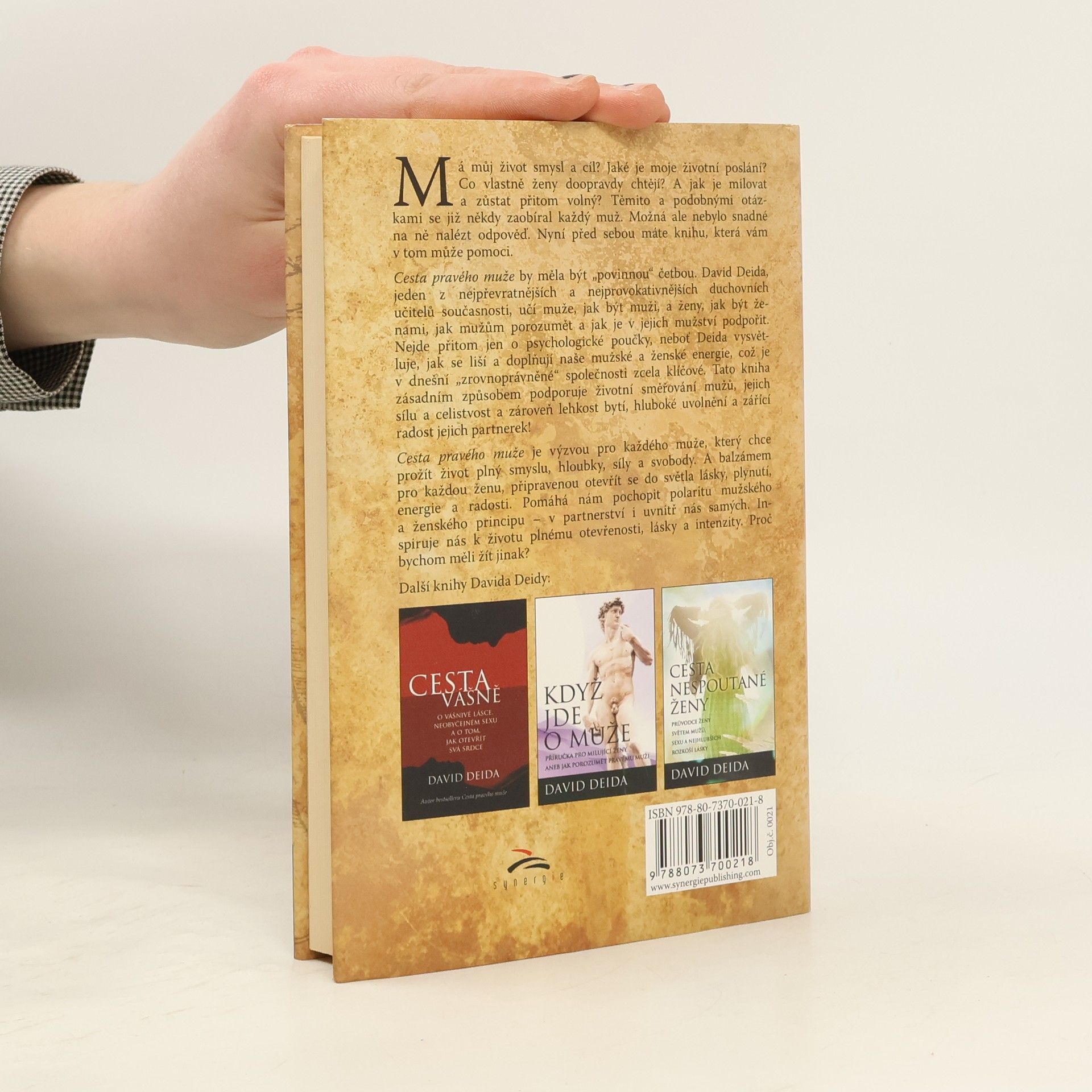 Jaké je vaše nejhlubší životní poslání? Co doopravdy ženy chtějí? Jak se stát skvělým milencem? Pokud čtete tyto otázky a jste muž, určitě jste si již tyto a podobné otázky pokládali. Možná ale nebylo snadné na ně nalézt odpověď. Cesta pravého muže vás zavede do srdce současné mužské zkušenosti. David Deida se zde s pronikavou upřímností a ojedinělým vhledem do nejhlubších mužských tužeb zabývá nejdůležitějšími aspekty života mužů - kariérou a rodinou počínaje a ženami, intimitou, láskou a duchovním růstem konče. Nabízí vám praktickou příručku jak žít Cesta pravého muže by se měla být povinnou "školní" četbou. Deida učí muže, jak být muži, a ženy, jak být ženami. Jak se navzájem obdarovat tím, čím jsme jedineční, a porozumět tomu, kde jsme odlišní. Nejde přitom jen o psychologické poučky - Deida vysvětluje, jak se liší a doplňují naše mužské a ženské energie, což je v dnešní "zrovnoprávněné" společnosti zcela klíčové. Tato kniha zásadním způsobem podporuje životní směřování mužů, jejich sílu a celistvost, a zároveň lehkost bytí, hluboké uvolnění a zářící radost jejich partnerek!