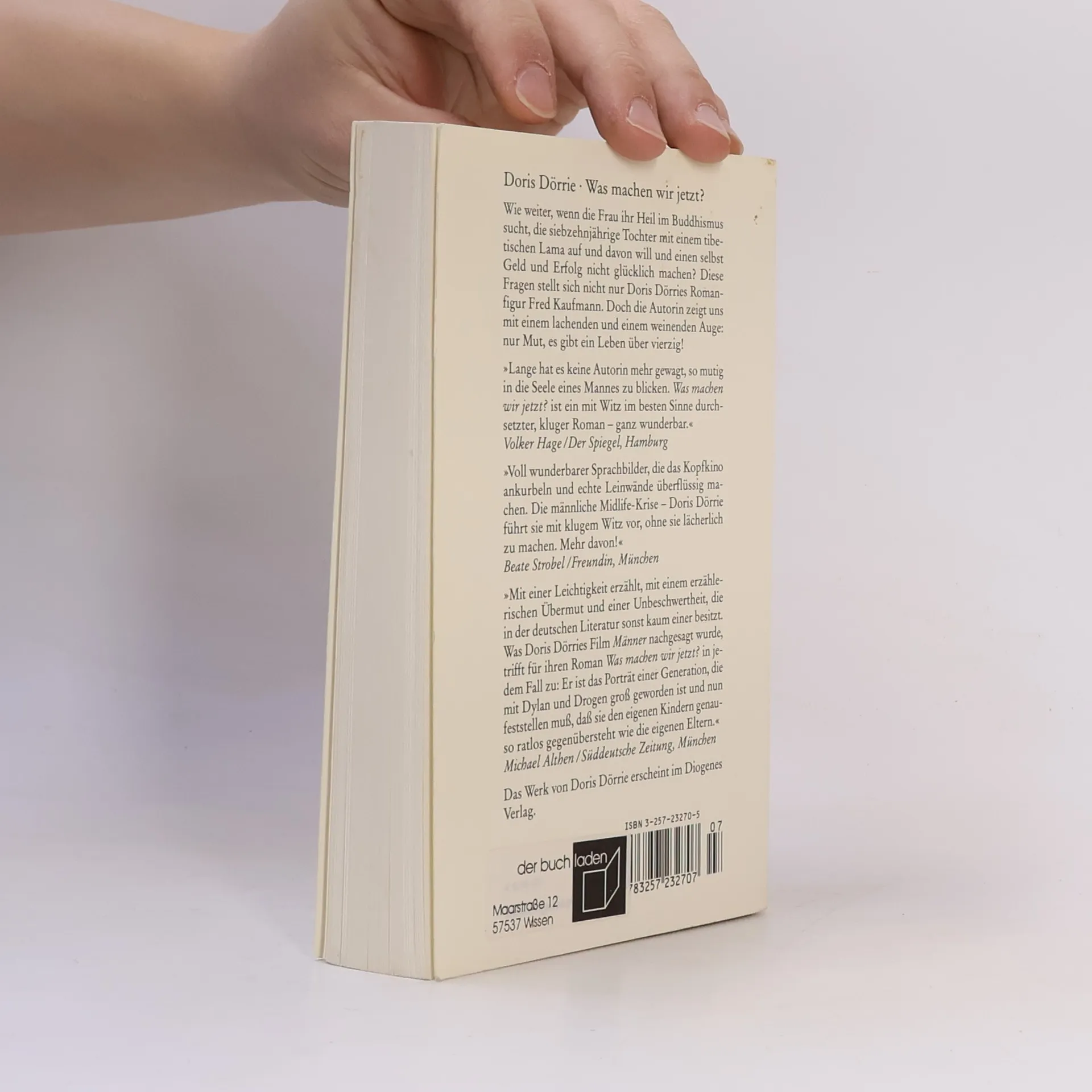 Wie weiter, wenn die Frau ihr Heil im Buddhismus sucht, die siebzehnjährige Tochter mit einem tibetischen Lama auf und davon will und einen selbst Geld und Erfolg nicht glücklich machen? Diese Fragen stellt sich nicht nur Doris Dörries Romanfigur Fred Kaufmann. Doch die Autorin zeigt uns mit einem lachenden und einem weinenden Auge: Nur Mut, es gibt ein Leben über vierzig! "