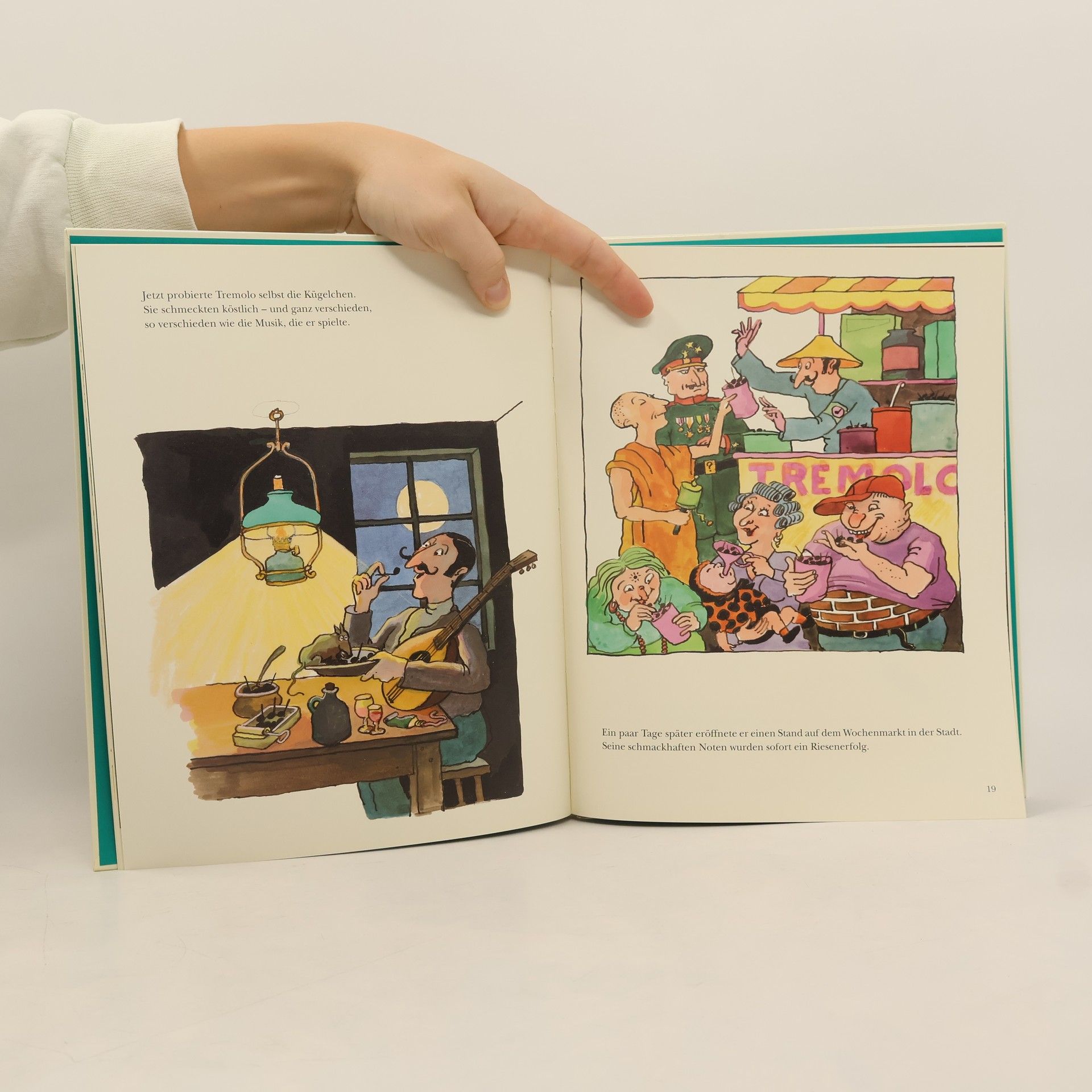 „Ein Bilderbuch über Musik, Musiker und Vermarktung. Ein Zaubertrick läßt den Musiker Tremolo eßbare Notenkügelchen spielen. Kiloweise, Zentnerweise. Schnell begreift er, daß sich mit den schmackhaften Noten Geld machen läßt. Zunächst verkauft er sie als Fast food auf dem Wochenmarkt. Dann experimentiert er. Blasmusik schmeckt kräftig. Violine eher süßlich. Tremolo wird ein Medienstar.“