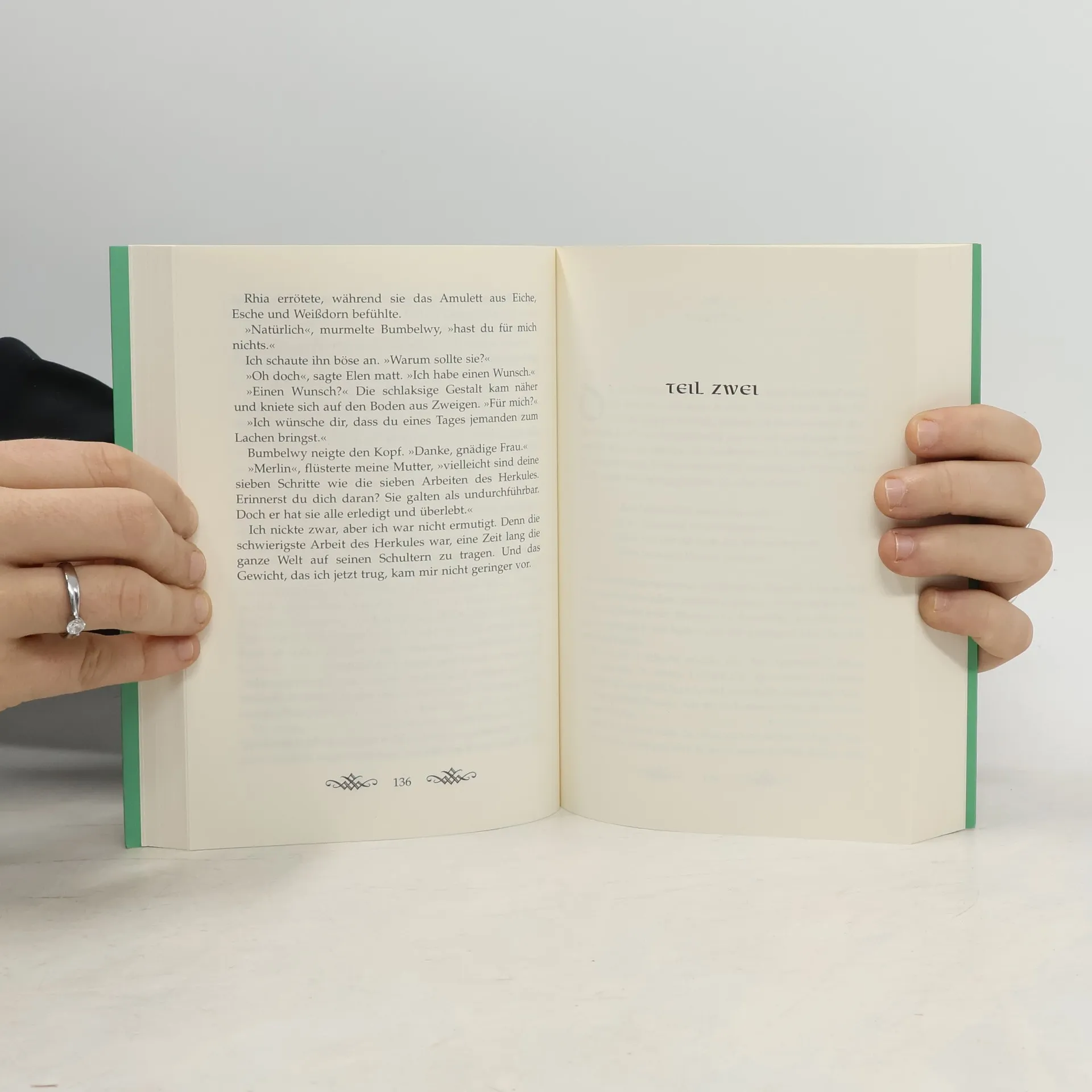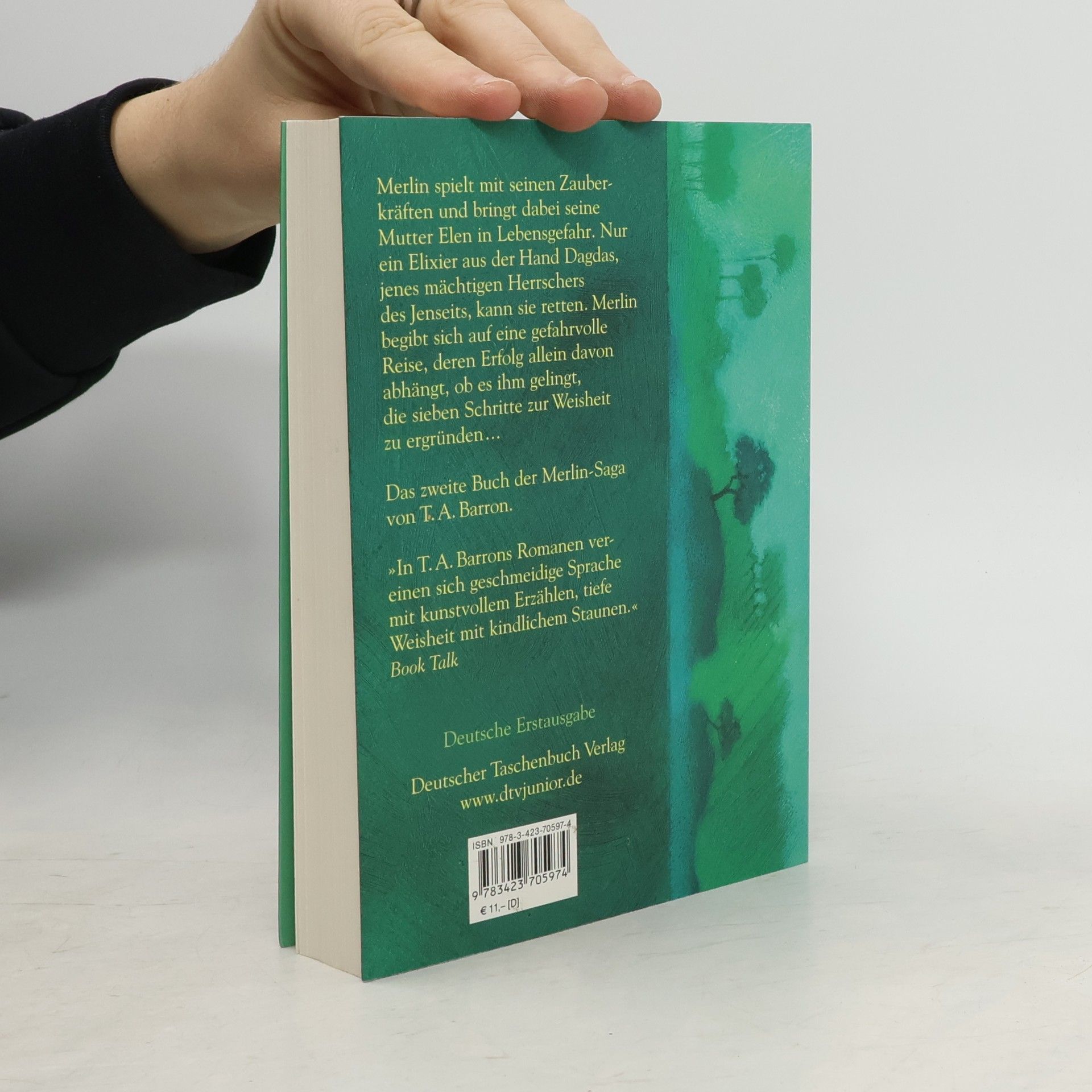Auf Fincayra, der fantastischen Insel irgendwo zwischen den Welten, fühlt Merlin seine magischen Kräfte wachsen. Das macht ihn stolz, aber auch hochmütig – und einsam. Schließlich wagt er den Zauber, seine Mutter zu sich auf die Insel zu holen. Doch kaum angekommen, wird sie von Merlins ärgstem Feind vergiftet. Retten kann sie jetzt nur noch Dagdas lebensspendendes Elexier. Merlin weiß, dass er Dagdas Heimat nur betreten darf, wenn er zuvor die sieben Schritte zur Weisheit ergründet hat. Vor ihm liegt eine weite und gefährliche Reise durch das ganze Land - und die Zeit drängt. Dennoch will er wagen, was einst seinem Großvater, Fincayras größtem Weisen, das Leben gekostet hatte... Das 2. Buch der Merlin-Saga von T. A. Barron Deutsche Erstausgabe Die Merlin-Welt des Autors T. A. Barron könnt ihr übrigens auch auf dessen homepage www. tabarron. com kennen lernen.