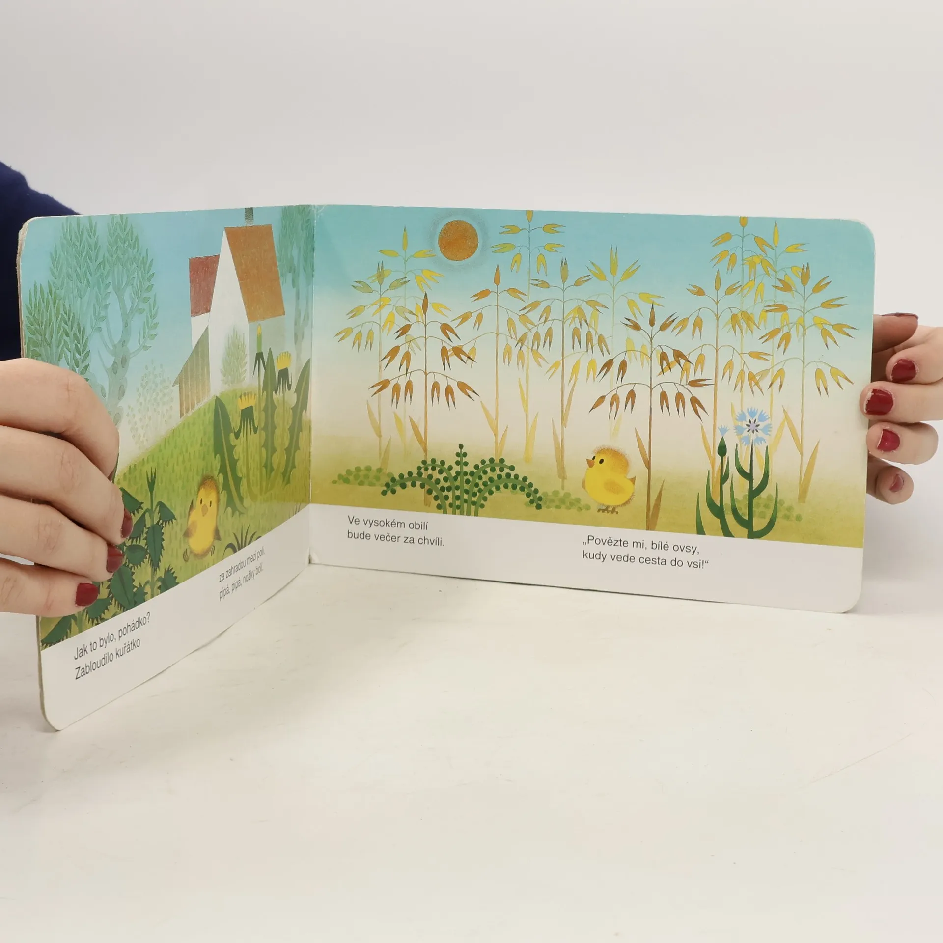 Krátká veršovaná pohádka s barevnými obrázky o malém kuřátku, které se ztratilo v poli a vyptává se obilí na cestu domů. - Pohádka učí nejmenší děti rozeznávat různé druhy obilí.