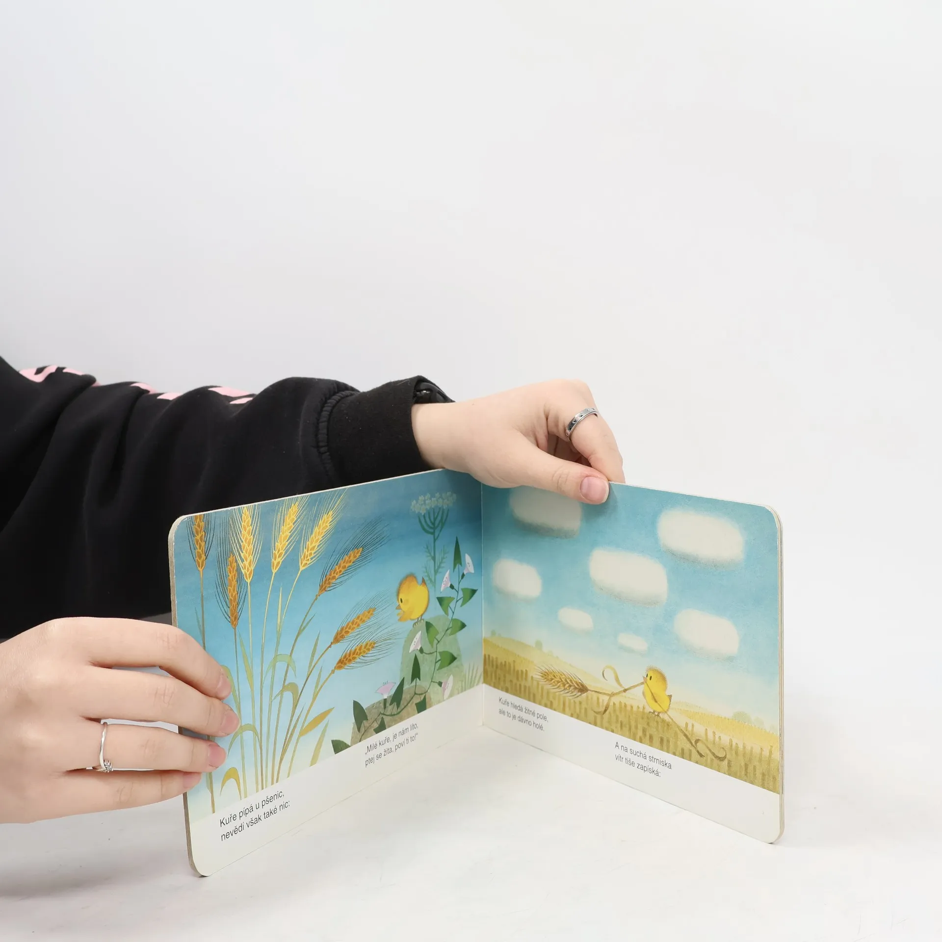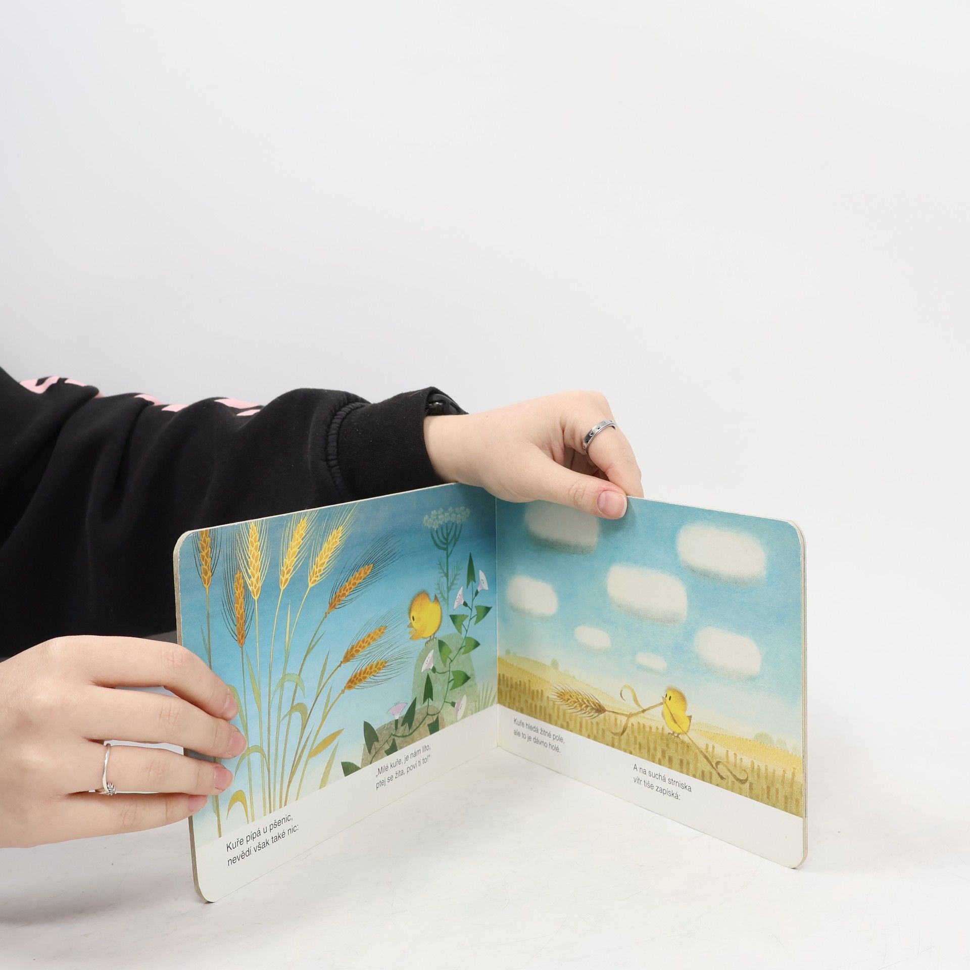 Krátká veršovaná pohádka s barevnými obrázky o malém kuřátku, které se ztratilo v poli a vyptává se obilí na cestu domů. - Pohádka učí nejmenší děti rozeznávat různé druhy obilí.