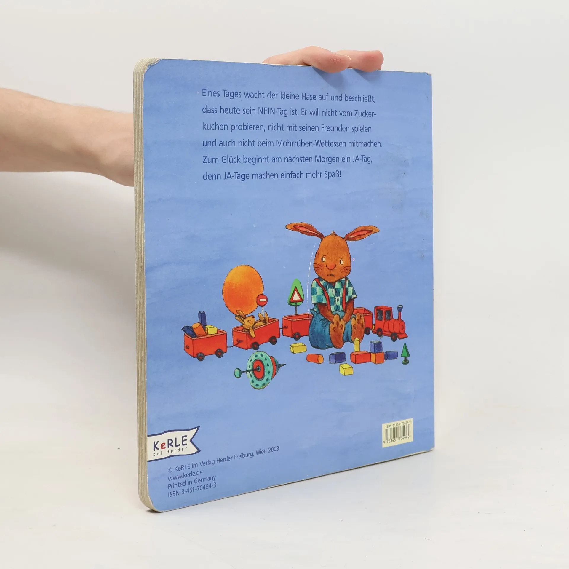 Der kleine Hase ist heute schlecht gelaunt: er beschliesst, dass heute sein NEIN-Tag ist. Grimmig bleibt er in der Ecke stehen, als die anderen Hasenkinder spielen, essen oder aufs Feld gehen. Wie gut, dass der nächte Tag wieder ein JA-Tag ist!