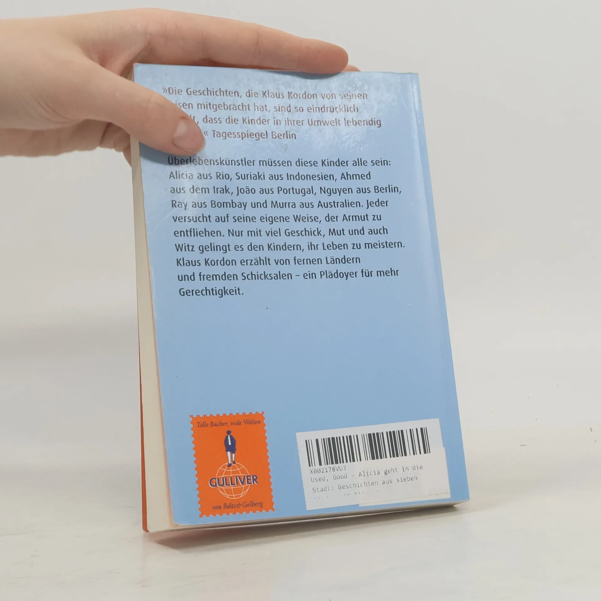 Sieben Geschichten aus sieben Ländern - ein Plädoyer für mehr Gerechtigkeit.Jeden Tag sitzt Alicia auf der Autobahnbrücke und schaut auf die Wagen, die in die City von Rio fahren. Rauszukommen aus dem Vorstadt-Slum, das ist ihre größte Sehnsucht. Eines Tages ergreift sie ihre einzige Chance, auch wenn sie dafür vielleicht teuer wird bezahlen müssen.Klaus Kordon erzählt von fernen Ländern und fremden Schicksalen. Aber sie sind uns nah: die fast blinde Surlaki aus Indonesien, Ahmed aus dem Irak, Joao aus Portugal und Murra, der in Australien lebt. Es sind Geschichten über Kinder, die mit Mut und Witz, zwischen Hoffnung und Verzweiflung ihren täglichen Kampf ums Überleben führen.