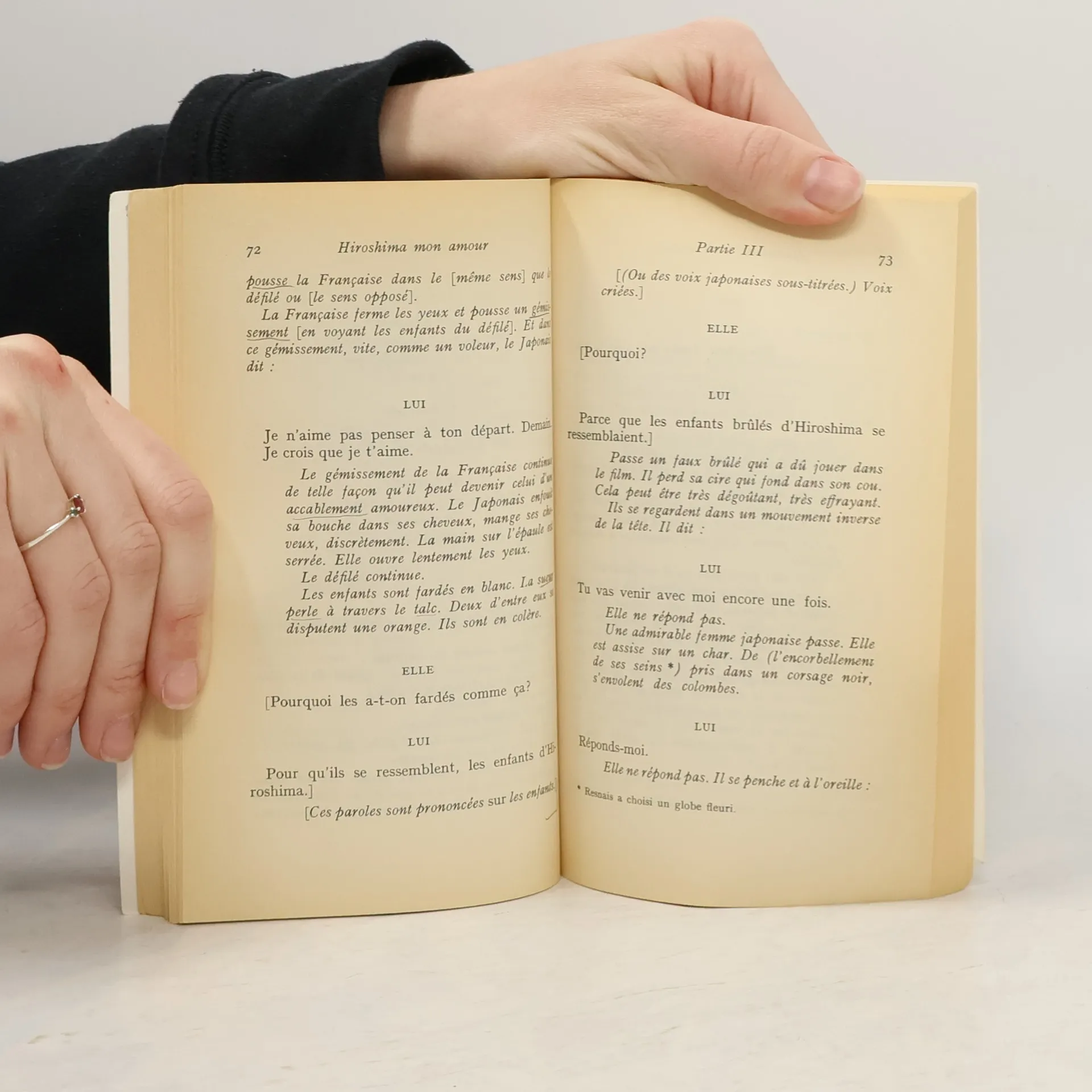 Au cours du tournage d'une coproduction sur la paix, une comédienne française noue une relation éphémère mais passionnée avec un Japonais. Sur cette mince intrigue, Duras est chargée par Alain Resnais d'élaborer le scénario et les dialogues d'un film, Hiroshima mon amour, titre étrange et poétique malgré la référence évidente aux atrocités de la guerre. Avec un art de l'ellipse parfaitement maîtrisé, Duras orchestre une danse sensuelle entre deux personnages qui luttent contre le temps. Lui refuse d'admettre que les atrocités d'Hiroshima ont eu lieu, Elle se tait sur son passé ; pourtant, ces fantômes ressurgissent en fragments, lambeaux d'un passé qui se superposent au moment présent. Les corps des amants se confondent peu à peu et Hiroshima se fond dans Nevers, cadre de la jeunesse de l'actrice marquée par l'opprobre parce qu'elle a aimé un jeune Allemand durant la guerre. Les gros plans sur les corps amoureux sont entrecoupés de scènes de foule et de détails d'une crudité sordide, comme si l'horreur devait, elle aussi et malgré tous les films sur la paix, lutter contre le déni pour se faire entendre. --Sana Tang-Léopold Wauters