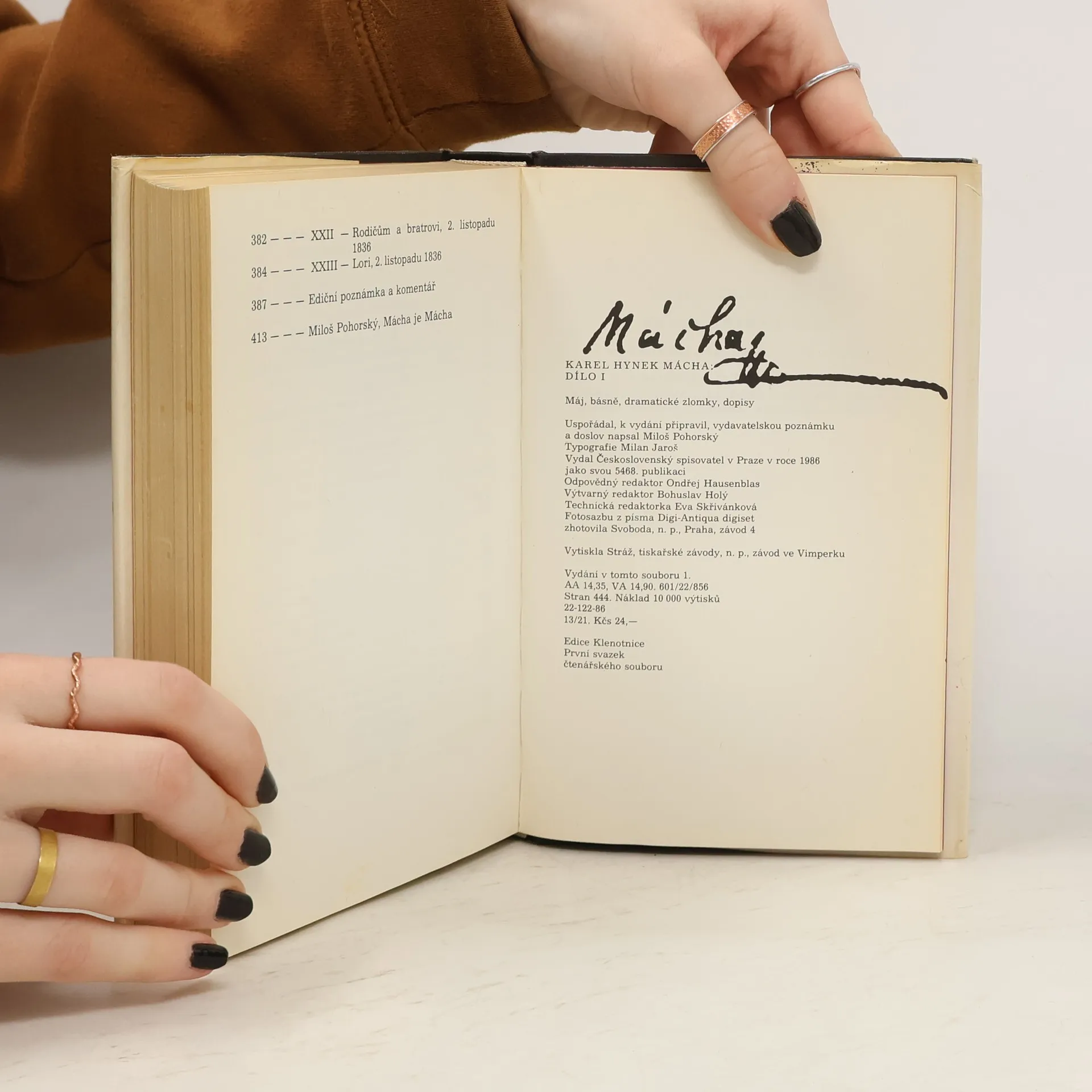 Čtenářské vydání Díla Karla Hynka Máchy vychází v roce, kdy uplynulo 150 let od smrti autora. První svazek obsahuje Máj, básně německé s českými překlady, všechny básně české, mj. znělky i ohlasy národních písní, včetně variant a zlomků, dále zlomky dramat a sedmadvacet Máchových dopisů. Svazek je uzavřen doslovem, který objasňuje principy Máchovy literární tvorby, vznik Máje i celou problematiku Máchova romantického postoje.