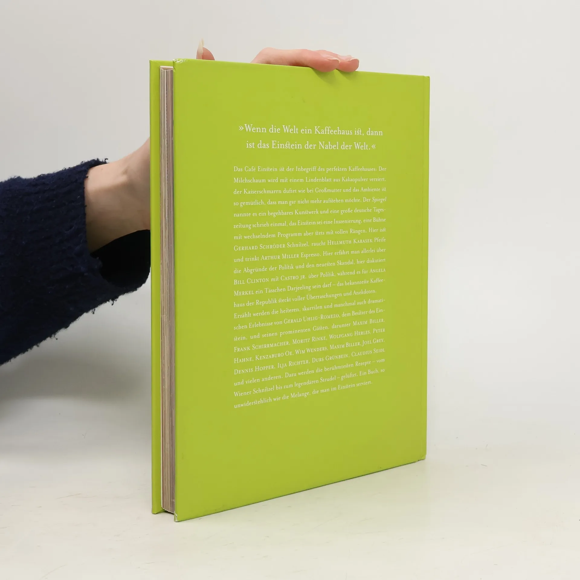Das Café Einstein ist der Inbegriff des perfekten Kaffeehauses. Der Milchschaum wird mit einem Lindenblatt aus Kakaopulver verziert, der Kaiserschmarrn duftet wie bei Großmutter und das Ambiente ist so gemütlich, dass man gar nicht mehr aufstehen möchte. Der Spiegel nannte es gar 'ein begehbares Kunstwerk' und eine große deutsche Tageszeitung schrieb einmal, das Einstein sei eine Inszenierung, eine Bühne mit wechselndem Programm, aber stets mit vollen Rängen. Hier isst Gerhard Schröder Schnitzel, raucht Helmut Karasek Pfeife und trinkt Arthur Miller Espresso. Hier erfährt man allerlei über die Abgründe der Politik und den neuesten Skandal, hier diskutiert Clinton mit Castro Jr. über Politik, während es für Angela Merkel ein Tässchen Darjeeling sein darf - das bekannteste Kaffeehaus der Republik steckt voller Überraschungen und Anekdoten. Erzählt werden die heiteren, skurrilen und manchmal auch dramatischen Erlebnisse vom Besitzer des Einstein und seinen prominenten Gästen, darunter Frank Schirrmacher, Wolfgang Herles, Literaturnobelpreisträger Kenzaburo Oe, Wim Wenders, Maxim Biller, Moritz Rinke, Oscarpreisträger Joel Grey und Dennis Hopper. Dazu werden die berühmtesten Rezepte - vom Wiener Schnitzel bis zum Strudel gelüftet. Kurz: so unwiderstehlich wie die Melange, die man dort serviert.