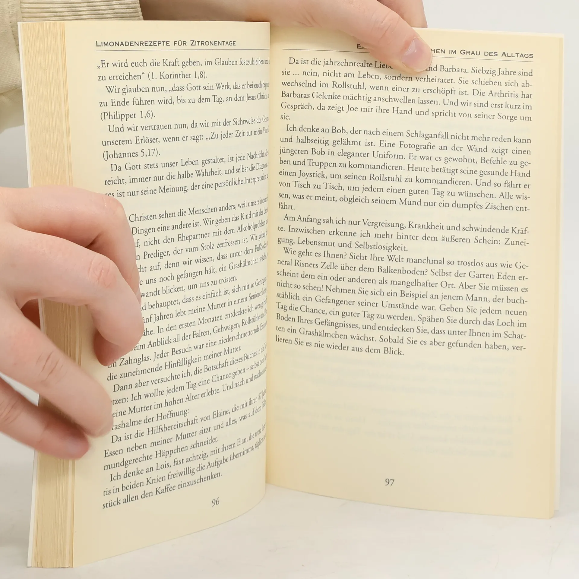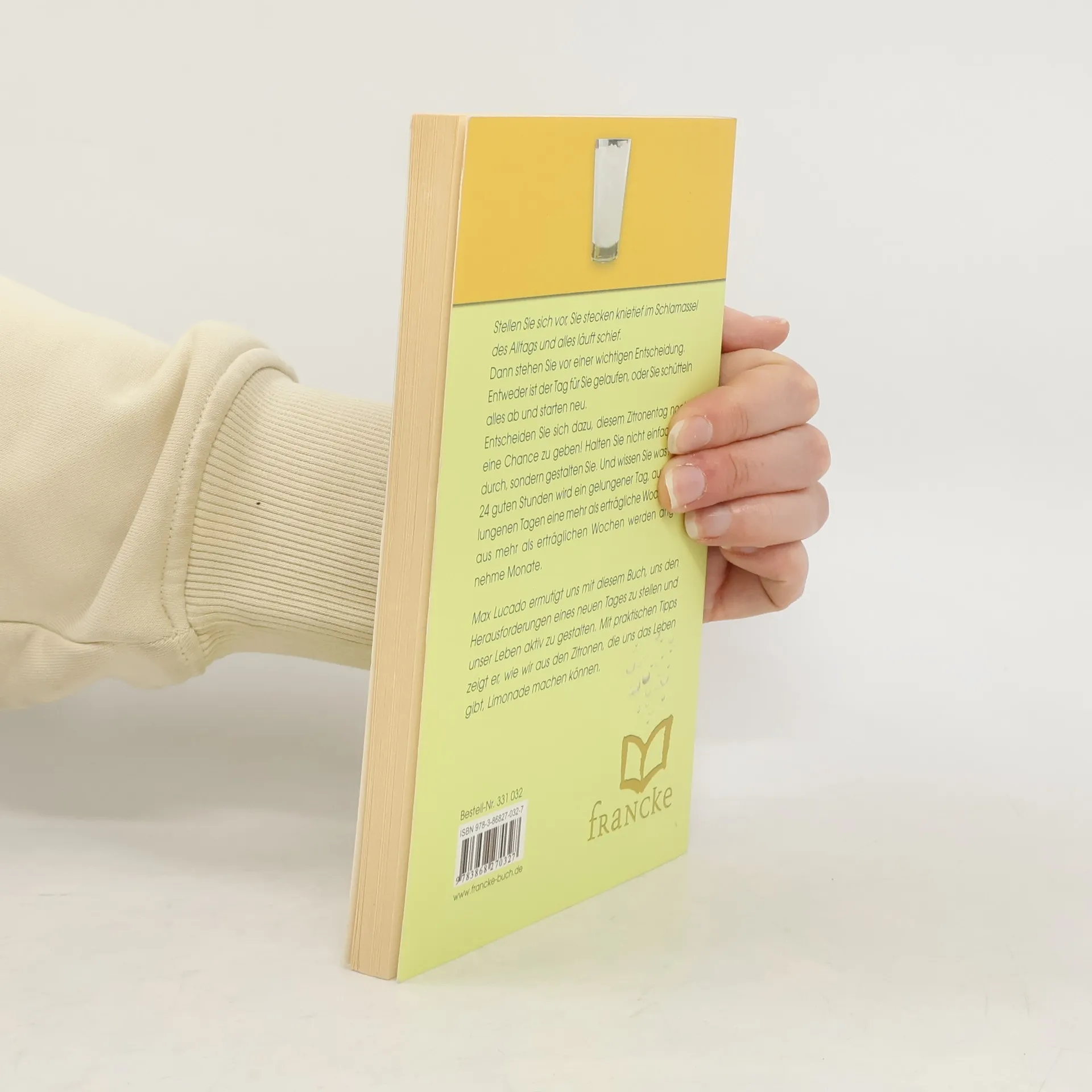 Stellen Sie sich vor, Sie stecken knietief im Schlamassel des Alltags und alles läuft schief. Dann stehen Sie vor einer wichtigen Entscheidung. Entweder ist der Tag für Sie gelaufen, oder Sie schütteln alles ab und starten neu. Entscheiden Sie sich dazu, diesem Zitronentag noch eine Chance zu geben! Halten Sie nicht einfach nur durch, sondern gestalten Sie. Und wissen Sie was? Aus 24 guten Stunden wird ein ge-lungener Tag, aus 7 gelungenen Tagen eine mehr als er-trägliche Woche und aus mehr als erträglichen Wochen werden angenehme Monate. Uns den Herausforderungen eines neuen Tages zu stellen und unser Leben aktiv zu gestalten – dazu fordert uns Lucado mit diesem Buch heraus. Mit praktischen Tipps zeigt er, wie wir aus den Zitronen, die das Leben uns gibt, Limonade machen können.