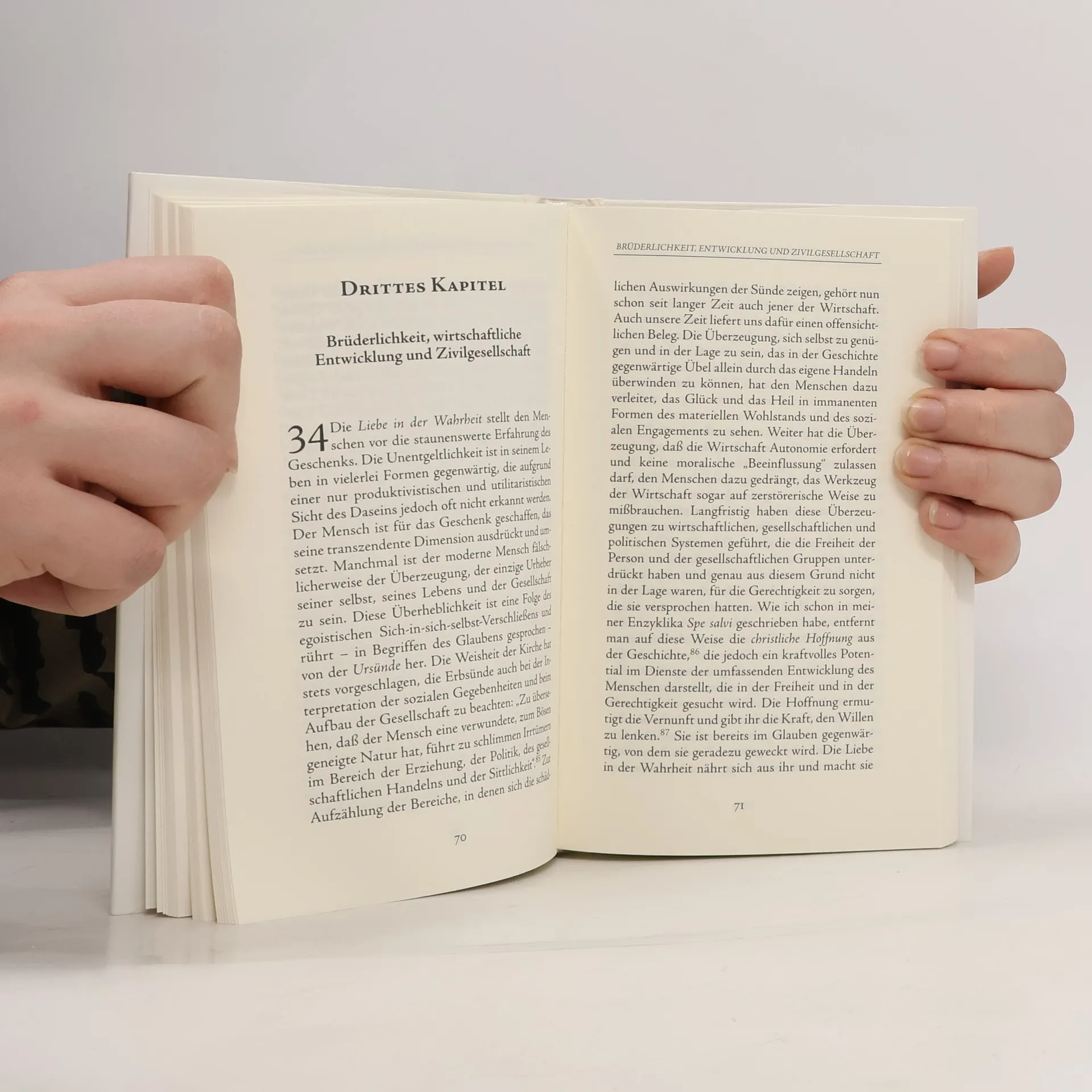 Das Buch behandelt die ganzheitliche Entwicklung des Menschen in Liebe und Wahrheit. Es umfasst Themen wie die Botschaft von Populorum Progressio, die zeitgenössische menschliche Entwicklung, Brüderlichkeit, Umweltfragen, sowie die Rolle der Technik und die Zusammenarbeit der Menschheitsfamilie.