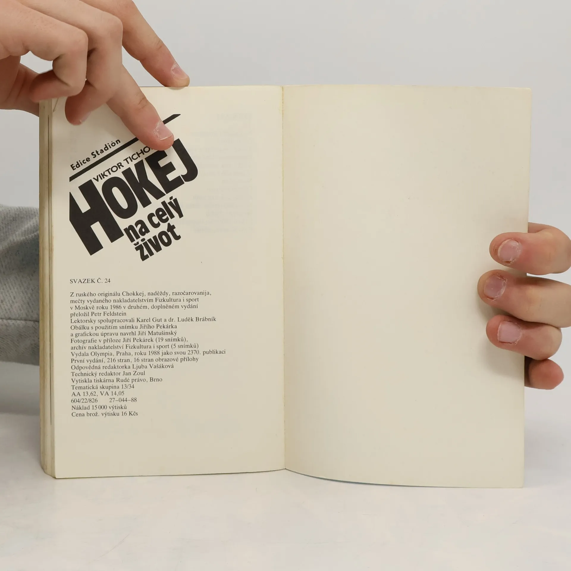 Jméno Viktora Tichonova je v historii světového hokeje pojem. Když se ho jednou ptali, zda nenapíše knihu, odpověděl, že to nemá v úmyslu, že chce především dělat hokej. A pokud by se k tomu přece jen odhodlal, byla by to kniha pro odborníky. Jen málokterý trenér má tak bohatou zkušenost. Poté co Viktor Tichonov skončil jako aktivní hráč, jako trenér rižského Dynama dovedl svěřený tým z druhé ligy do první ligy a do nejvyšší soutěže. Povolali ho trénovat tým CSKA a reprezentanty. Knihu posléze napsal. Nikoli jen pro odborníky, ale pro všechny příznivce té krásné populární hry.