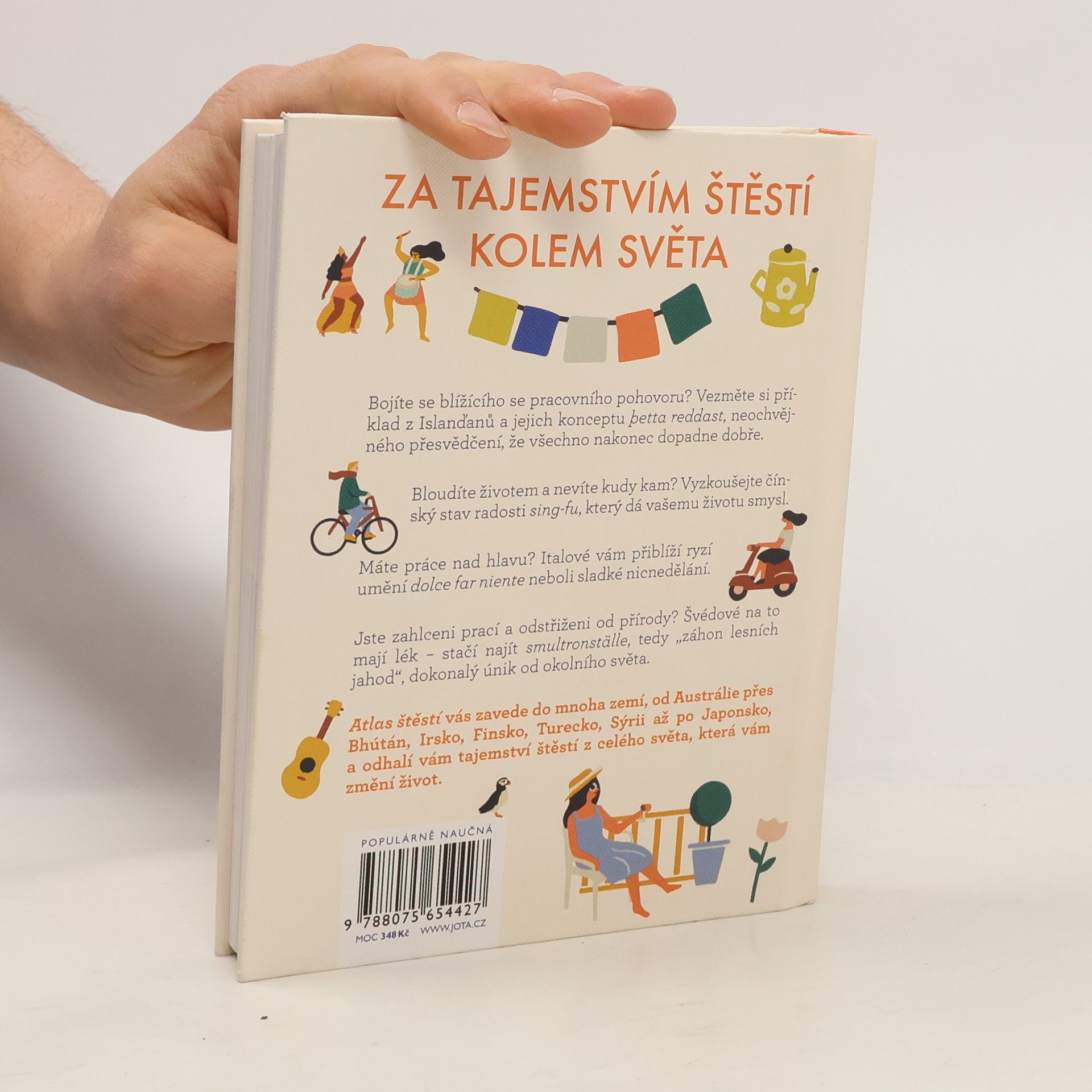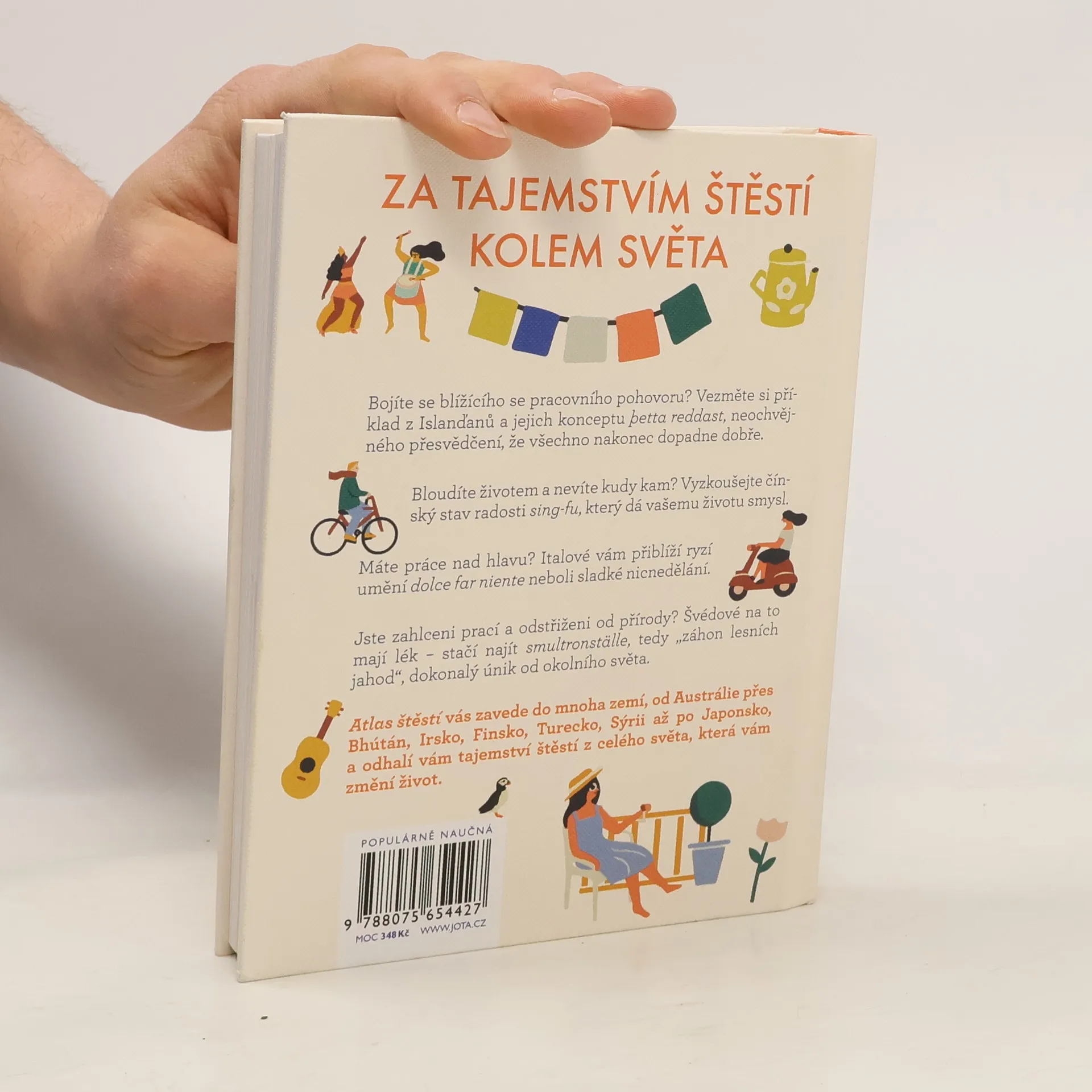 Cesta kolem světa a 33 mezinárodních návodů, jak dosáhnout štěstí. Bojíte se blížícího se pracovního pohovoru? Vezměte si příklad z Islanďanů a jejich konceptu þetta reddast, neochvějného přesvědčení, že všechno nakonec dopadne dobře.Bloudíte životem a nevíte kudy kam? Vyzkoušejte čínský stav radosti sing-fu, který dá vašemu životu smysl.Máte práce nad hlavu? Italové vám přiblíží ryzí umění dolce far niente neboli sladké nicnedělání.Jste zahlceni prací a odstřiženi od přírody? Švédové na to mají lék – stačí najít smultronställe, tedy „záhon lesních jahod“, dokonalý únik od okolního světa.Atlas štěstí vás zavede do mnoha zemí, od Anglie přes Bhútán, Irsko, Finsko, Turecko, Sýrii až po Japonsko a odhalí vám taje štěstí z celého světa, které vám změní život.