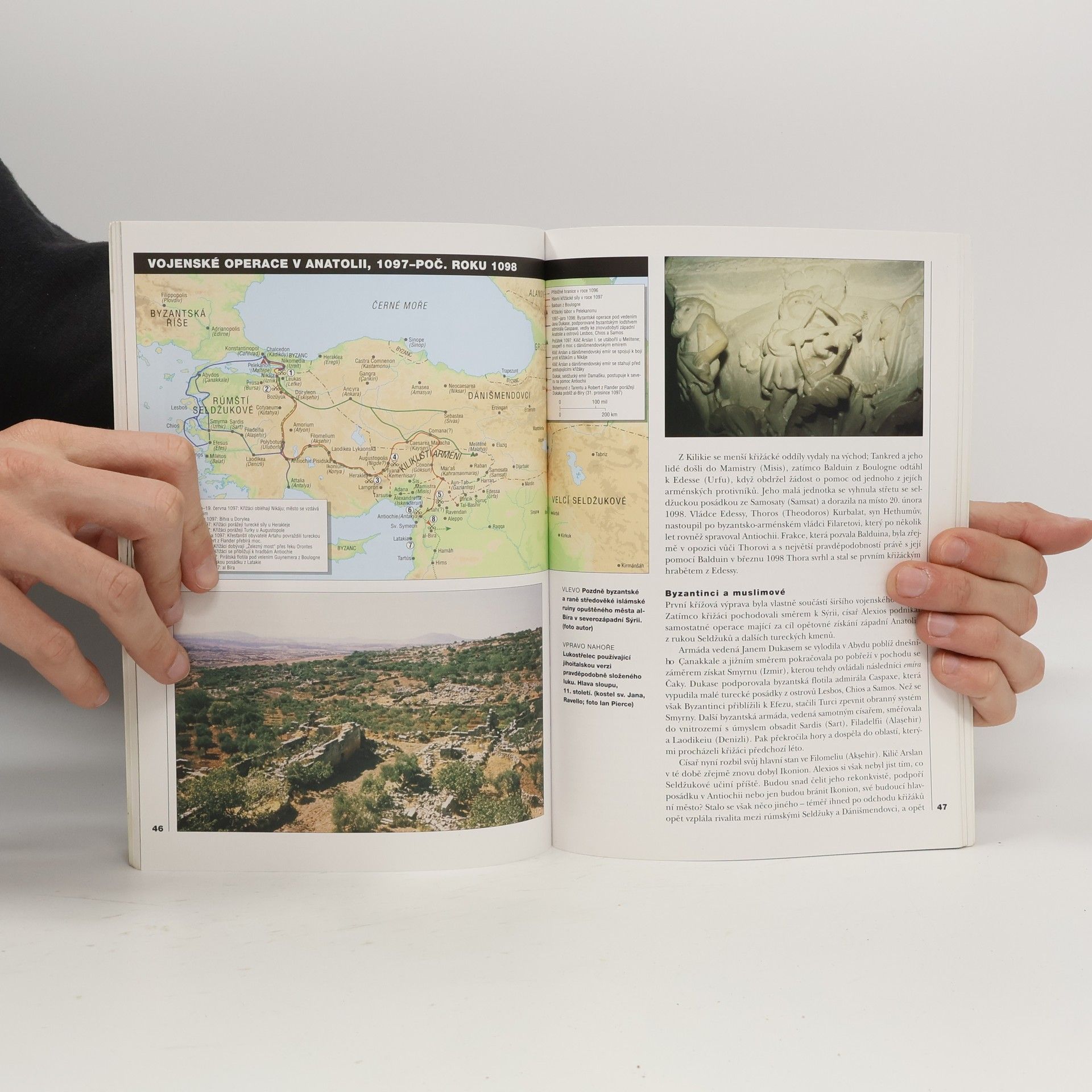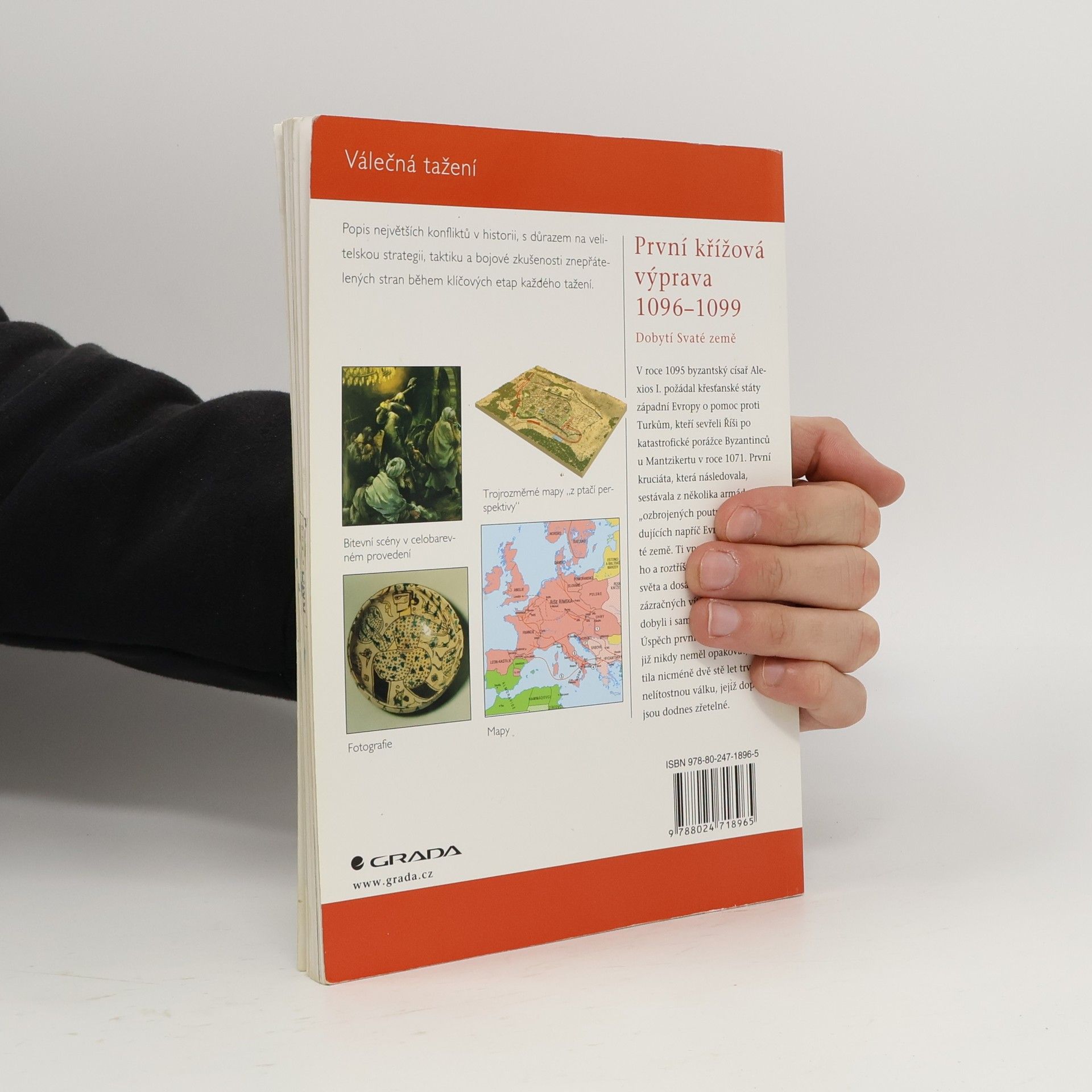 Velmi přehledný popis cílů a průběhu první křižové výpravy (1096-1099) doplněný mnoha ilustracemi a fotografiemi. Autor, britský historik a odborník na islámské dějiny a umění, popisuje příčiny a průběh tažení. Všímá si armád jednotlivých bojujících stran a strategických plánů jejich velitelů. V samostatné kapitole hodnotí celou výpravu. Analyzuje příčiny jejího úspěchu, změny, které nastaly v Malé Asii po skončení válek a jejich dopad na osudy tamějšího obyvatelstva. Zajímavá je i závěrečná stať Bitevní pole dnes, ve které upozorňuje na zvláštní formu současné turistiky - cesty po stopách tohoto velkého střetu několika kultur. - Na závěr je připojen soupis příslušné literatury (doplněno i o díla českých historiků) a rejstřík. Celou knihu provázejí ilustrace, fotografie a užitečné schématické mapky.