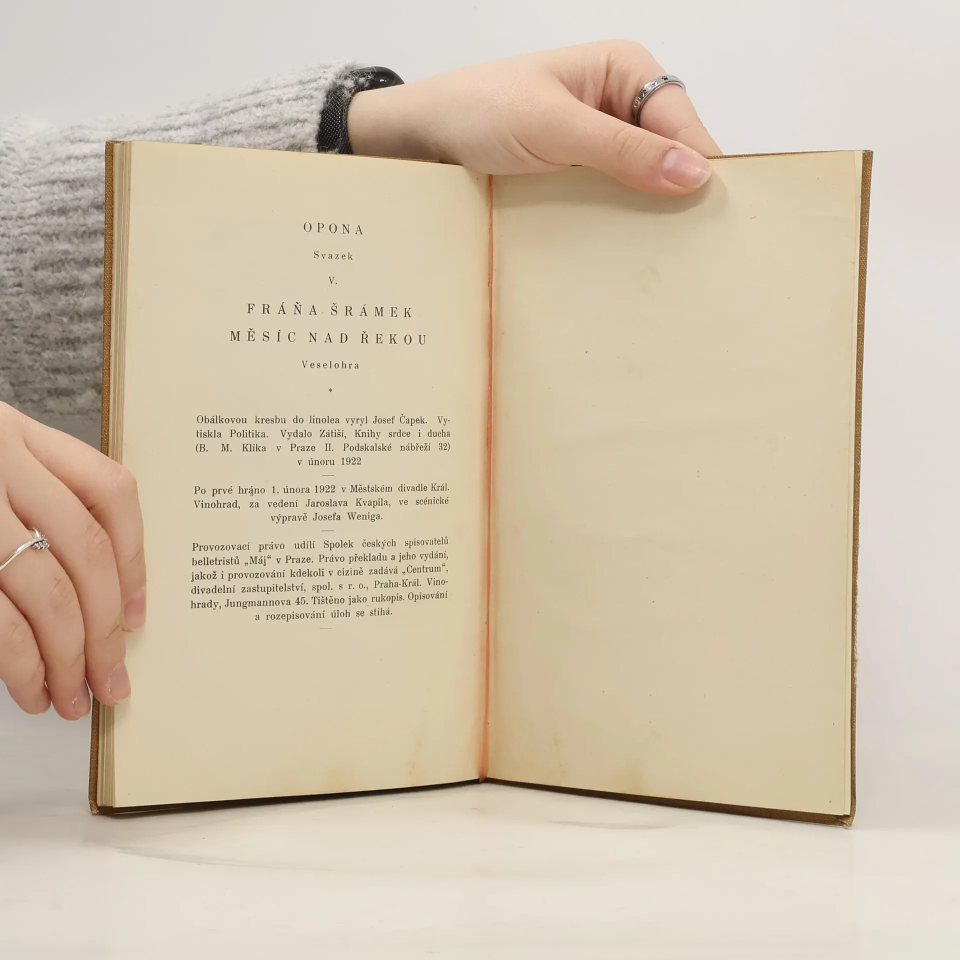 První vydání Šrámkovy melancholické komedie Měsíc nad řekou, která se stala jedním z pilířů českého dramatu a byla zfilmována režisérem Václavem Krškou.