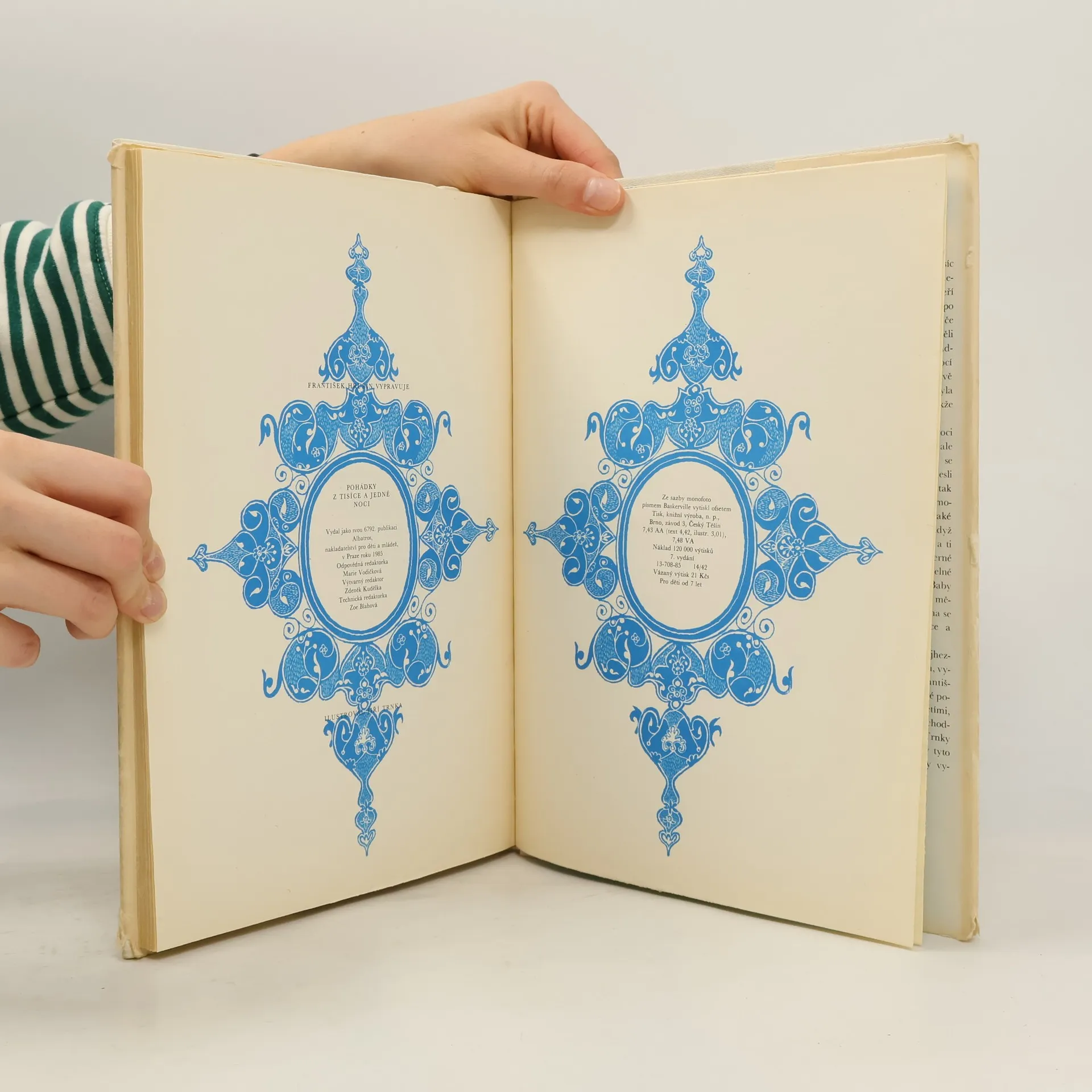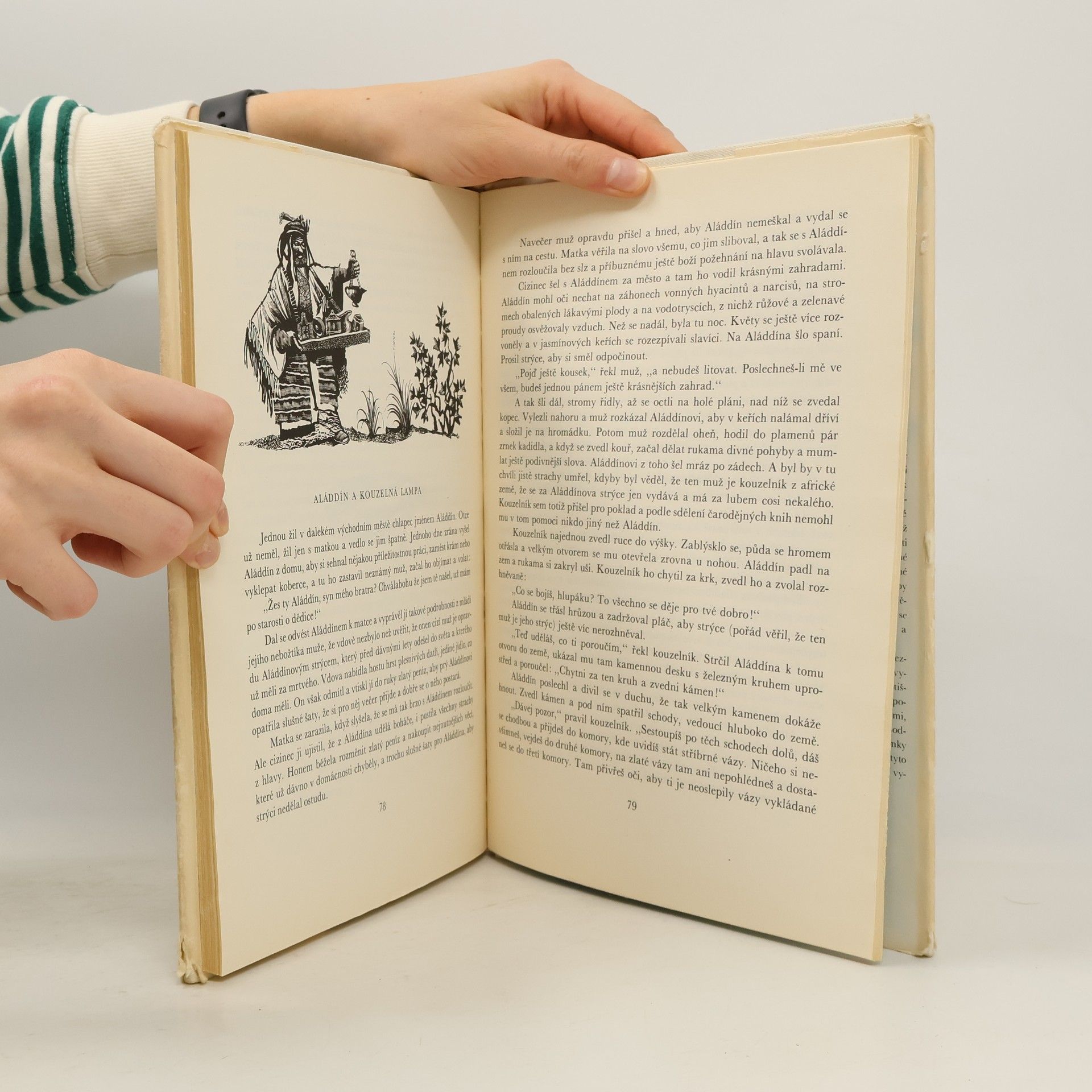 Výbor sedmi nejhezčích pohádek z Tisíce a jedné noci převyprávěných pro čtenáře od 6 let. (Pohádka o ebenovém koni, Dobrodružství Sindibáda Námořníka, Pohádka o Džaudarovi a jeho bratrech, Alí Baba a čtyřicet loupežníků, Pohádka o Abdalláhovi Zemském a Abdalláhovi Mořském, Pohádka o Abú Kírovi a Abú Sírovi, Aládín a kouzelná lampa). V bohaté fantazii probíhají rušné děje plné překvapivosti, vyjadřující dávné touhy prostých lidí po šťastném životě bez bídy a zla. Básník uvádí výbor půvabnou veršovanou pohádkou o Chytré Šahrazád a malíř vytvořil řadu působivých pohádkových ilustrací, plných barvité cizokrajnosti.