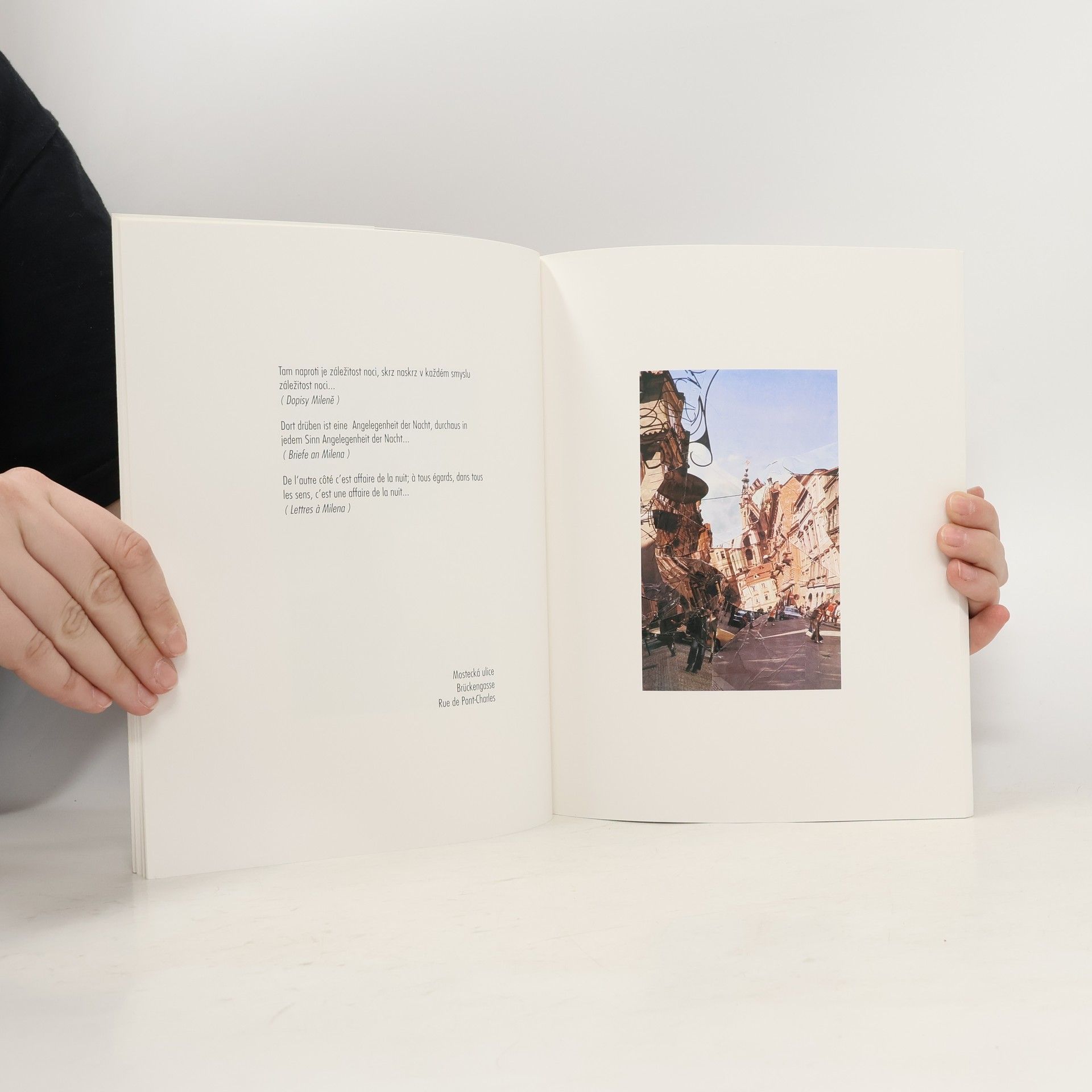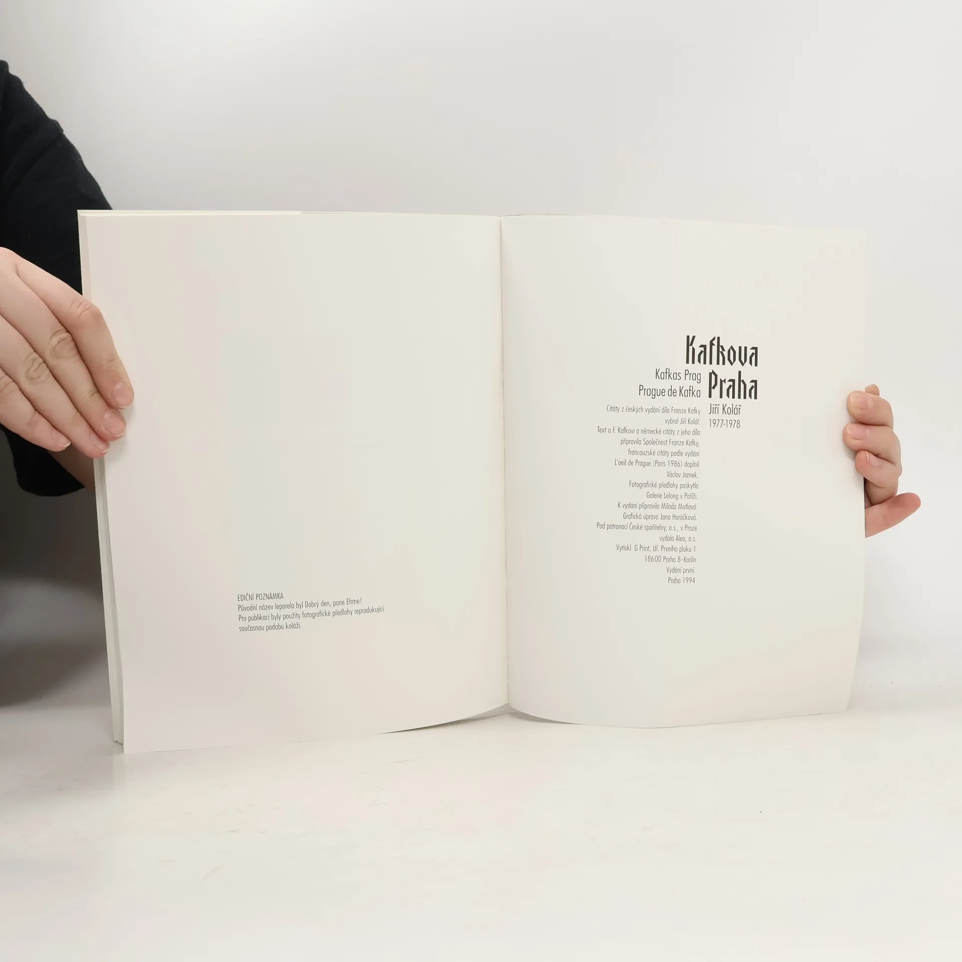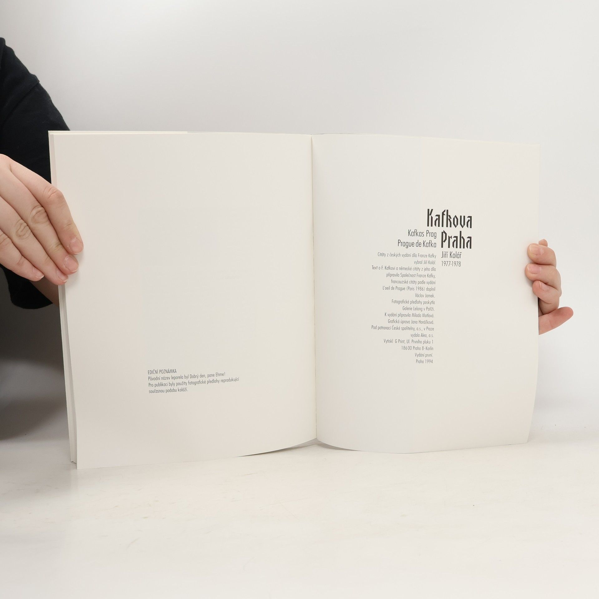 Kniha koláží vytvořených z fotografií pražských památek. Doplněno citáty z Kafkova díla v českém, německém a francouzském jazyce. Citáty z českých vydání díla Franze Kafky vybral Jiří Kolář. Text o F. Kafkovi a německé citáty z jeho díla připravila Společnost Franze Kafky. Francouzské citáty doplnil Václav Jamek. K vydání připravila Milada Motlová. Fotografické předlohy poskytla Galerie Lelong v Paříži. Publikace vyšla pod patronací České spořitelny, a.s., u příležitosti 100. výročí historické budovy Městské spořitelny pražské, 70 let úmrtí Franze Kafky a 80. narozenin Jiřího Koláře.