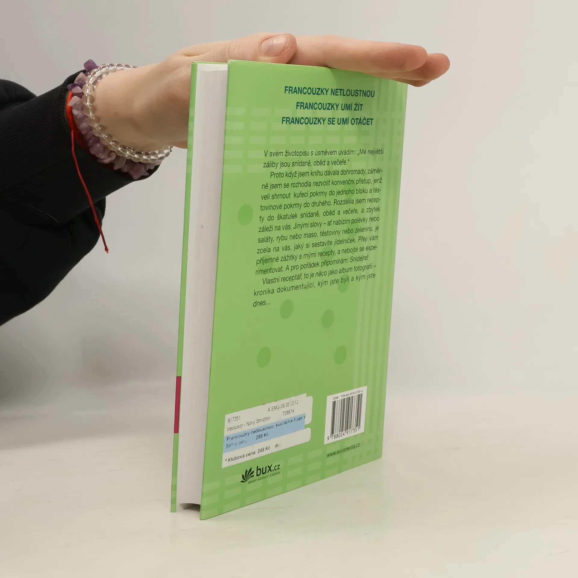 Knihy francouzské podnikatelky žijící ve Spojených státech Francouzky netloustnou a její dvě pokračování se staly bezesporu bestsellery. Mireille jednoho dne odjela jako mladá štíhlá studentka do Spojených států a po několika semestrech se vrátila do Francie s nadváhou. Díky rodinnému lékaři se jí brzy podařilo vrátit k původnímu stylu života - a také vzhledu. Autorka na vlastní zkušenosti odkryla tajemství francouzského paradoxu, který spočívá v tom, že právě Francouzky, jež jsou známé svým požitkářstvím, zůstávají až do vysokého věku štíhlé a vitální. Čtenářky nenechaly Mireille v klidu. Dychtily vědět, jak se opravdu stravuje, jak jídla připravuje a jaká jsou její dietní tajemství. Proto Mireille sestavila kuchařskou knihu - netradiční, zajímavou a inspirující. Předkládá vlastní interpretaci pokrmů, na nichž si léta pochutnávala s rodinou a přáteli, a také zbrusu nové „objevy“. Zařadila sem i malou kolekci osvědčených stálic a několik čtenáři vychválených receptů, které zazářily v předchozích knihách. Autorka věří v jednoduché recepty zachovávající ryzí chutě. Má ráda rozmanitost, jíž dociluje nakupováním čerstvého zboží na trhu. Zvlášť miluje pokrmy přinášející smyslový požitek, promlouvající ke zraku, čichu, chuti i hmatu. Z receptů se musí zrodit jídlo, které dobře chutná. Vše se točí kolem potěšení a zdraví. Uvidíte sami.
