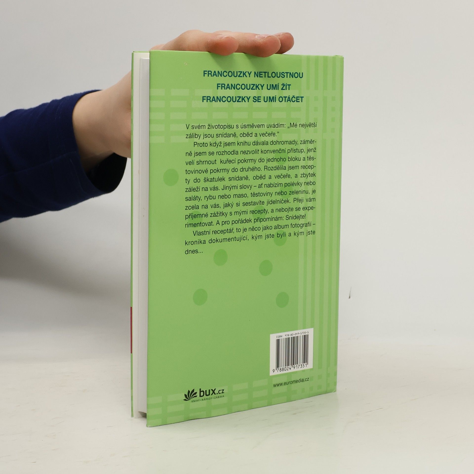 Knihy francouzské podnikatelky žijící ve Spojených státech Francouzky netloustnou a její dvě pokračování se staly bezesporu bestsellery. Mireille jednoho dne odjela jako mladá štíhlá studentka do Spojených států a po několika semestrech se vrátila do Francie s nadváhou. Díky rodinnému lékaři se jí brzy podařilo vrátit k původnímu stylu života - a také vzhledu. Autorka na vlastní zkušenosti odkryla tajemství francouzského paradoxu, který spočívá v tom, že právě Francouzky, jež jsou známé svým požitkářstvím, zůstávají až do vysokého věku štíhlé a vitální. Čtenářky nenechaly Mireille v klidu. Dychtily vědět, jak se opravdu stravuje, jak jídla připravuje a jaká jsou její dietní tajemství. Proto Mireille sestavila kuchařskou knihu - netradiční, zajímavou a inspirující. Předkládá vlastní interpretaci pokrmů, na nichž si léta pochutnávala s rodinou a přáteli, a také zbrusu nové „objevy“. Zařadila sem i malou kolekci osvědčených stálic a několik čtenáři vychválených receptů, které zazářily v předchozích knihách. Autorka věří v jednoduché recepty zachovávající ryzí chutě. Má ráda rozmanitost, jíž dociluje nakupováním čerstvého zboží na trhu. Zvlášť miluje pokrmy přinášející smyslový požitek, promlouvající ke zraku, čichu, chuti i hmatu. Z receptů se musí zrodit jídlo, které dobře chutná. Vše se točí kolem potěšení a zdraví. Uvidíte sami.