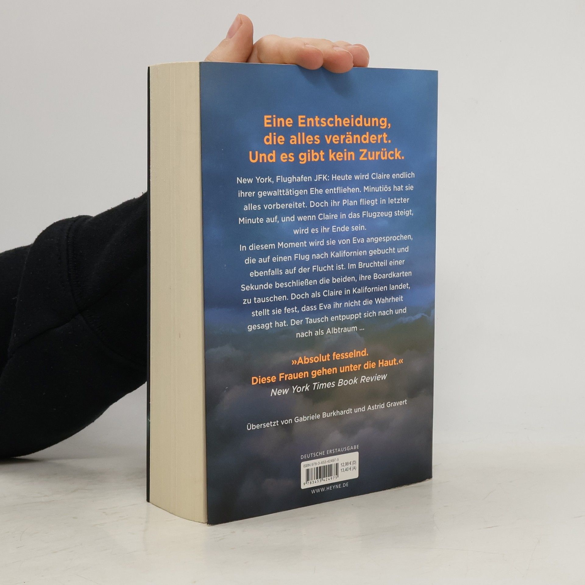 Zwei Frauen auf der Flucht. Eine Entscheidung, die alles verändert. Und kein Weg zurück. New York, Flughafen JFK: Claire soll nach Puerto Rico reisen, um ihren Mann, einen ehrgeizigen Politiker, beim Wahlkampf zu unterstützen. Doch in Wahrheit will sie nichts als fliehen – vor seinen gewalttätigen Übergriffen und der lückenlosen Kontrolle, die er über sie ausübt. Sie kommt mit Eva ins Gespräch, die bei ihrem schwerkranken Mann Sterbehilfe geleistet hat. Zu Hause in Kalifornien erwartet sie die Polizei. Innerhalb weniger Sekunden beschließen sie, die Bordkarten zu tauschen und sich gegenseitig ein neues Leben zu schenken.Erleichtert landet Claire in Kalifornien. In Evas Haus gibt es allerdings keine Hinweise auf einen Ehemann. Dann erfährt sie, dass das Flugzeug nach Puerto Rico abgestürzt ist. Und kurz darauf entdeckt sie die vermeintlich abgestürzte Eva in einer Fernsehreportage über das Unglück. Lebendig. Hat sie die Flucht in das Leben einer Anderen am Ende doch nur in eine Falle gelockt?