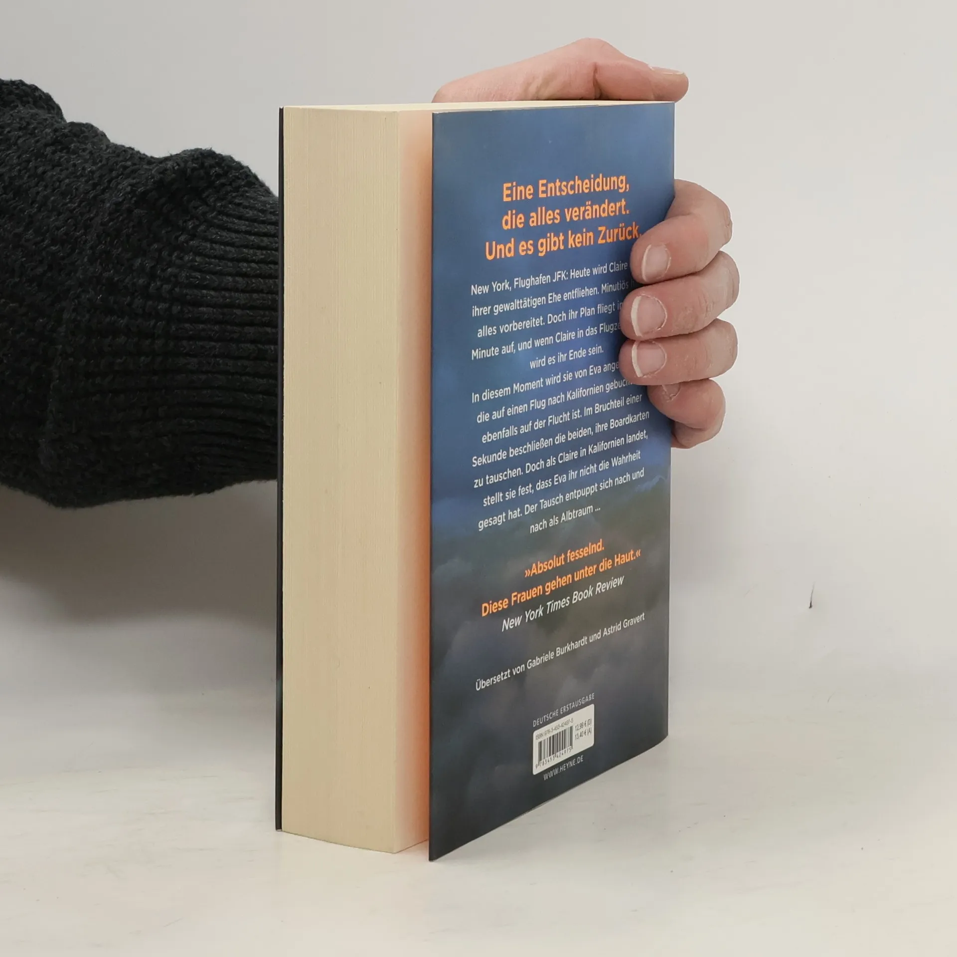 Zwei Frauen auf der Flucht. Eine Entscheidung, die alles verändert. Und kein Weg zurück. New York, Flughafen JFK: Claire soll nach Puerto Rico reisen, um ihren Mann, einen ehrgeizigen Politiker, beim Wahlkampf zu unterstützen. Doch in Wahrheit will sie nichts als fliehen – vor seinen gewalttätigen Übergriffen und der lückenlosen Kontrolle, die er über sie ausübt. Sie kommt mit Eva ins Gespräch, die bei ihrem schwerkranken Mann Sterbehilfe geleistet hat. Zu Hause in Kalifornien erwartet sie die Polizei. Innerhalb weniger Sekunden beschließen sie, die Bordkarten zu tauschen und sich gegenseitig ein neues Leben zu schenken.Erleichtert landet Claire in Kalifornien. In Evas Haus gibt es allerdings keine Hinweise auf einen Ehemann. Dann erfährt sie, dass das Flugzeug nach Puerto Rico abgestürzt ist. Und kurz darauf entdeckt sie die vermeintlich abgestürzte Eva in einer Fernsehreportage über das Unglück. Lebendig. Hat sie die Flucht in das Leben einer Anderen am Ende doch nur in eine Falle gelockt?