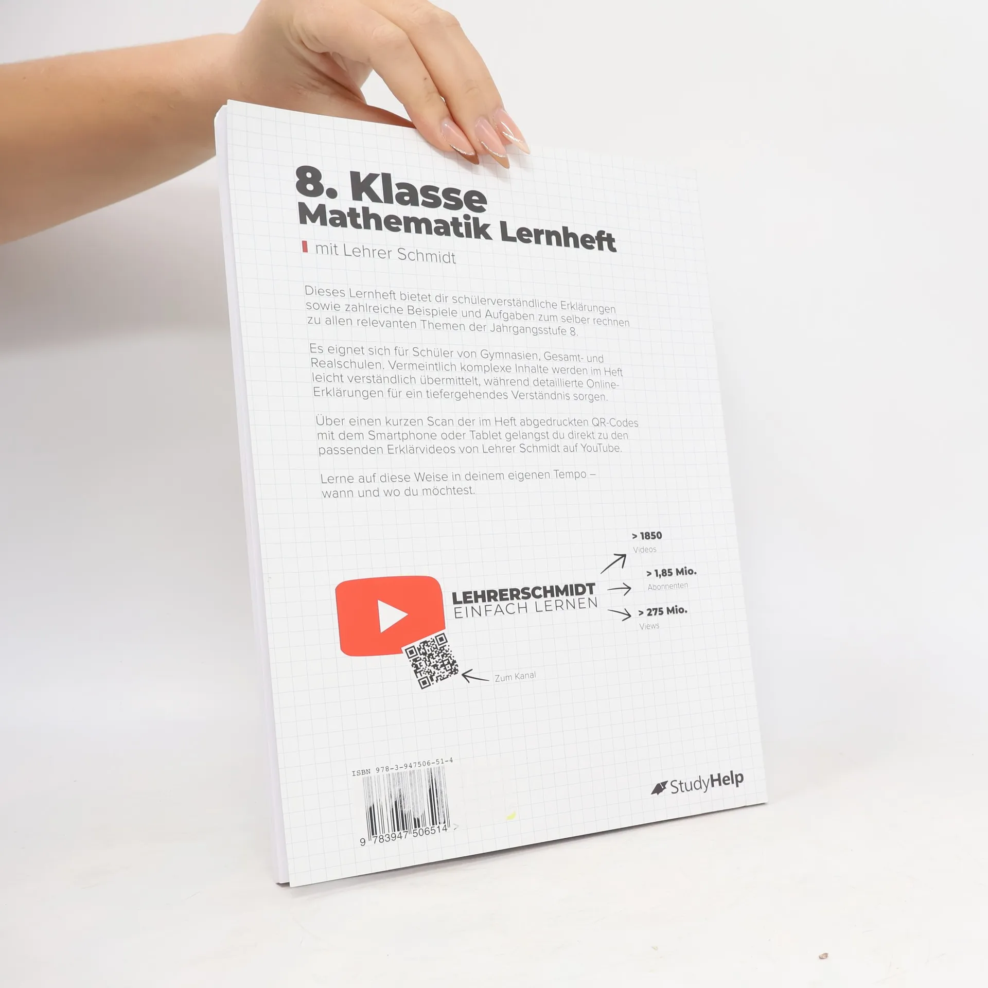 Unser Lernheft hilft dir mit Lernvideos von Lehrer Schmidt, auch in Zeiten von Home-Schooling, nicht den Überblick zu verlieren! 84 Seiten anschauliche Erklärungen 61 Lernvideos von Lehrer Schmidt 42 Aufgaben inkl. Lösungen Dieses Lernheft steckt voller Erklärungen, Beispielaufgaben, Aufgaben und Lösungen zu allen relevanten Themen der 8. Klasse für Gymnasien, Gesamt-, Haupt- und Realschulen. Ganz egal, ob du einfach nur den aktuellen Stoff vertiefen oder bereits in der Schule gelerntes wiederholen willst, hier wirst du fündig. Vermeintlich komplizierte Zusammenhänge sind in einer für Schüler vollkommen verständlichen Sprache dargestellt. Außerdem findest du zu den Themen alle Formeln, Skizzen und was sonst noch notwendig ist, um den Sachverhalt zu verstehen. Als ergänzendes Lernmaterial stehen dir dank der QR-Codes im Heft themenbasierte Erklärvideos von Lehrer Schmidt sofort zur Verfügung. Scanne hierzu mit deinem Smartphone oder Tablet den QR-Code ab und sieh dir ein auf dein Kapitel zugeschnittenes Video an. Auf diese Weise kannst du dich optimal auf mathematische Inhalte vorbereiten und wichtige Themen wiederholen. Inhaltsverzeichnis Zahlen und Größen Prozent- und Zinsrechnung Zuordnungen Geometrie Rationale Zahlen Terme Funktionen Gleichungen und Ungleichungen Daten und Zufall Lösungen