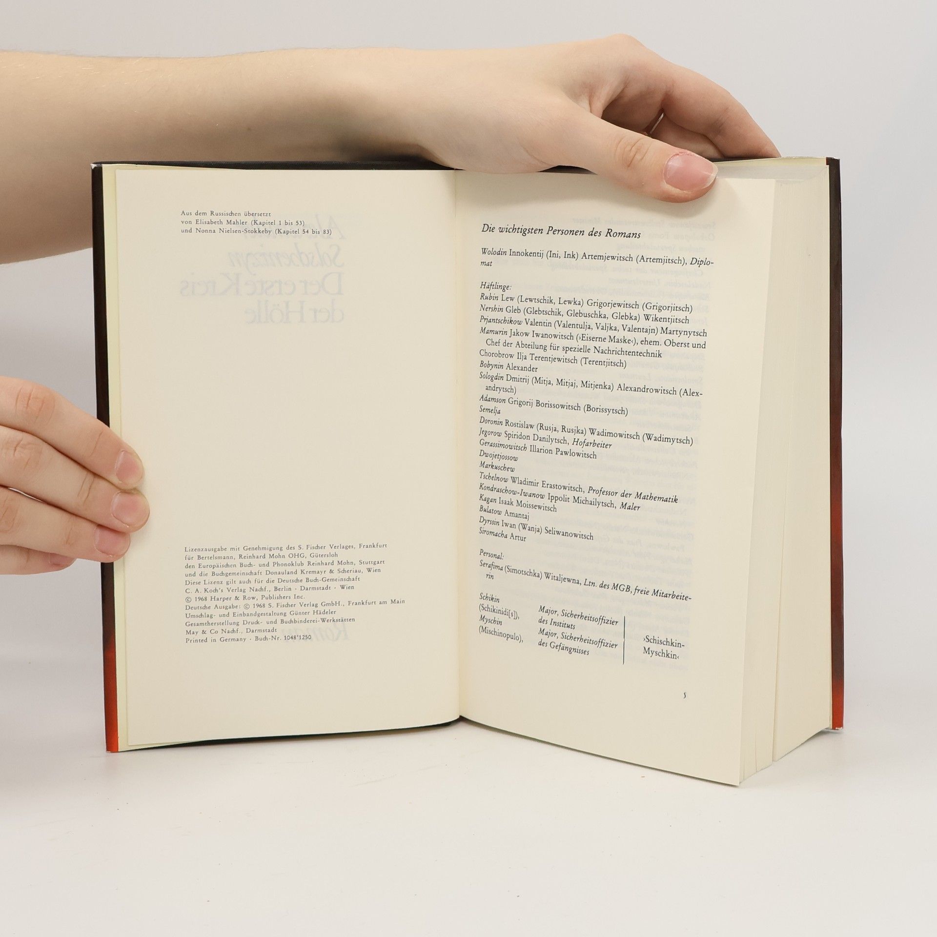 »Die Handlung des umfang- und inhaltsreichen Werkes ist mit ein paar Tagen im letzten Dezemberdrittel 1949 begrenzt und stellt eigentlich einen Kriminalroman vor, der mit der Tat beginnt, ... jedoch mit der Verhaftung und genauen Bekanntgabe, wie es in der berüchtigten Lubjanka zugeht, nicht endet: Die Story von dem Staatsrat zweiter Klasse Innokentij Wolodin, der in einer plötzlichen Anwandlung von einer öffentlichen Telephonzelle aus die amerikanische Botschaft in Moskau anruft und einem Attache verrät, daß drüben ein Ehepaar Rosenberg in den nächsten Tagen die Geheimnisse der Atombomben-Herstellung einem sowjetischen Agenten weitergeben werde - dieser aufregende Anfang ist bloß Aufhänger für alles andere. ›Alles‹ ist wörtlich gerneint: vom Sonderlager Marfino in der Nähe der Hauptstadt, vom Leben der Angehörigen ›draußen‹, von den einfachen Aufsehern, von Politfunktionären im Offiziersrang und dem zuständigen Minister bis zu IHM, vor dem sie alle zittern, Stalin, wie er mitten in der Nacht die ihm gegenüber ohnmächtigen Machthaber zu sich zitiert. Ein historisch-soziologisches Panorama also, zwei Jahrzehnte, gesammelt im Brennpunkt jener halben Woche, gegen Ende 1949.«