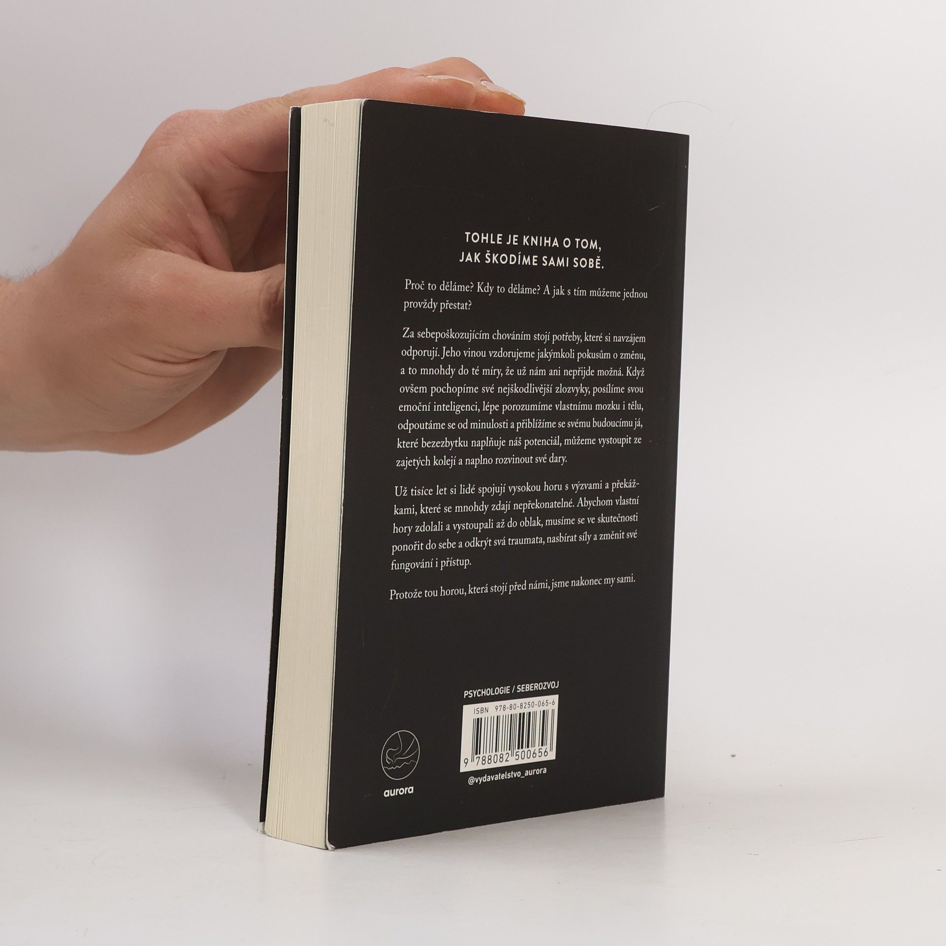 Tato kniha se zaměřuje na to, jak si nevědomky škodíme a proč k tomu dochází. Kdy se sebepoškozující chování objevuje a jak ho můžeme nadobro překonat? Jeho příčinou jsou protichůdné potřeby, které nás často brzdí ve snaze změnit svůj život, až si začneme myslet, že změna není možná. Pokud se však dokážeme podívat na své škodlivé zvyky zblízka, zvýšit svou emoční inteligenci, lépe pochopit fungování vlastního těla a mysli, odpoutat se od minulosti a přiblížit se své budoucí verzi, která plně využívá svůj potenciál, můžeme se osvobodit z těchto vzorců chování a rozvinout své schopnosti naplno. Lidé si již tisíce let spojují vysoké hory s překážkami, které se zdají nepřekonatelné. Abyste však zdolali svou vlastní horu a dosáhli vrcholu, musíte nejprve zaměřit pohled do nitra, odhalit svá traumata, nabrat sílu a změnit svůj přístup. Protože tou největší horou, kterou musíte překonat, jste ve skutečnosti vy sami.