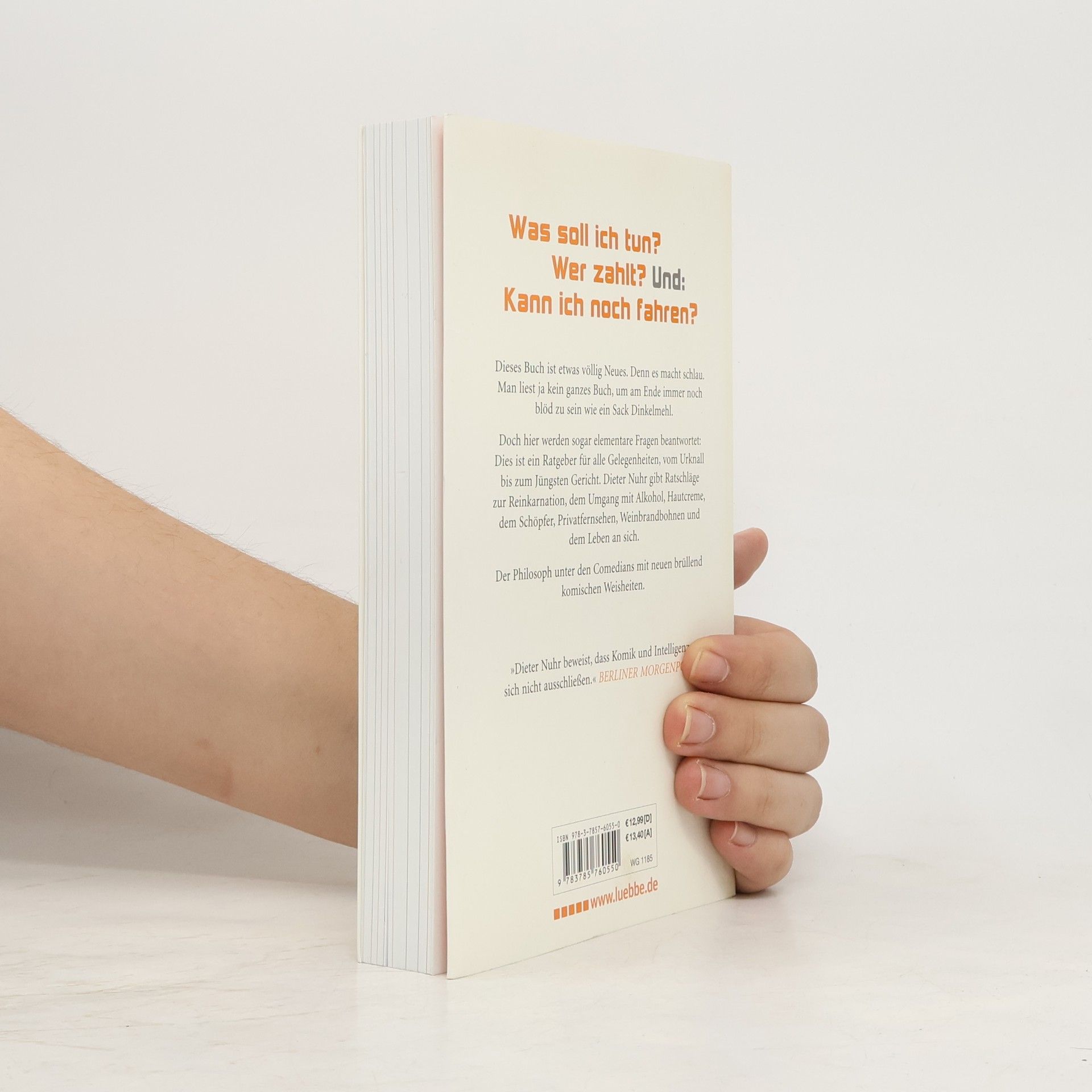 Dieses Buch ist etwas völlig Neues. Denn es macht schlau. Man liest ja kein ganzes Buch, um am Ende immer noch blöd zu sein wie ein Sack Dinkelmehl. Doch hier werden sogar elementare Fragen beantwortet: Dies ist ein Ratgeber für alle Gelegenheiten, vom Urknall bis zum Jüngsten Gericht. Dieter Nuhr gibt Ratschläge zur Reinkarnation, dem Umgang mit Alkohol, Hautcreme, dem Schöpfer, Privatfernsehen, Weinbrandbohnen und dem Leben an sich. Der Philosoph unter den Comedians mit neuen brüllend komischen Weisheiten.