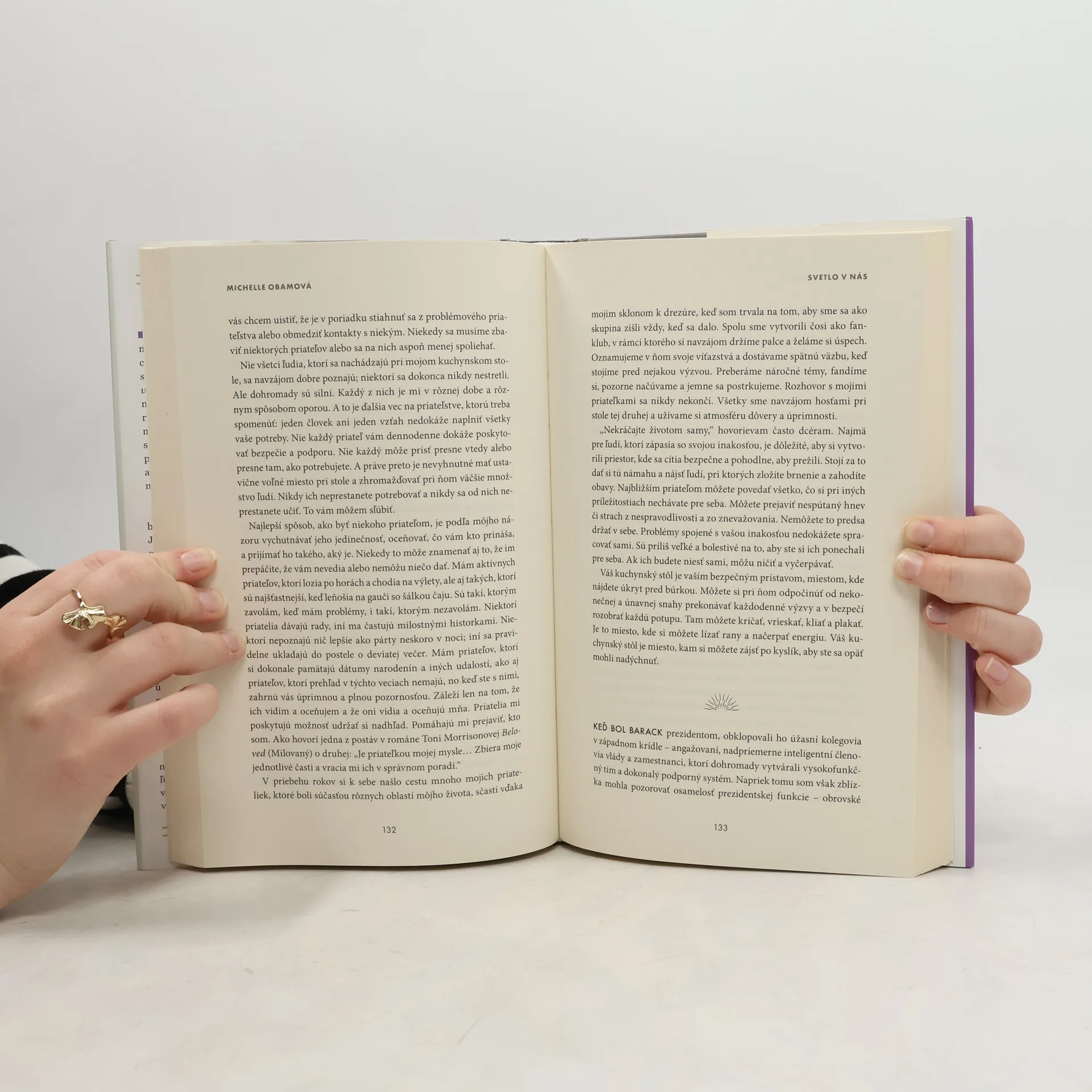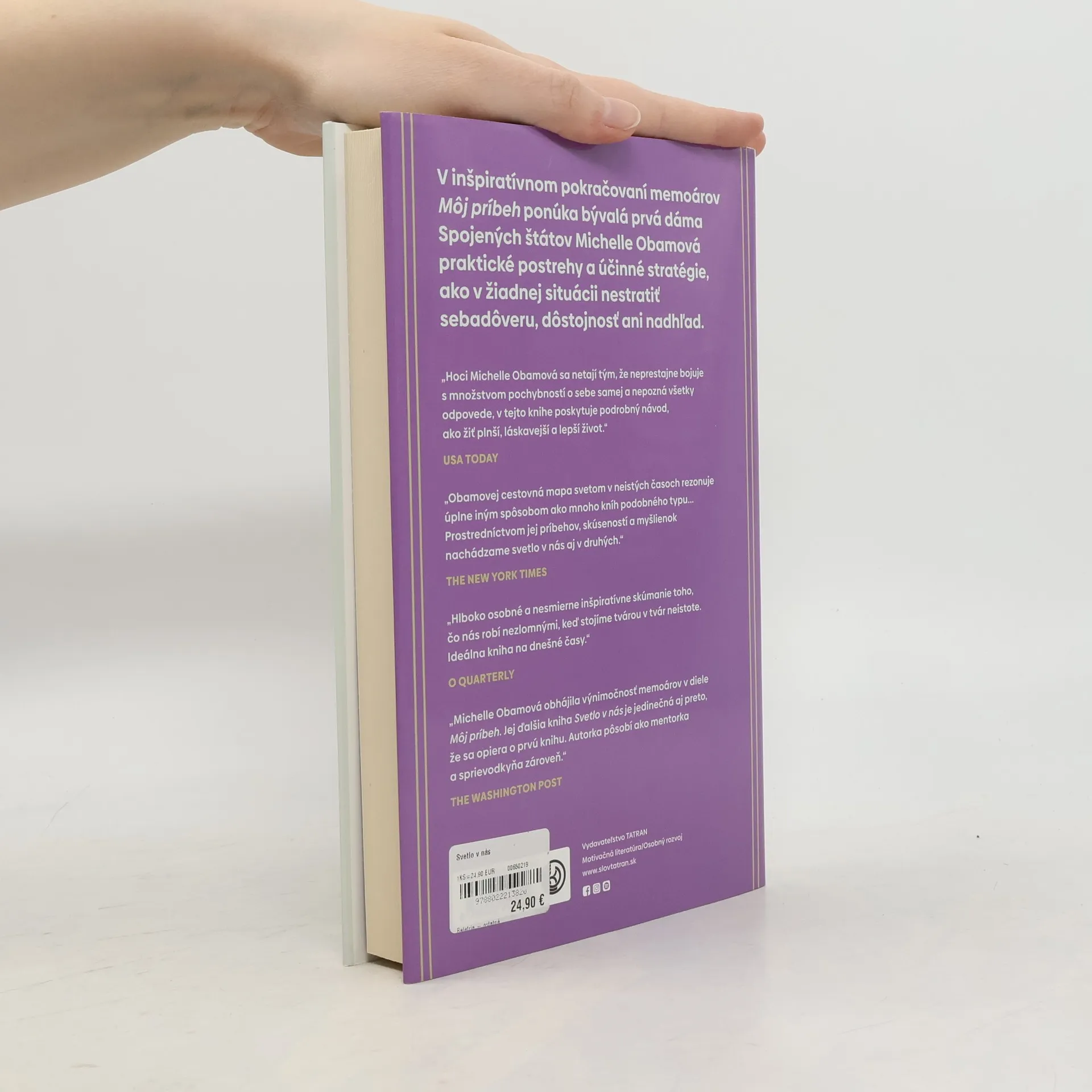 V inšpiratívnom pokračovaní oceňovaných memoárov Môj príbeh sa bývalá prvá dáma Spojených štátov Michelle Obamová delí o praktické postrehy a účinné stratégie, ako si udržať nádej a rovnováhu v dnešnom svete plnom neistoty.Na veľké výzvy života neexistujú jednoznačné riešenia ani vyčerpávajúce odpovede, no Michelle Obamová verí, že všetci môžeme nájsť a využívať súbor nástrojov, ktoré nám pomôžu zvládnuť dobu plnú zmien a udržať si rovnováhu v ťažkých časoch. V knihe Svetlo v nás nadväzuje priamy a úprimný dialóg s čitateľmi a uvažuje o otázkach, s ktorými zápasia mnohí z nás:Ako si vybudovať pevné a úprimné vzťahy? Ako objaviť silu a vytvoriť si vzťahy s druhými napriek našim odlišnostiam? O aké nástroje sa môžeme oprieť, ak zápasíme s nedostatkom sebadôvery a pocitom bezradnosti? Čo robiť, keď je toho na nás priveľa?