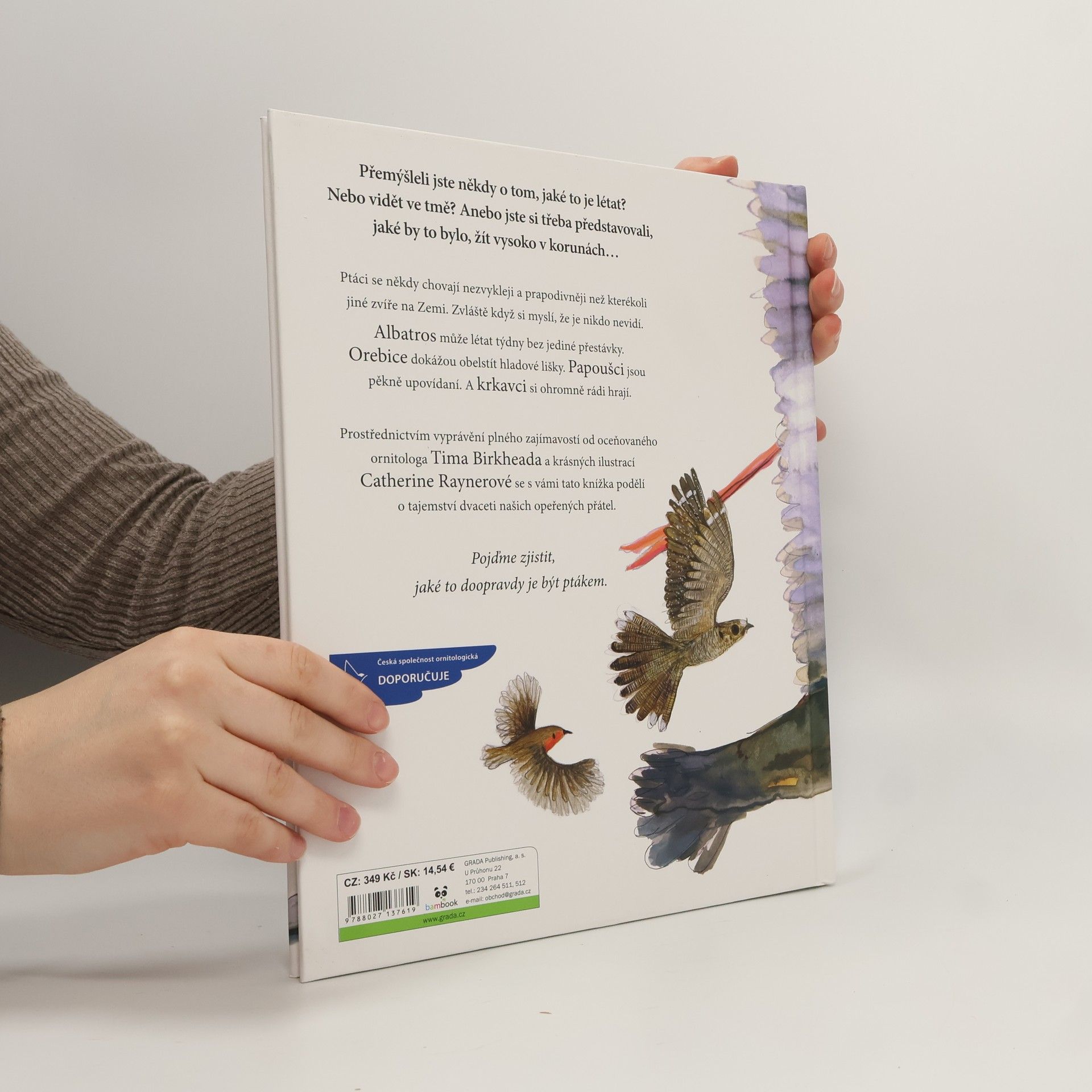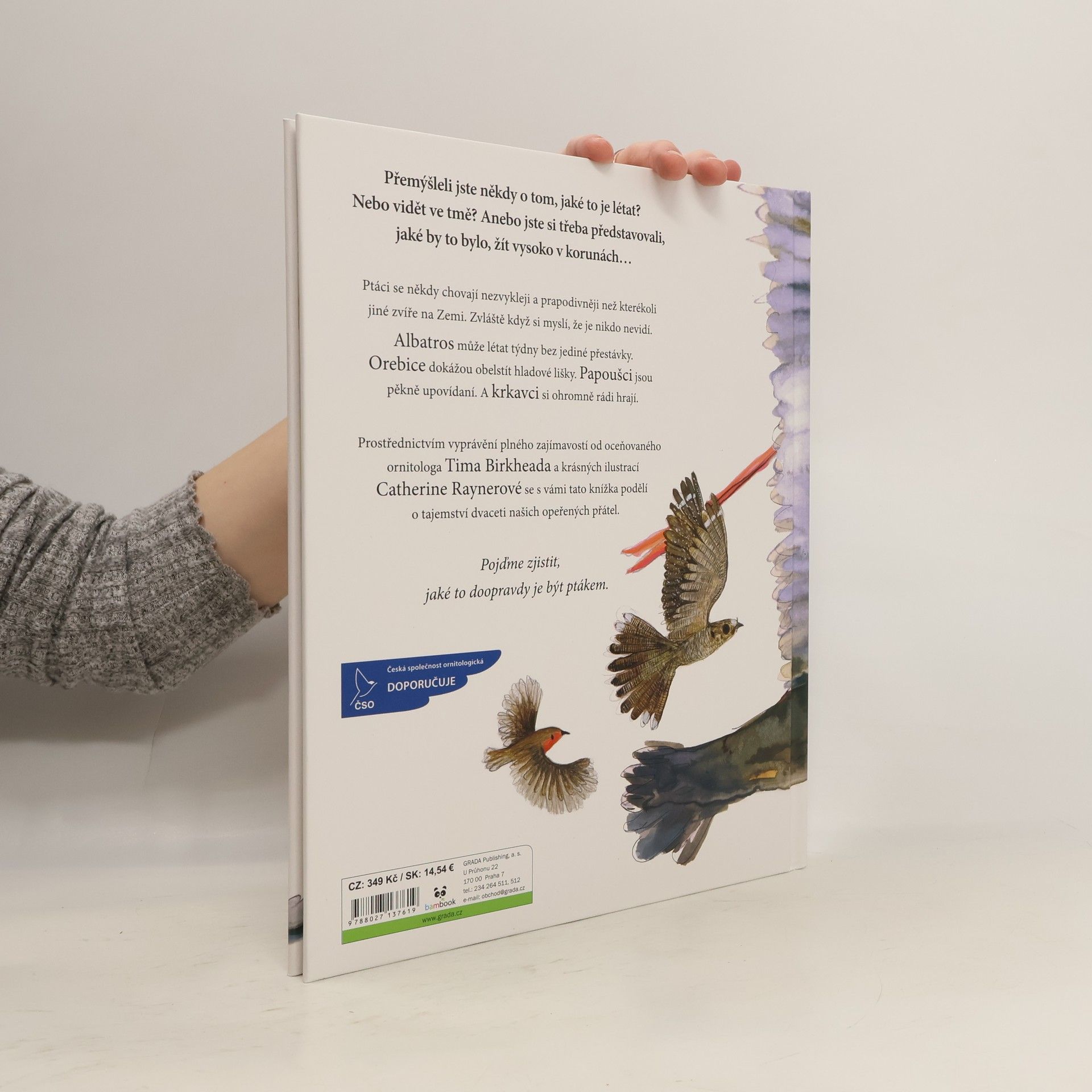 Ptáci se někdy chovají nezvykleji a prapodivněji než kterékoli jiné zvíře na Zemi. Zvláště když si myslí, že je nikdo nevidí. Albatros může létat týdny bez jediné přestávky. Orebice dokážou obelstít hladové lišky. Papoušci jsou pěkně upovídaní. A krkavci si ohromně rádi hrají. Prostřednictvím vyprávění plného zajímavostí od oceňovaného ornitologa Tima Birkheada a krásných ilustrací Catherine Raynerové se s vámi tato knížka podělí o tajemství dvaceti našich opeřených přátel.Pojďme zjistit, jaké to doopravdy je být ptákem.