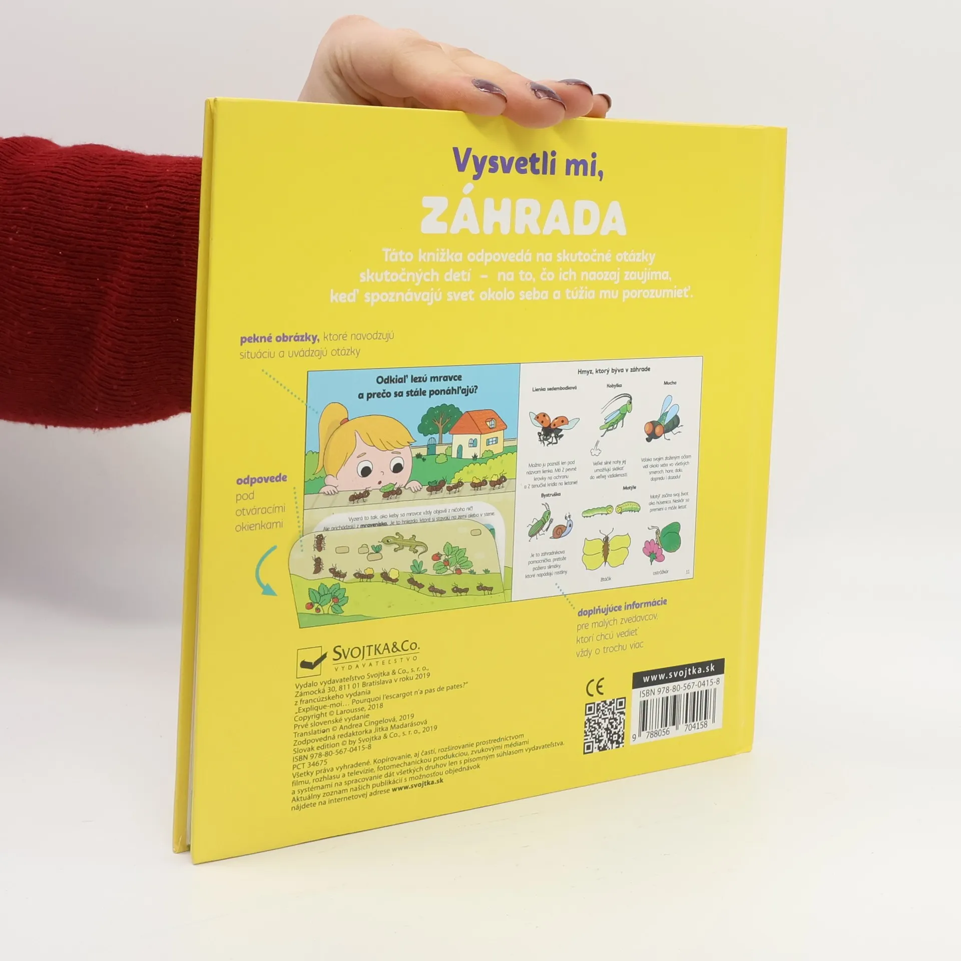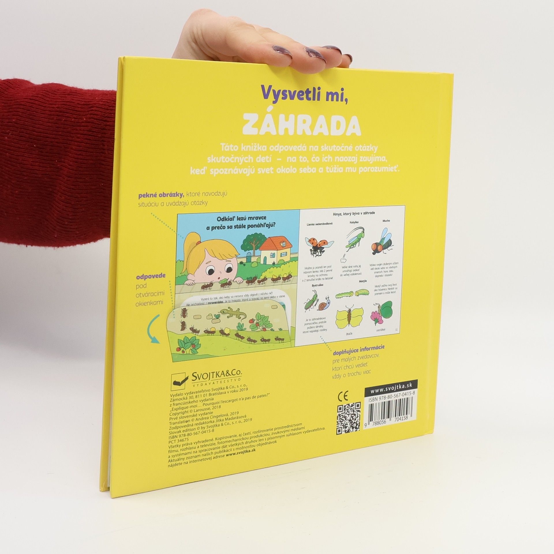 Zaujíma ťa, čo sa deje v záhrade? Prečo je tráva zelená, prečo si vtáky stavajú hniezda alebo ako rastie mrkva? Odpovede na tieto a ďalšie otázky nájdeš vnútri knihy. Na každej dvojstrane je veľké odklápacie okienko, pod ktorým sa schováva odpoveď. Ďalšia strana obsahuje doplňujúce informácie pre malých zvedavcov, ktorí chcú vedieť vždy o trochu…