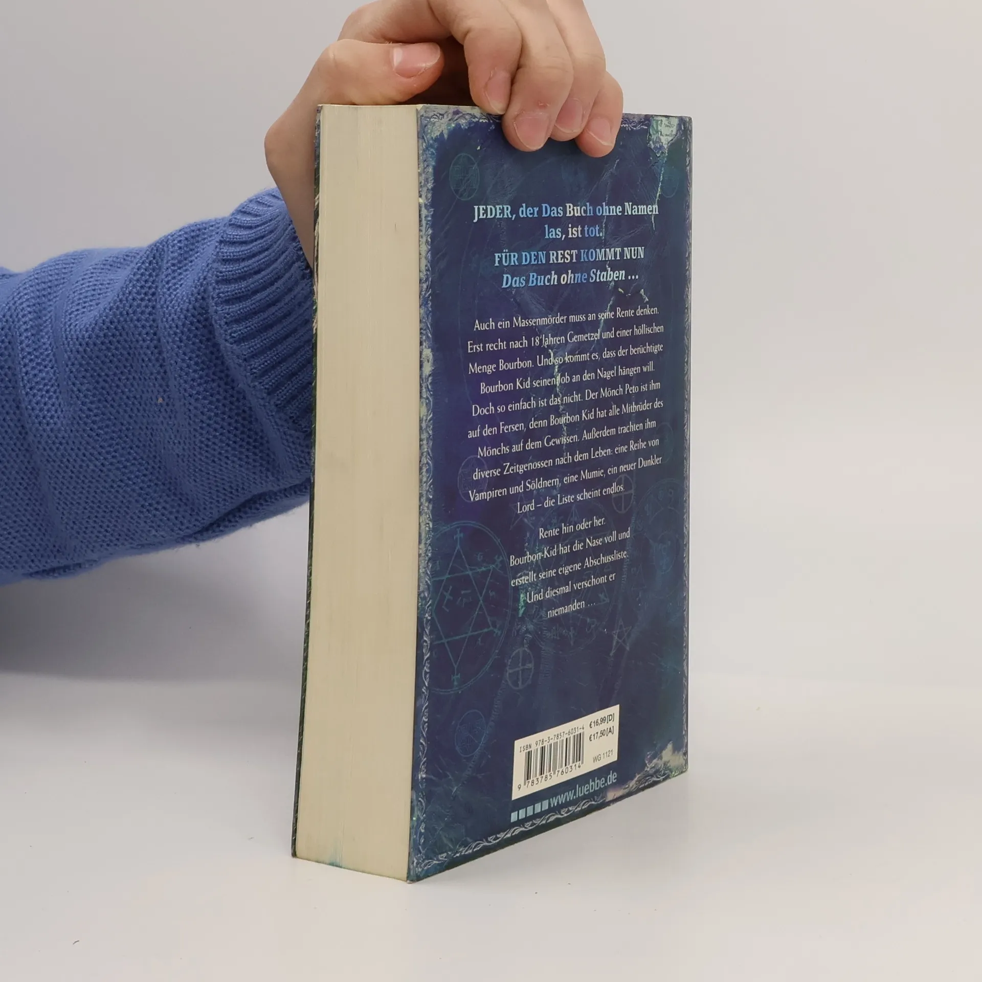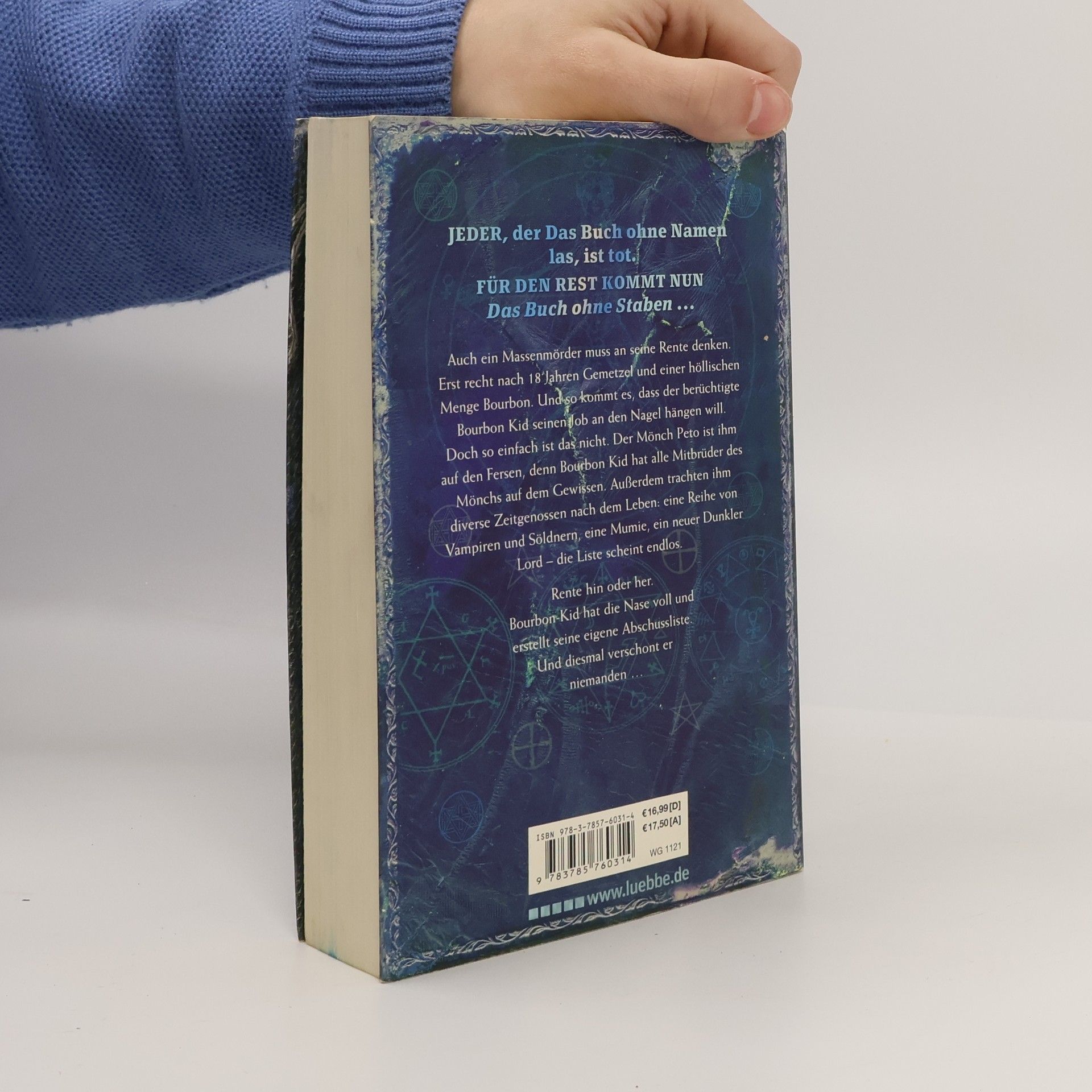 Ebenso anonymer Nachfolgeband wie zuvor "Das Buch ohne Namen". Nach 250 Seiten ist der Massenmörder Bourbon Kid, der gefürchtetste und berüchtigste Killer von Santa Mondega, wieder in seiner Stadt zurück. Ob er jetzt "an seine Rente denken muss", steht dahin, denn seine Schießeisen sitzen nach wie vor sehr locker. Ein neues Blutbad steht bevor. Einleitend wird von seiner tragischen Vorgeschichte erzählt, die seine künftigen Rachefeldzüge gegen alle Untoten etwas verständlicher machen. Undercover-Vampir Vittori soll den auch hier wieder bedeutsamen kostbaren blauen Stein, Auge des Mondes genannt, erneut reaktivieren. Viel Gewalt spricht aus allen Zeilen, die Brutalität obsiegt. Die mystischen Handlungselemente täuschen über den erbarmungslosen Killer hinweg. Das gnadenlose Massaker ist nicht jedermanns Sache. Abgrundtiefe Mischung aus Horror, Mystery und Fantasy, raffiniert, blutig, abgedreht und überzogen
