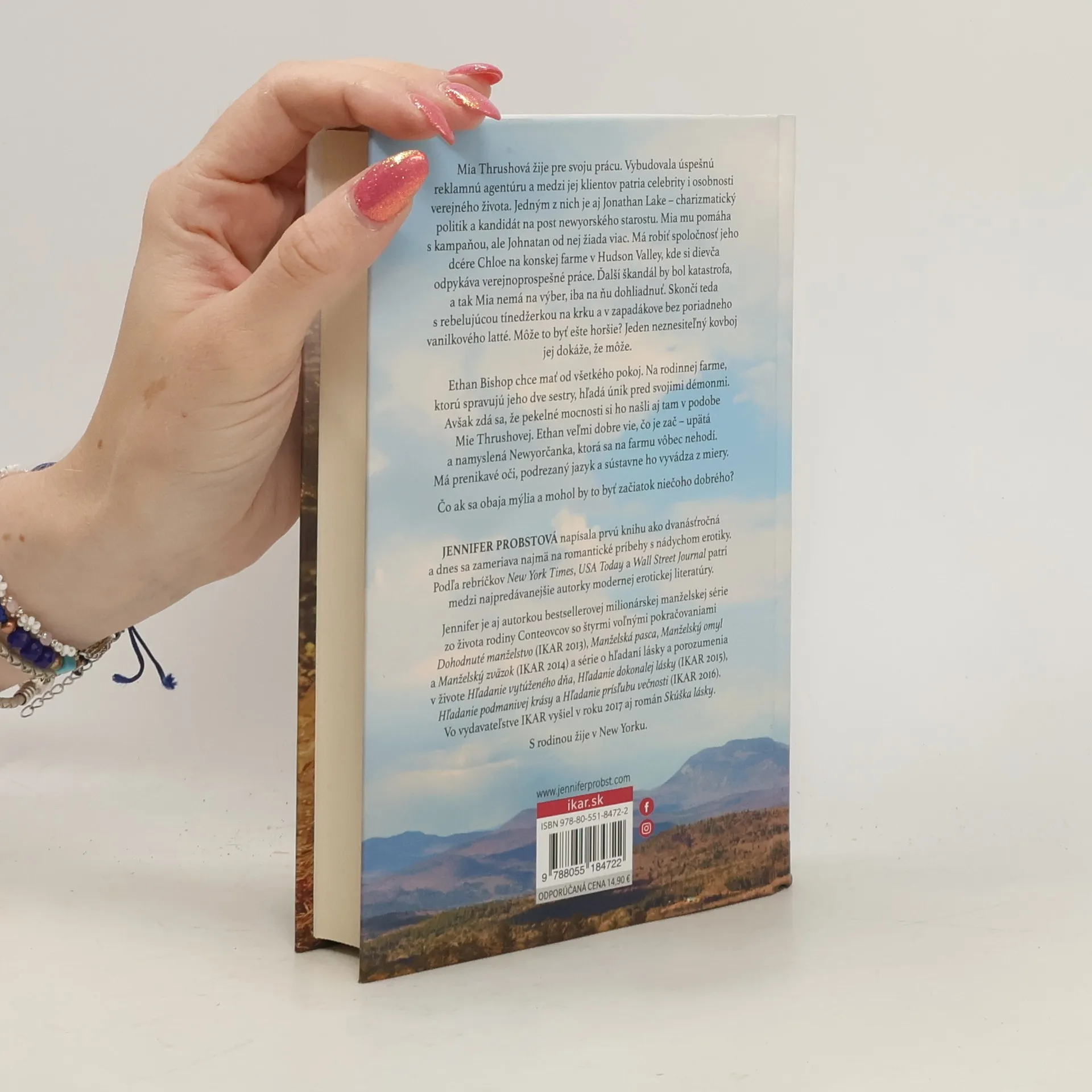 Šťastie často býva tam, kde ho nik nehľadáMia Thrushová žije pre svoju prácu. Od piky vybudovala úspešnú PR agentúru a medzi jej klientov patria celebrity i osobnosti verejného života. Jedným z nich je aj Jonathan Lake – charizmatický politik a kandidát na post newyorského starostu. Mia mu pomáha s kampaňou, ale Johnatan od nej žiada viac. Má robiť spoločnosť jeho dcére Chloe na konskej farme v Hudson Valley, kde si dievča odpykáva verejnoprospešné práce. Ďalší škandál by bol katastrofa, a tak Mia nemá na výber, iba na ňu dohliadnuť. Skončí teda s rebelujúcou tínedžerkou na krku a v zapadákove bez poriadneho vanilkového latté. Môže to byť ešte horšie? Jeden neznesiteľný kovboj jej dokáže, že môže.Ethan Bishop chce mať od všetkého pokoj. Na rodinnej farme, ktorú spravujú jeho dve sestry, hľadá únik pred vnútornými démonmi. No zdá sa, že pekelné mocnosti si ho našli aj tam v podobe Mie Thrushovej. Ethan veľmi dobre vie, čo je zač – upätá a namyslená Newyorčanka, ktorá sa na farmu vôbec nehodí. Navyše má prenikavé oči, podrezaný jazyk a sústavne ho vyvádza z miery.No čo ak sa obaja mýlia a mohol by to byť aj začiatok niečoho dobrého?