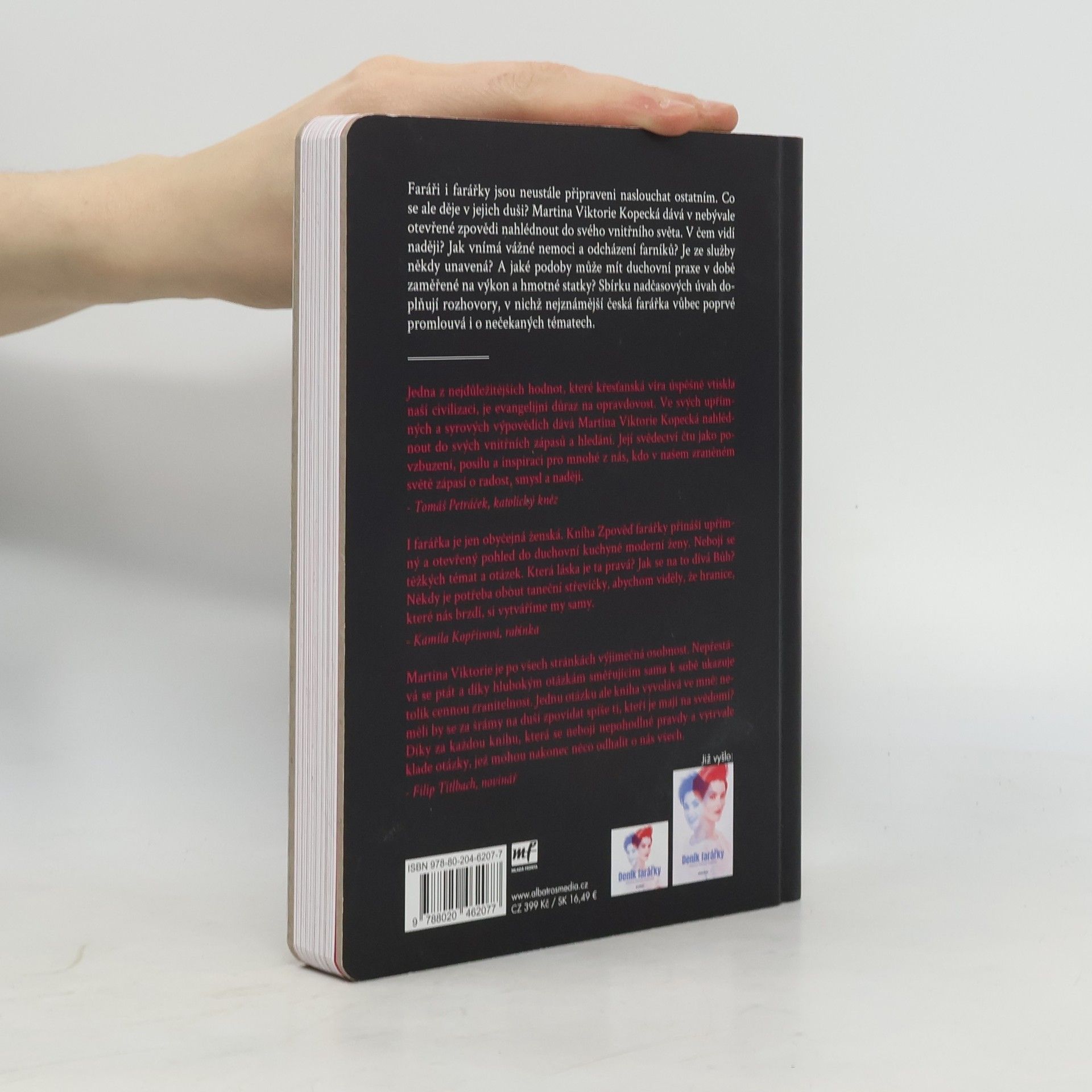 O životě farářky už jste četli. Teď se připravte na cestu do jejího nitra. Faráři i farářky jsou neustále připraveni naslouchat ostatním. Co se ale děje v jejich duši? Martina Viktorie Kopecká dává v nebývale otevřené zpovědi nahlédnout do svého vnitřního světa. Co si myslí o celibátu a založení rodiny? Jak vnímá vážné nemoci a odcházení svých farníků? Je ze služby někdy unavená? A jaké podoby může mít duchovní praxe v době zaměřené na výkon a hmotné statky? Sbírku nadčasových úvah doplňují rozhovory, v nichž nejznámější česká farářka vůbec poprvé promlouvá i o nečekaných tématech.