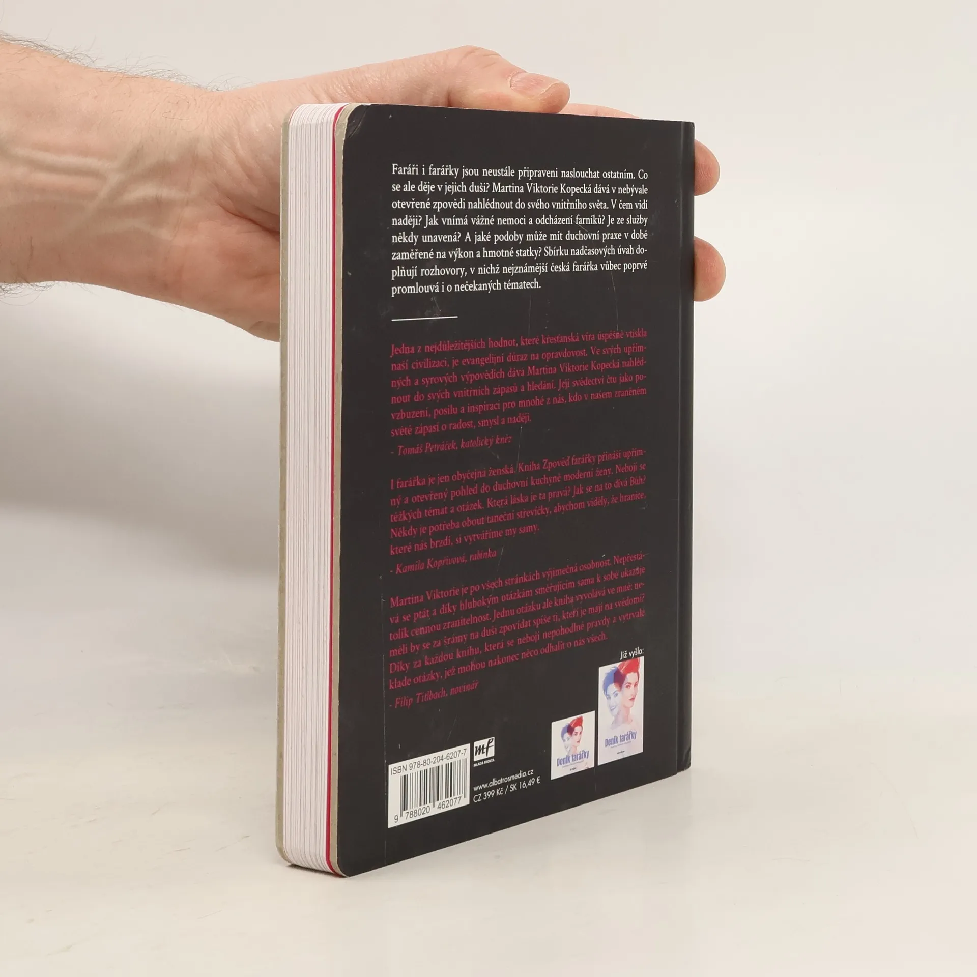 O životě farářky už jste četli. Teď se připravte na cestu do jejího nitra. Faráři i farářky jsou neustále připraveni naslouchat ostatním. Co se ale děje v jejich duši? Martina Viktorie Kopecká dává v nebývale otevřené zpovědi nahlédnout do svého vnitřního světa. Co si myslí o celibátu a založení rodiny? Jak vnímá vážné nemoci a odcházení svých farníků? Je ze služby někdy unavená? A jaké podoby může mít duchovní praxe v době zaměřené na výkon a hmotné statky? Sbírku nadčasových úvah doplňují rozhovory, v nichž nejznámější česká farářka vůbec poprvé promlouvá i o nečekaných tématech.