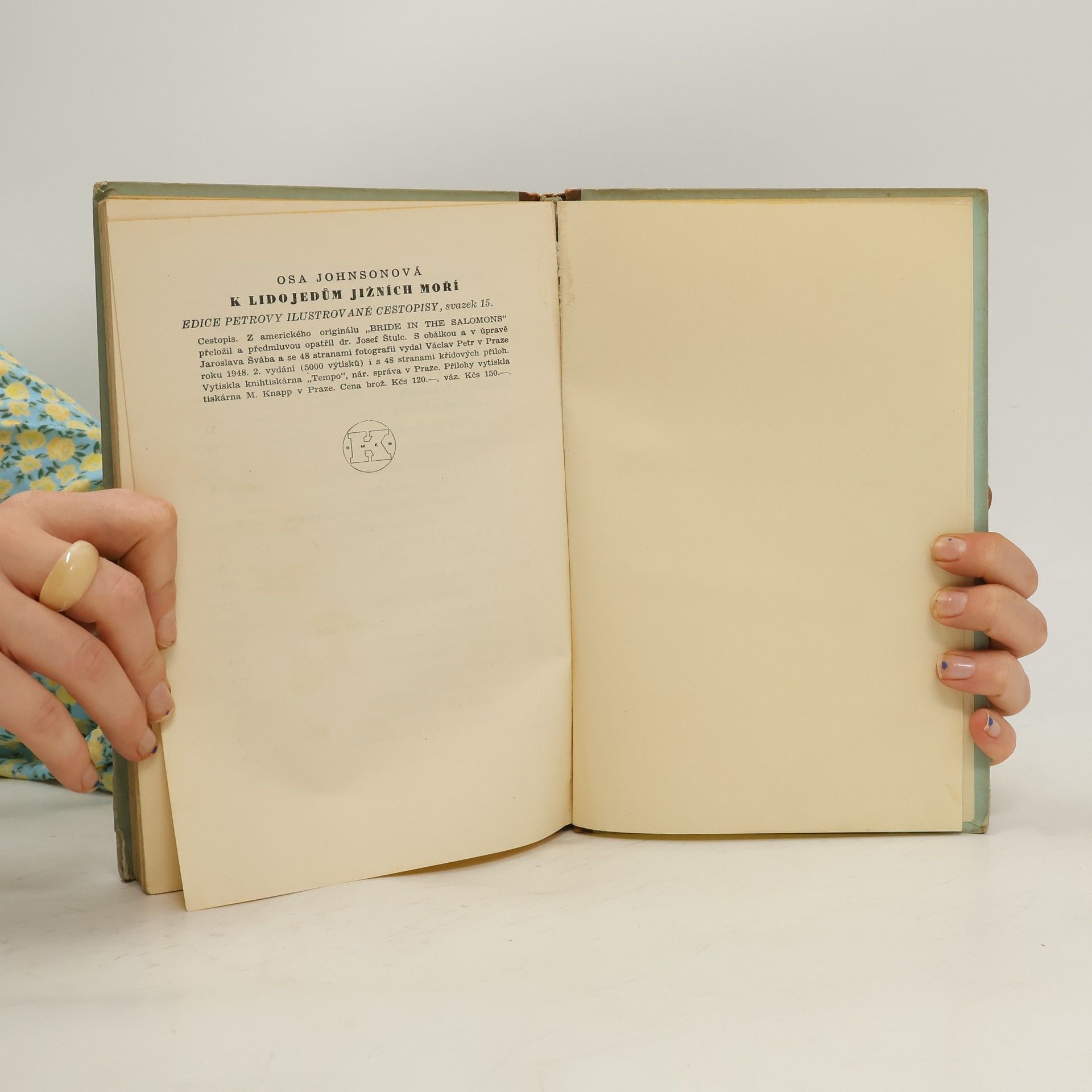 Dychtivý zájem čtenářské veřejnosti vynutil si v několika týdnech nové vydání světově proslulého cestopisu Osy Johnsonové, vdovy po proslulém Martinu Johnsonovi, s nímž společně nejednou udivila svět odvážnými a nebezpečnými výpravami. Popularitu této knize získala zejména válka, vedená v končinách, které cestovatelka popisuje, a není divu, že tento cestopis vedl za války po měsíce listinu t. zv. bestsellers, t. j. nejprodávanějších a nejúspěšnějších knih v USA. Cestopis Osy Johnsonové byl napsán teprve po smrti jejího manžela, avšak je věnován popisu ještě společné cesty, kterou tento proslulý cestovatelský pár podnikl půl roku po sňatku do Jižních moří, s úmyslem zachytit filmovou kamerou život lidojedů. Český čtenář podívá se tak okouzlen do končin, o nichž opravdu bude jen slýchat a s povděkem se pohrouží do vyprávění o světě, kde život pulsuje ve svých nejpřírodnějších a nejprimitivnějších formách. 48 stran křídových příloh. 2. vydání
