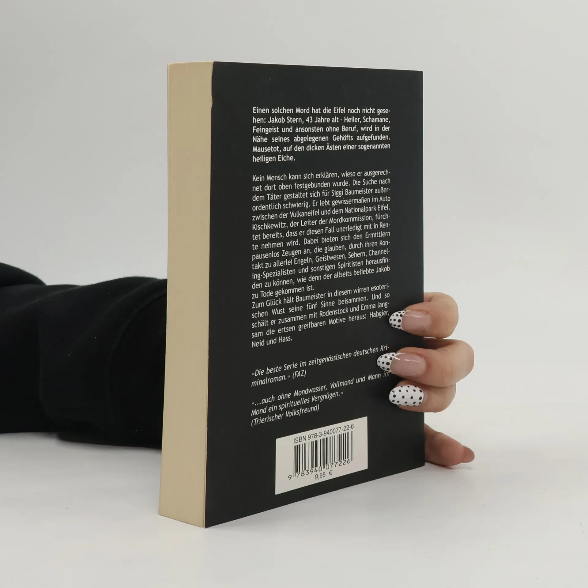 Einen solchen Mord hat die Eifel noch nicht gesehen: Jakob Stern, 43 Jahre alt – Heiler, Schamane, Feingeist und ansonsten ohne Beruf, wird in der Nähe seines abgelegenen Gehöfts aufgefunden. Mausetot, auf den dicken Ästen einer sogenannten heiligen Eiche. Kein Mensch kann sich erklären, wieso er ausgerechnet dort oben festgebunden wurde. Die Suche nach dem Täter gestaltet sich für Siggi Baumeister außerordentlich schwierig. Er lebt gewissermaßen im Auto zwischen der Vulkaneifel und dem Nationalpark Eifel. Kischkewitz, der Leiter der Mordkommission, fürchtet bereits, dass er diesen Fall unerledigt mit in Rente nehmen wird. Dabei bieten sich den Ermittlern pausenlos Zeugen an, die glauben, durch ihren Kontakt zu allerlei Engeln, Geistwesen, Sehern, Channeling-Spezialisten und sonstigen Spiritisten herausfinden zu können, wie denn der allseits beliebte Jakob zu Tode gekommen ist. Zum Glück hält Baumeister in diesem wirren esoterischen Wust seine fünf Sinne beisammen. Und so schält er zusammen mit Rodenstock und Emma langsam die ersten greifbaren Motive heraus: Habgier, Neid und Hass.