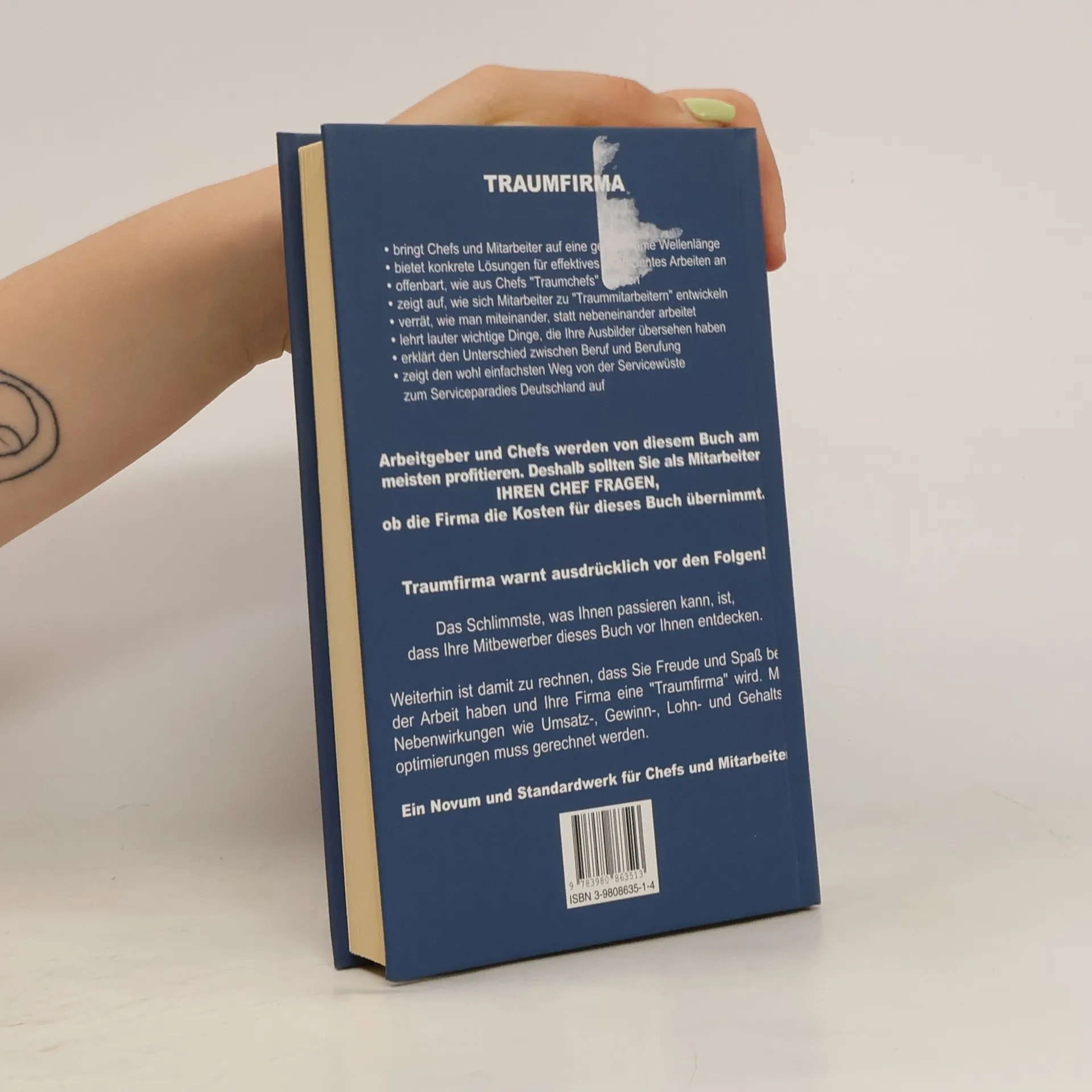 TRAUMFIRMAbringt Chefs und Mitarbeiter auf eine gemeinsame Wellenlänge, bietet konkrete Lösungen für effektives und effizientes Arbeiten an, offenbart, wie aus Chefs „Traumchefs“ werden, zeigt auf, wie sich Mitarbeiter zu „Traummitarbeitern“ entwickeln, verrät, wie man miteinander, statt nebeneinander arbeitet, lehrt lauter wichtige Dinge, die Ihre Ausbilder übersehen haben, erklärt den Unterschied zwischen Beruf und Berufung, zeigt den wohl einfachsten Weg von der Servicewüste zum Serviceparadies Deutschland auf