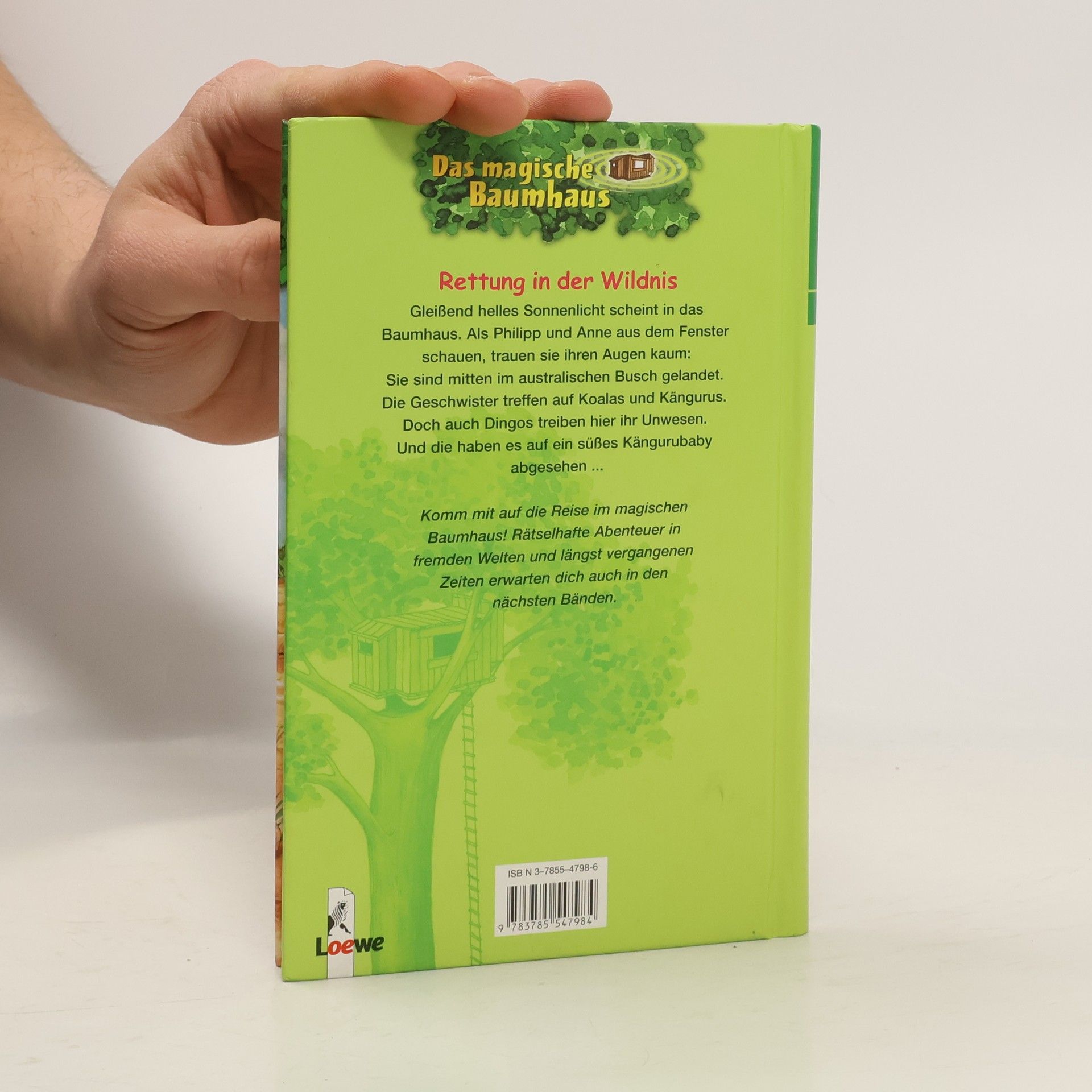 Das Buch ist bei deiner Buchhandlung vor Ort und bei vielen Online-Buchshops erhältlich! + Bücher, die Kinder gerne lesen wollen + Beliebte Themen: Abenteuer, Tiere und fremde Länder + Hochwertiges Hardcover + Mit vielen Illustrationen + Bereits über 10 Millionen verkaufte Bücher der Baumhaus-Reihe + Ausgewogenes Text-Bild-Verhältnis + Große Schrift + Kurze Kapitel + Gleißend helles Sonnenlicht scheint in das Baumhaus. Als Philipp und Anne aus dem Fenster schauen, trauen sie ihren Augen kaum: Sie sind mitten im australischen Busch gelandet. Die Geschwister treffen auf Koalas und Kängurus. Doch auch Dingos treiben hier ihr Unwesen. Und die haben es auf ein süßes Kängurubaby abgesehen ... Komm mit auf die Reise im magischen Baumhaus! Rätselhafte Abenteuer in fremden Welten und längst vergangenen Zeiten erwarten dich auch in den nächsten Bänden. Die beliebte Kinderbuch-Reihe von Bestsellerautorin Mary Pope Osborne! Die Geschwister Anne und Philipp reisen mit dem magischen Baumhaus durch die Zeit. Sie erleben spannende Abenteuer, entdecken ferne Länder und lernen viele berühmte Persönlichkeiten kennen. Mehr Infos zur Reihe und tolle Extras unter: www. MagischesBaumhaus. de