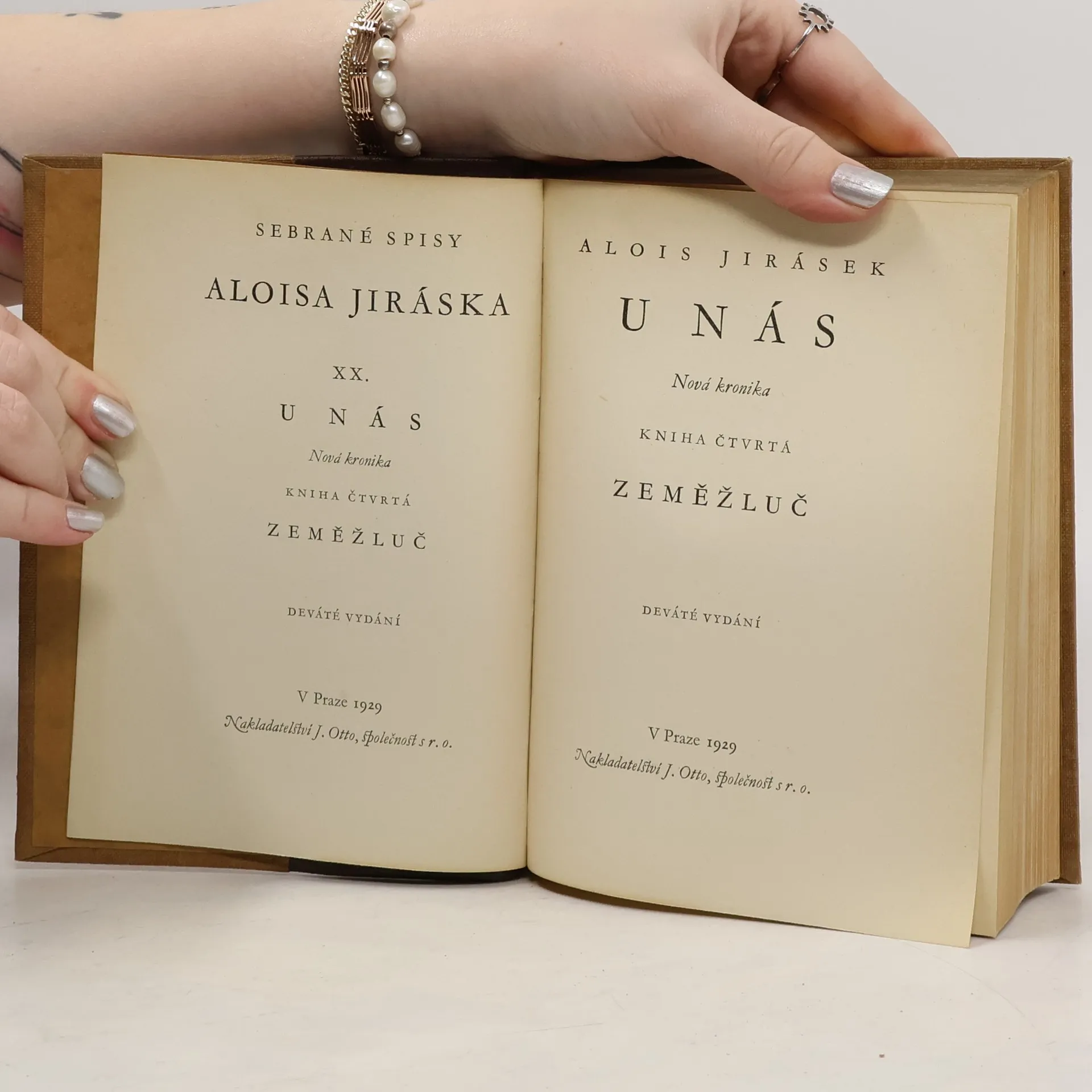Alois Jirásek: U NÁS. Románová čtyřdílná kronika. Kniha čtvrtá - ZEMĚŽLUČ. Psáno roku 1901 - 1902. Druhé vydání v roce 1927. Nakladatelství J. Otto, spol. s r.o. v Praze, edice: Nová kronika. Tiskem České grafické unie, a.s. v Praze. Vazba celoplátěná nakladatelská s barevným popisem na hřbetu, stužková záložka.