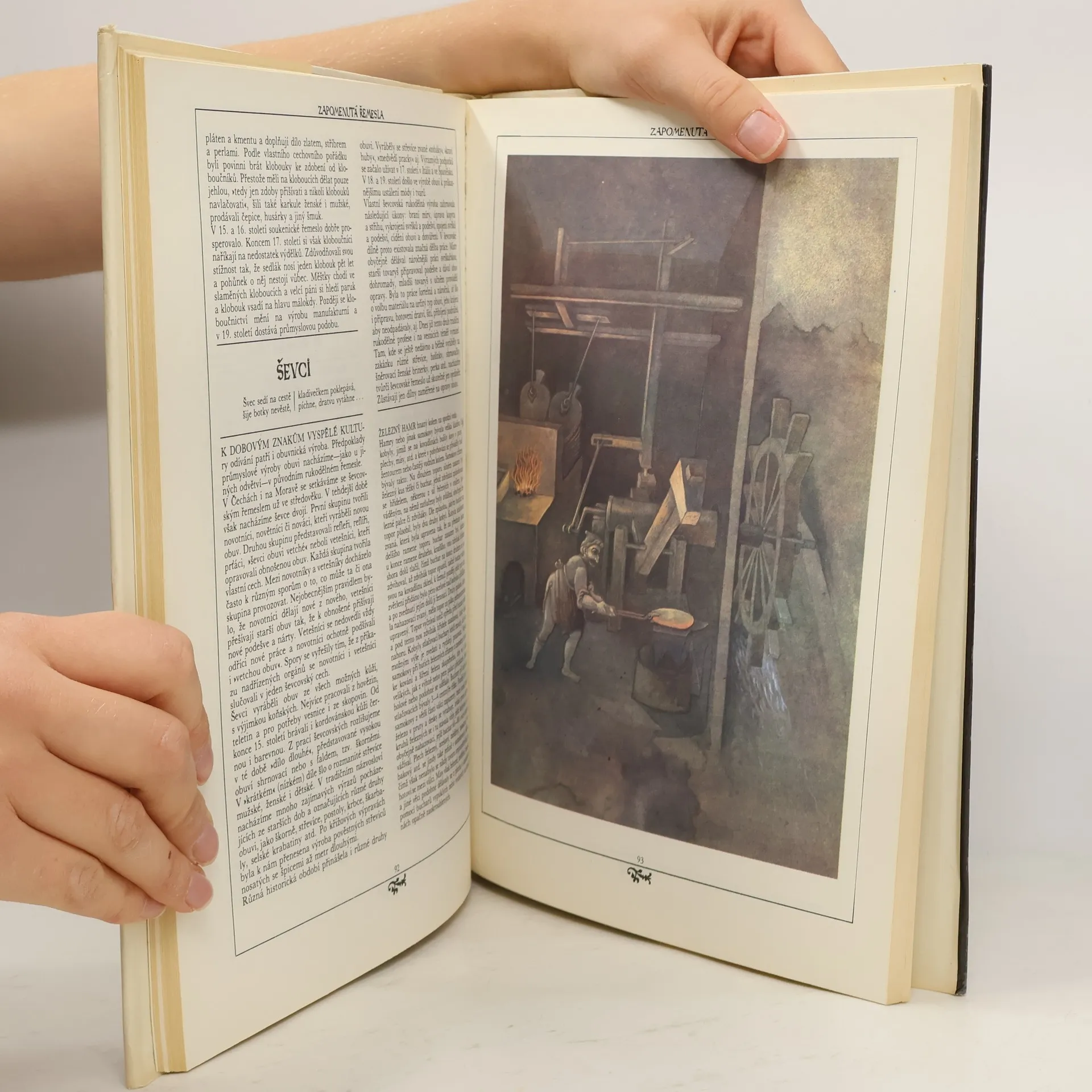 Nahlédnutí do zmizelého světa platnéřů, pasířů, krumpléřů, valchářů, bradýřů, lazebníků, truplařů, kameníků, štítařů, pernikářů, horologistů, konvářů, mistrů, tovaryšů a jiných "oudů" poctivých, učinlivých a ctnostným řemesel cechovních. Kniha hovoří o různých oborech lidské rukodělné činnosti, o materiálech, o funkční a výtvarné hodnotě vyráběných předmětů, o harmonii mezi jejich účelem, tvarem, barevností a zdobností, prostě o přírodě, lidech a věcech, o tvořivé práci, která prolínala a prolíná celým životem člověka. Kapitoly: Lidé a věci. Nejen chlebem živ je člověk: Lidé pracující na púde, Pastýři, slouhové, ovčáci, Řezníci, Uzenáři, Mlynáři, Pekaři, Pernikáři, Dílo medu, brtníci, včelaři. Starosti, jak a co na sebe: Příprava příze a její zpracování, Tkalci díla rozličného, Vývoj tklacovské techniky, Tkalcovská pohádka, Vazby tkanin, Zánik tkalcovských cechú, Běliči, barvíři, mandlíři, Tkalci vlny, Soukeníci, Mykači, Krampléři, Valcháři, Česači vlny, Postřihovači, Krejčí, Krumpléři a vyšívačky, Kloboučníci a šmukýři, Ševci. Dřevěný svět: Tesaři, Sekerníci, Truhláři, Koláři. Lidé světem jedoucí a jdoucí: Formani, Vandrovní tovariši, Světem jdoucí. Hrst řemesel nakonec: Malíři a iluminátoři, Cihláři, Hodináři, Zvonaři, Konváři, Zedníci a kameníci, Lékaři, Lazebníci a holiči. Malý slovník řemesel a lidských činností, Dvakrát měř a jednou řež, Věcný rejstřík. Prémie Členské knižnice (neprodejná)