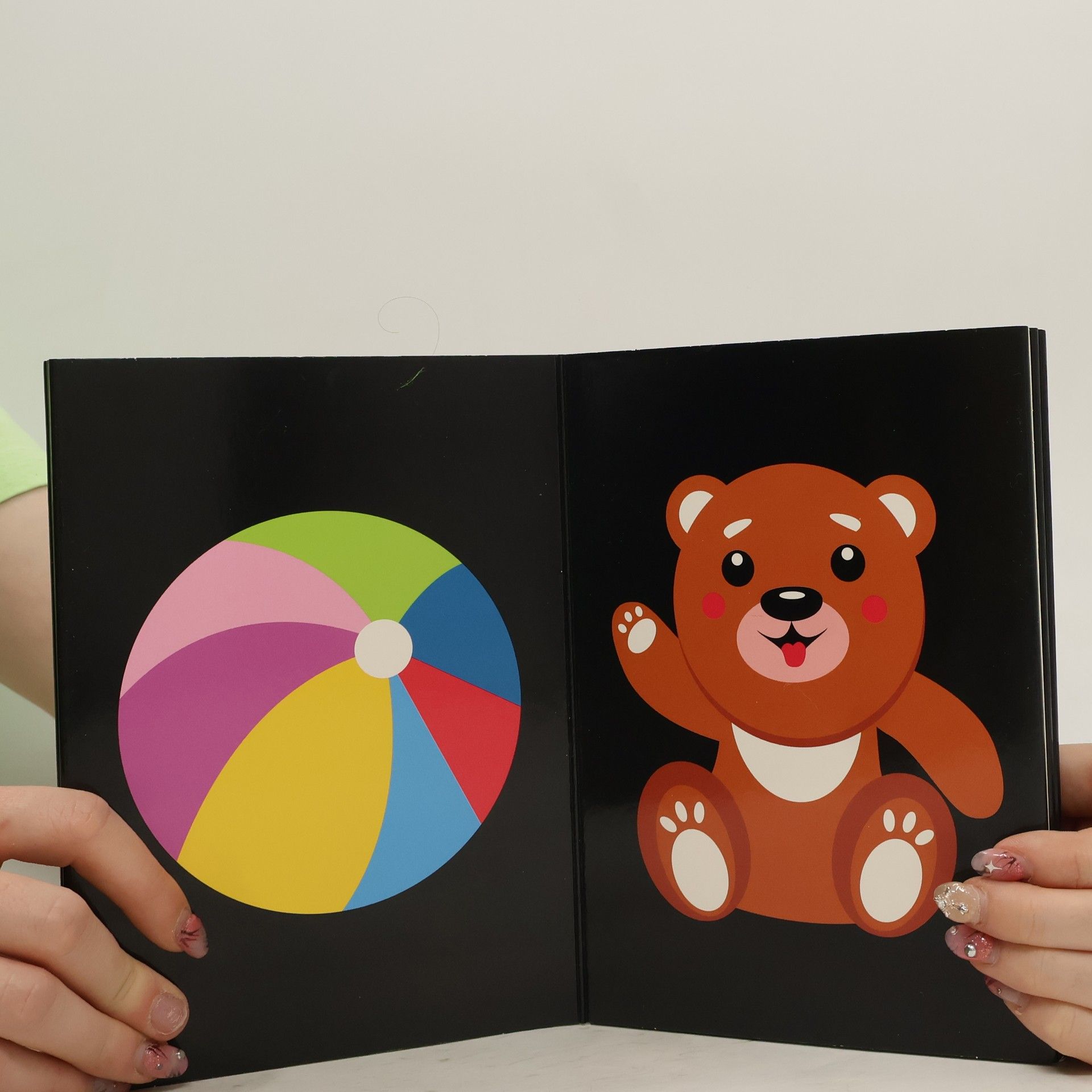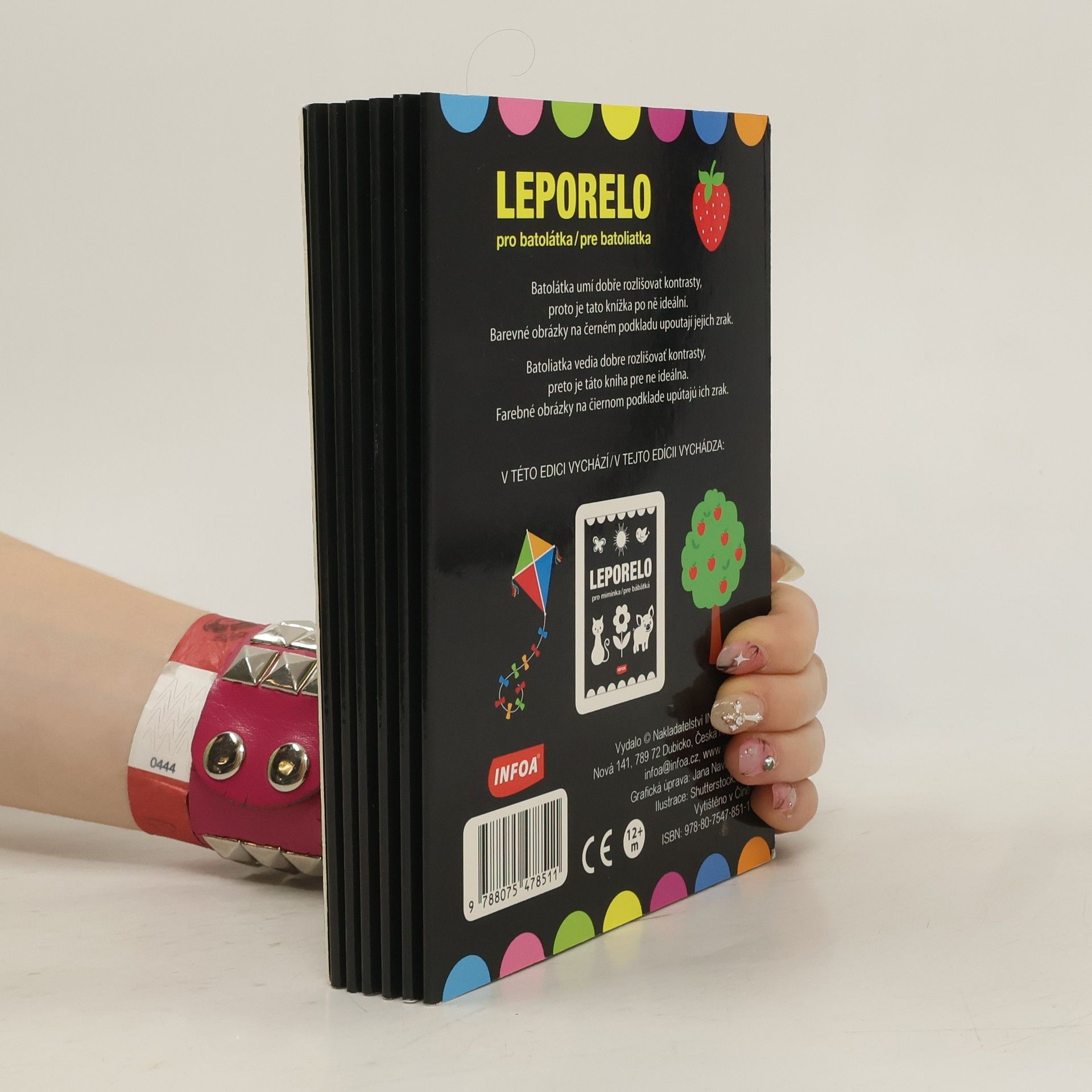 Batolátka umí dobře rozlišovat kontrasty, proto je tato knížka po ně ideální. Barevné obrázky na černém podkladu upoutají jejich zrak.