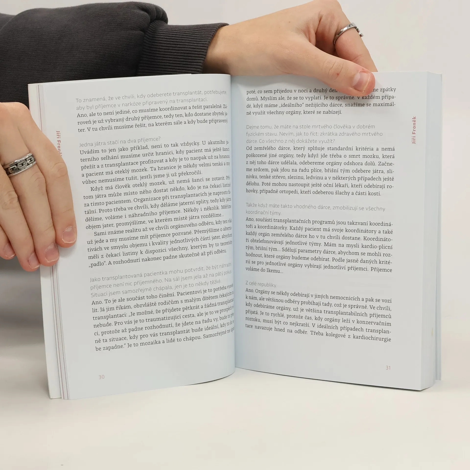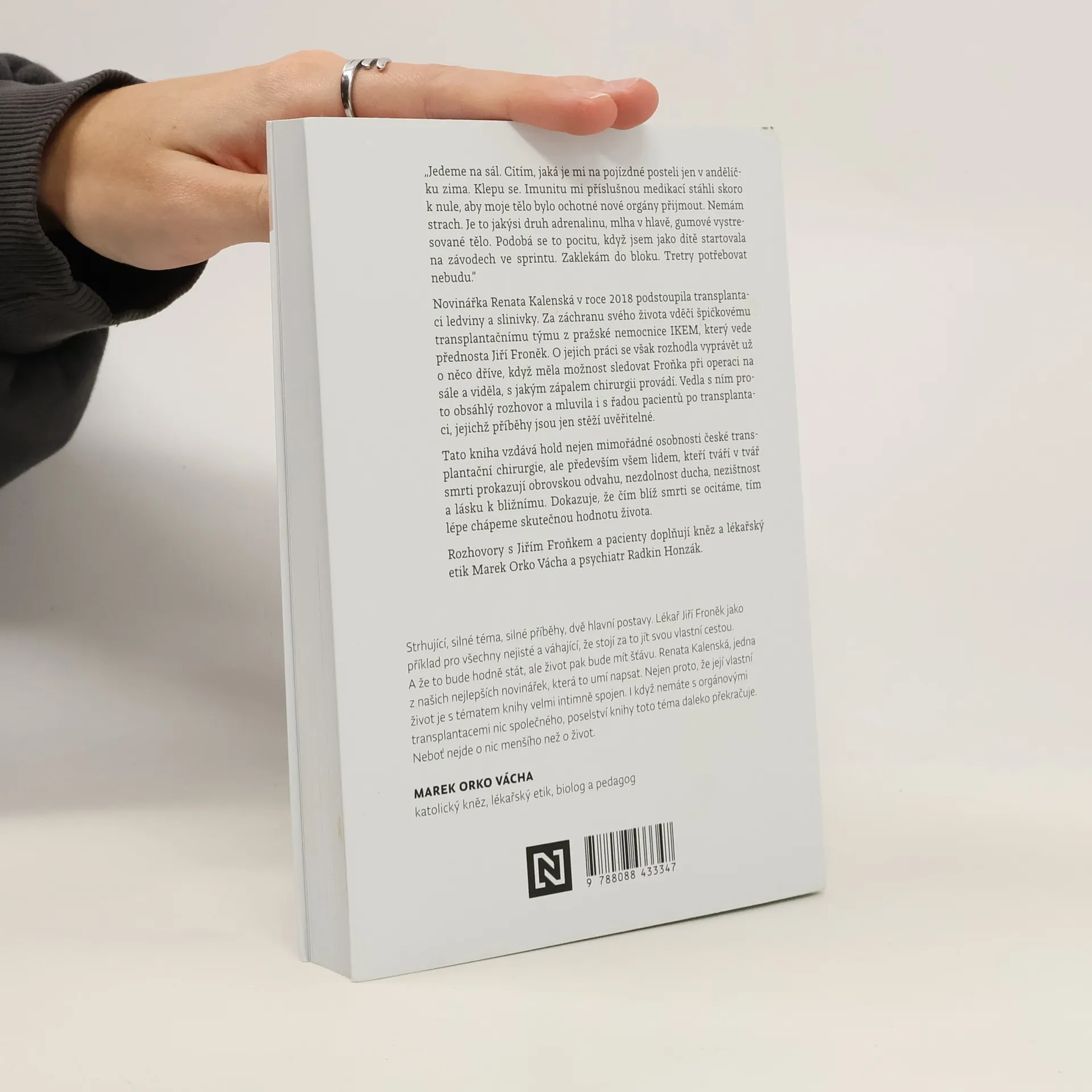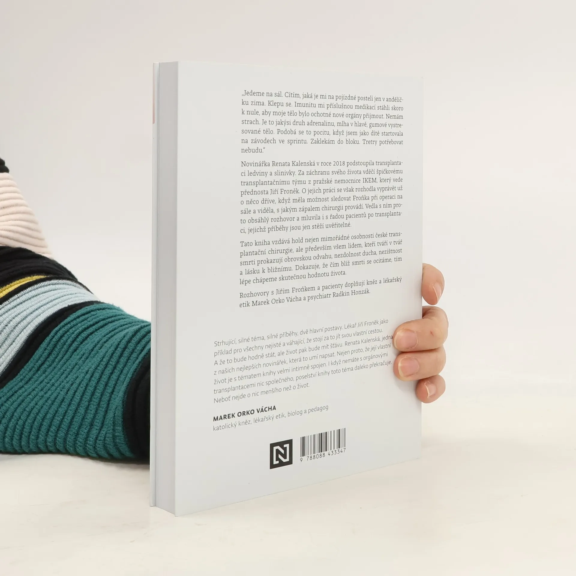 Příběhy české transplantační chirurgie. „Jedeme na sál. Cítím, jaká je mi na pojízdné posteli jen v andělíčku zima. Klepu se. Imunitu mi příslušnou medikací stáhli skoro k nule, aby moje tělo bylo ochotné nové orgány přijmout. Nemám strach. Je to jakýsi druh adrenalinu, mlha v hlavě, gumové vystresované tělo. Podobá se to pocitu, když jsem jako dítě startovala na závodech ve sprintu. Zaklekám do bloku. Tretry potřebovat nebudu.“Novinářka Renata Kalenská v roce 2018 podstoupila transplantaci ledviny a slinivky. Za záchranu svého života vděčí špičkovému transplantačnímu týmu z pražské nemocnice IKEM, který vede přednosta Jiří Froněk. O jejich práci se však rozhodla vyprávět už o něco dříve, když měla možnost sledovat Froňka při operaci na sále a viděla, s jakým zápalem chirurgii provádí. Vedla s ním proto obsáhlý rozhovor a mluvila také s řadou pacientů po transplantaci, jejichž příběhy jsou jen stěží uvěřitelné.Tato kniha vzdává hold nejen mimořádné osobnosti české transplantační chirurgie, ale především všem lidem, kteří tváří v tvář smrti prokazují obrovskou odvahu, nezdolnost ducha, nezištnost a lásku k bližnímu. Dokazuje, že čím blíž smrti se ocitáme, tím lépe chápeme skutečnou hodnotu života.Rozhovory s Jiřím Froňkem a pacienty doplňují kněz a lékařský etik Marek Orko Vácha a psychiatr Radkin Honzák.