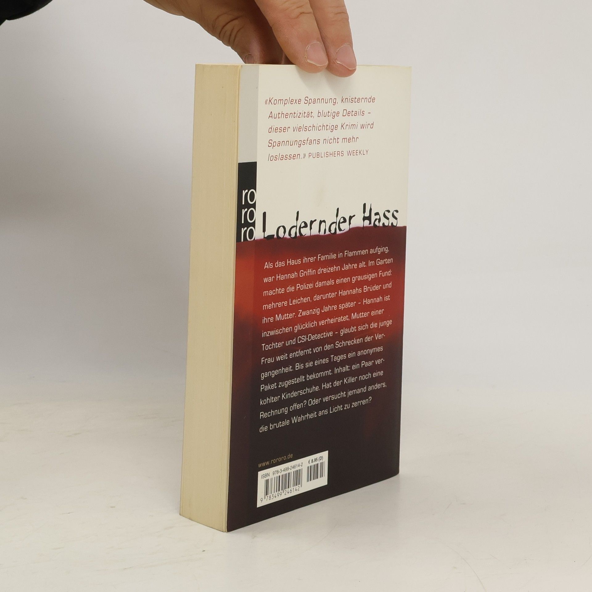Lodernder Hass Als das Haus ihrer Familie in Flammen aufging, war Hannah Griffin dreizehn Jahre alt. Im Garten machte die Polizei damals einen grausigen Fund: mehrere Leichen, darunter Hannahs Brüder und ihre Mutter. Zwanzig Jahre später – Hannah ist inzwischen glücklich verheiratet, Mutter einer Tochter und CSI-Detective – glaubt sich die junge Frau weit entfernt von den Schrecken der Vergangenheit. Bis sie eines Tages ein anonymes Paket zugestellt bekommt. Inhalt: ein Paar verkohlter Kinderschuhe. Hat der Killer noch eine Rechnung offen? Oder versucht jemand anders die brutale Wahrheit ans Licht zu zerren? “Komplexe Spannung, knisternde Authentizität, blutige Details – Dieser vielschichtige Krimi wird Spannungsfans nicht mehr loslassen.” (Publishers Weekly)