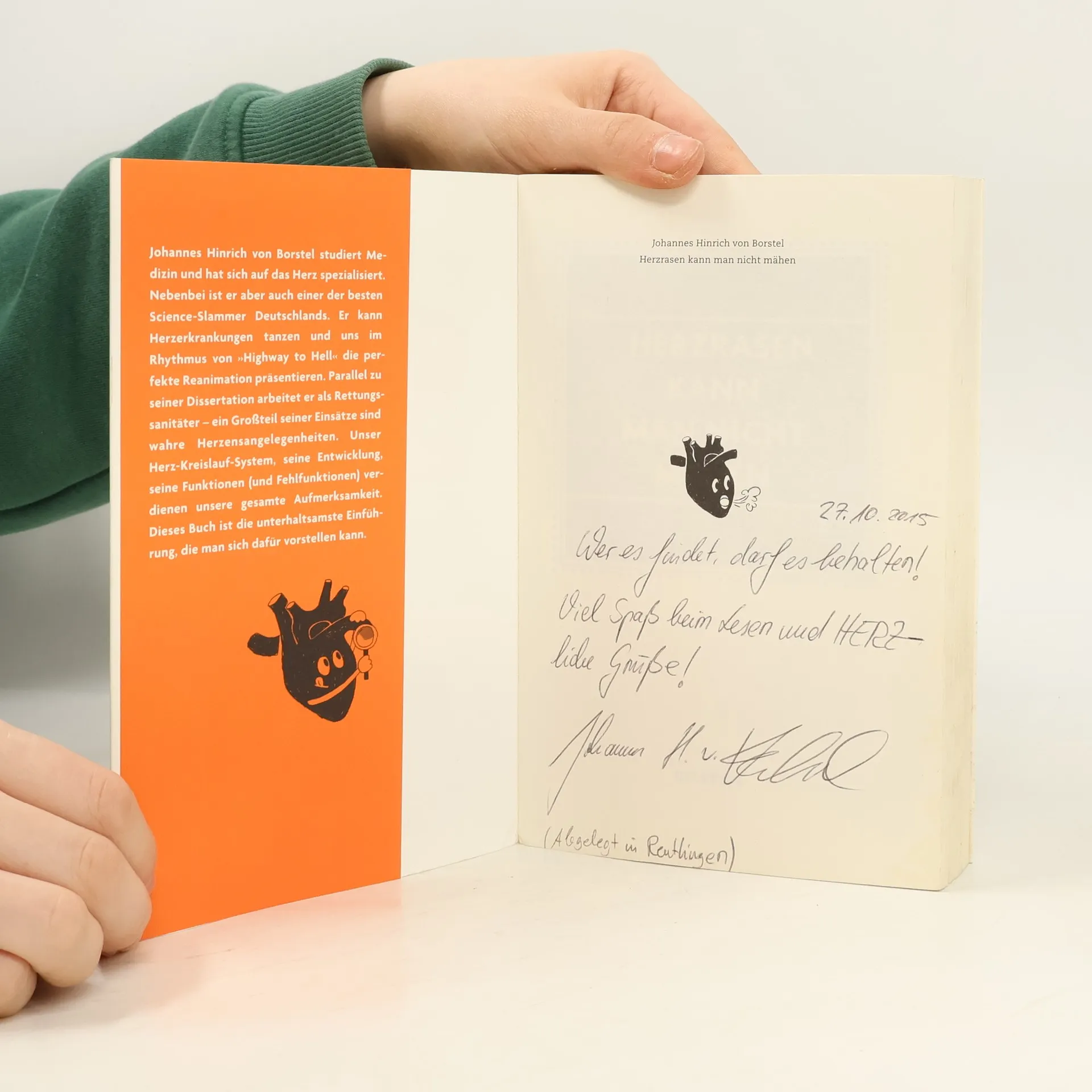 Johannes Hinrich von Borstel studiert Medizin und hat sich auf das Herz spezialisiert. Nebenbei ist er aber auch einer der besten Science-Slammer Deutschlands. Er kann Herzerkrankungen tanzen und uns im Rhythmus von »Highway to Hell« die perfekte Reanimation präsentieren. Parallel zu seiner Dissertation arbeitet er als Rettungssanitäter – ein Großteil seiner Einsätze sind wahre Herzensangelegenheiten. Anhand vieler Geschichten aus der Praxis vermittelt er uns in diesem Buch seine Begeisterung für das Wunderwerk des Herz-Kreislauf-Systems. Er beschreibt, wie wir unserem Herzen etwas Gutes tun und uns damit fit und gesund halten können, erzählt vom „Broken-Heart-Syndrom“ – von Menschen, die tatsächlich an einem gebrochenen Herzen sterben – und erklärt, wie Sex uns vor Arteriosklerose schützen kann.
