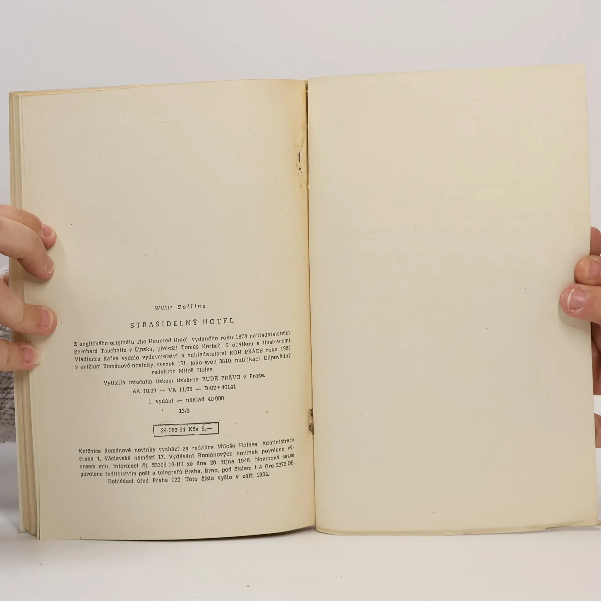 Kriminální příběh z prostředí viktoriánské společnosti. Případ tajemné vraždy je líčen tak poutavě, že mu neubralo nic na účinnosti ani téměř devadesát let, kdy román poprvé vyšel, ani konkurence moderních detektivek. Z anglického originálu The Haunted Hotel, vydaného roku 1878 nakladatelstvím Bernard Tauchnitz v Lipsku přeložil Tomáš Korbař. S obálkou a ilustracemi Vladimíra Kafky vydalo vydavatelství a nakladatelství ROH PRÁCE roku 1964 v knižnici Románové novinky, svazek 151. 1. vydání.