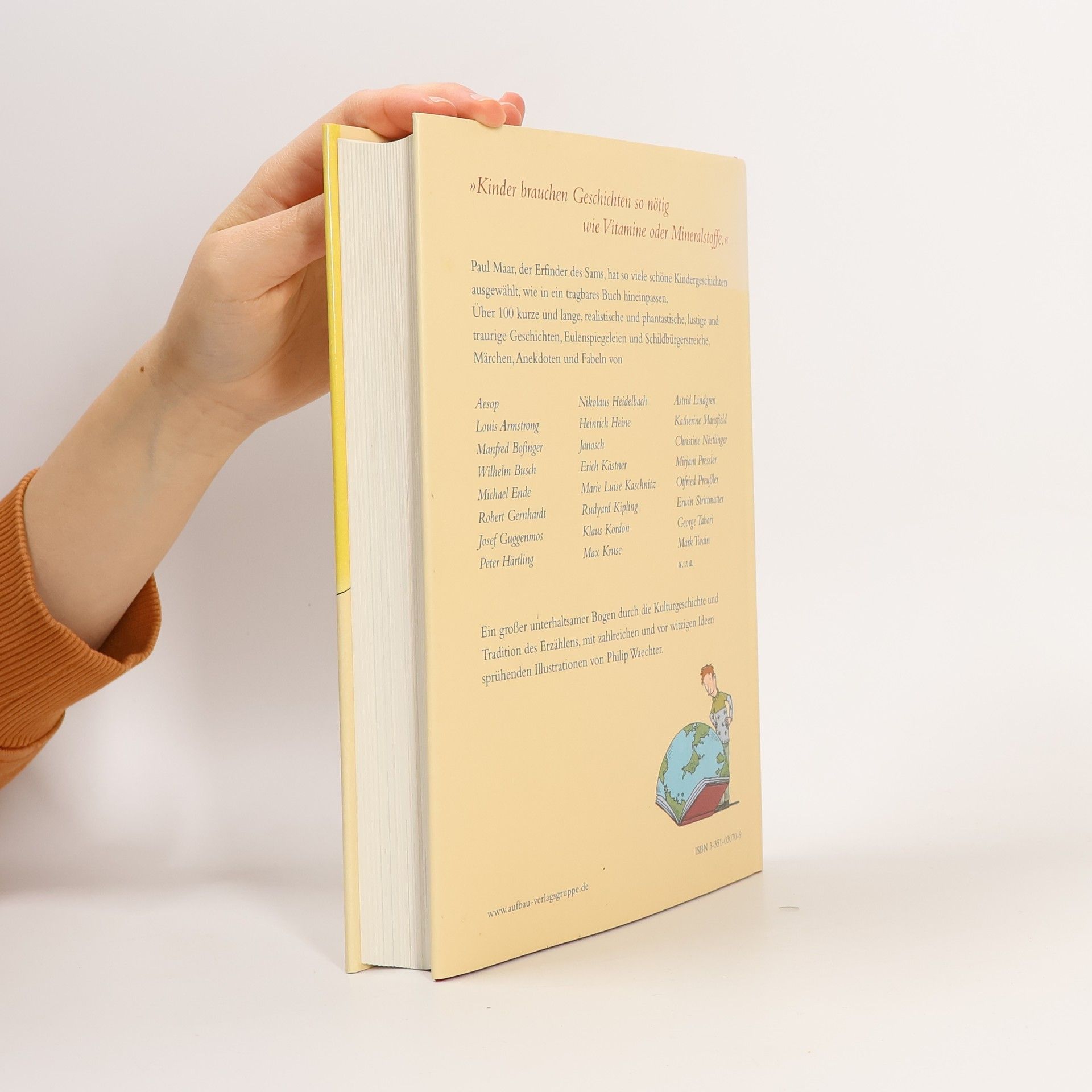 „Kinder brauchen Geschichten so nötig wie Vitamine oder Mineralstoffe.“ Paul Maar, der Erfinder des Sams, hat so viele schöne Kindergeschichten ausgewählt, wie in ein tragbares Buch hineinpassen. Über 100 kurze und lange, realistische und phantastische, lustige und traurige Geschichten, Eulenspiegeleien und Schildbürgerstreiche, Märchen, Anekdoten und Fabeln von Aesop, Nikolaus Heidelbach, Astrid Lindgren, Louis Armstrong, Heinrich Heine, Katherine Mansfield, Manfred Bofinger, Janosch, Christine Nöstlinger, Wilhelm Busch, Erich Kästner, x09Mirjam Pressler, Michael Ende, Marie Luise Kaschnitz x09, Otfried Preußler, Robert Gernhardt, Rudyard Kipling, Erwin Strittmatter, Josef Guggenmos, Klaus Kordon, George Tabori, Peter Härtling, Max Kruse, Mark Twain x09u. v. a. Ein großer unterhaltsamer Bogen durch die Kulturgeschichte und Tradition des Erzählens, mit zahlreichen und vor witzigen Ideen sprühenden Illustrationen von Philip Waechter.