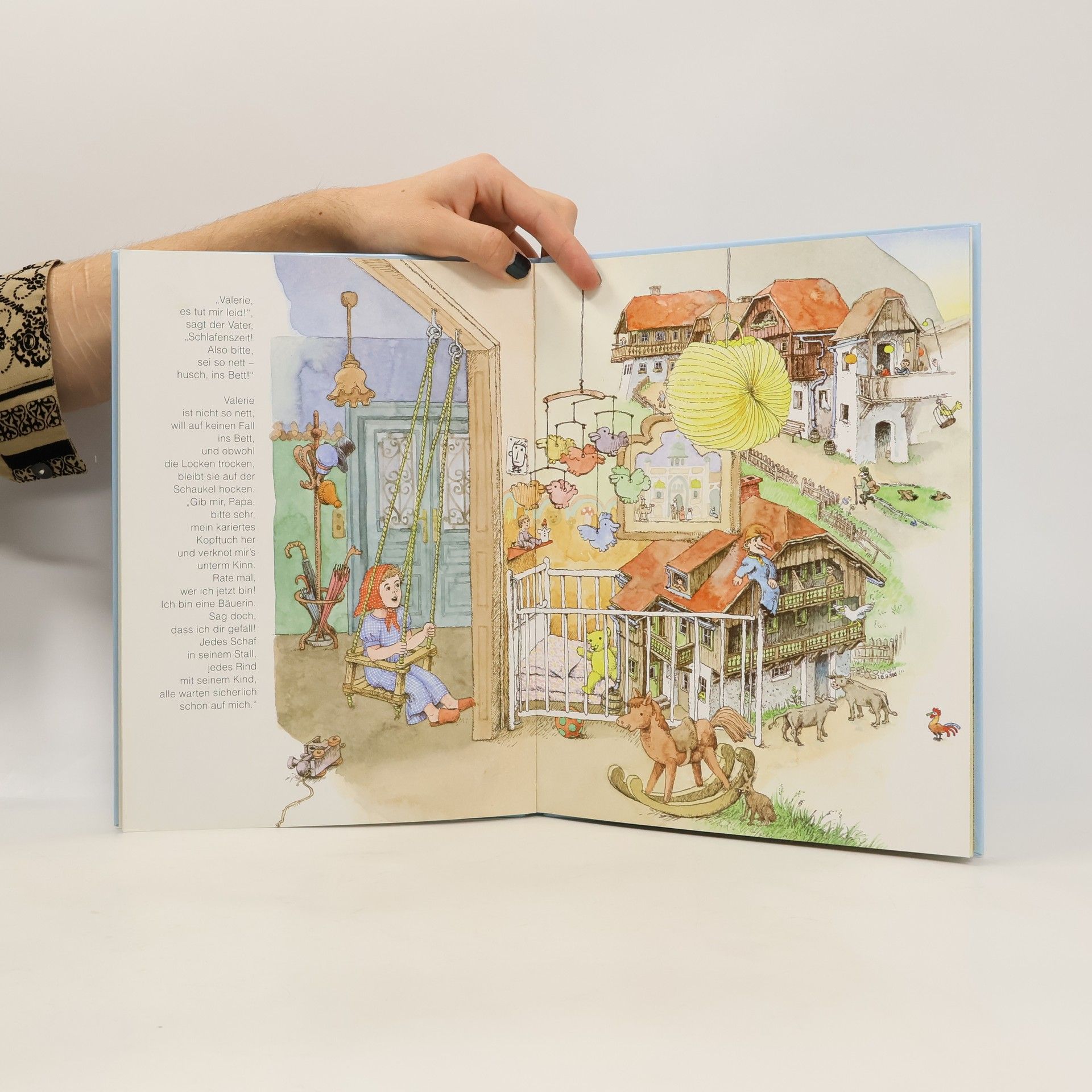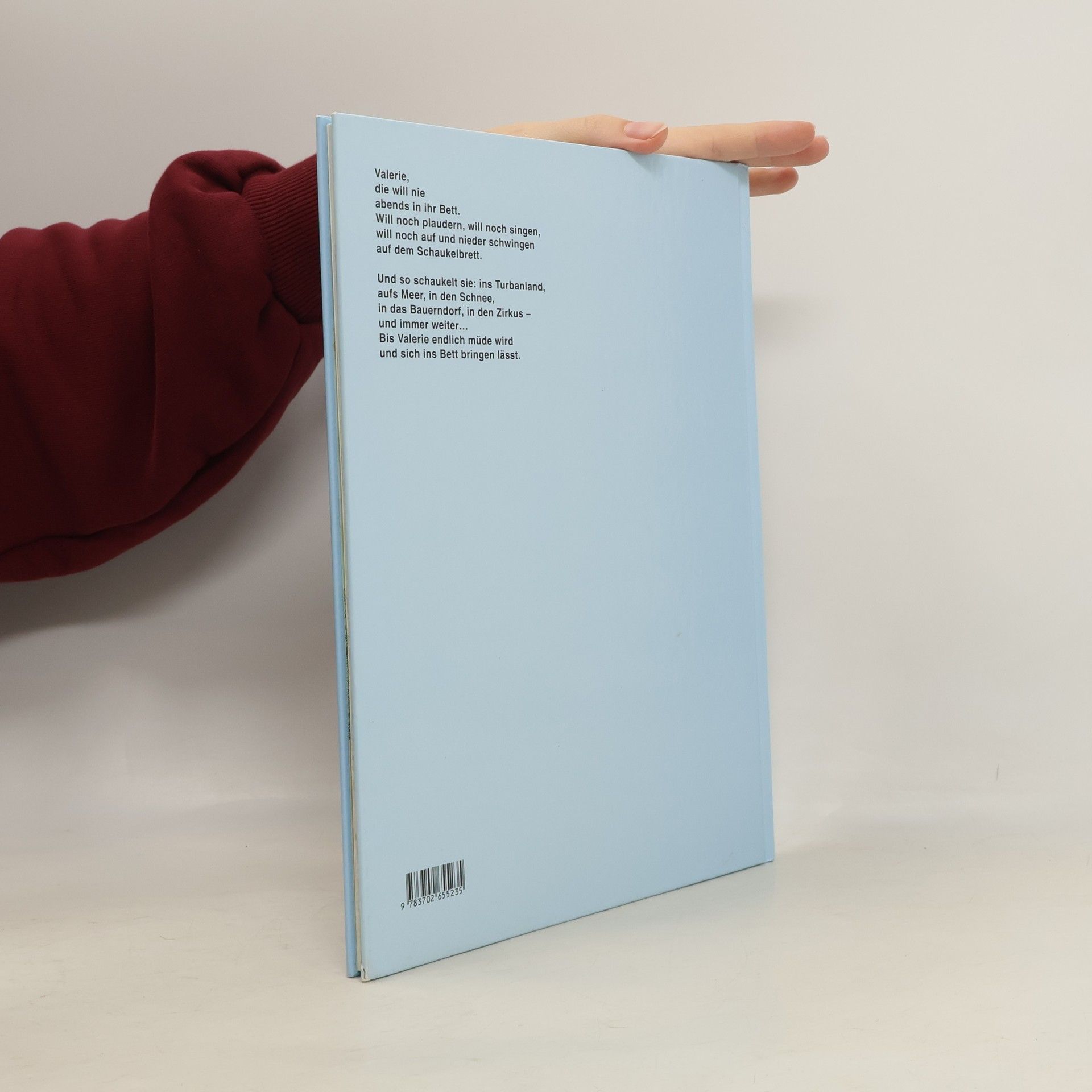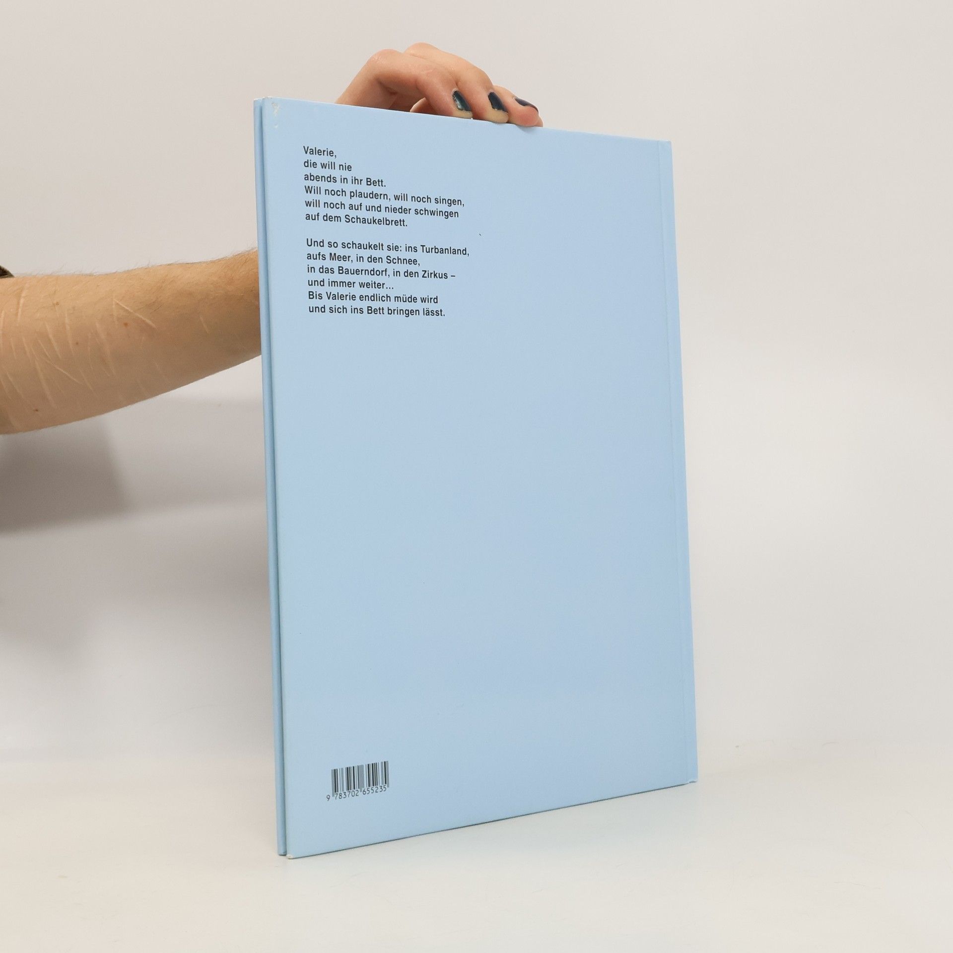 Valerie will noch nicht ins Bett. Sie will lieber noch schaukeln, und immer, wenn sie hin und her schwingt, ist sie schon mitten in einem Abenteuer: Sie reist ins Turbanland, fährt auf einem Schiff über den Ozean, saust mit dem Schlitten ins Tal und lässt als Zirkusdirektorin Bären aufmarschieren und mit Bällen jonglieren – bis sie langsam müde wird.